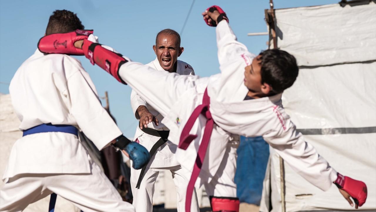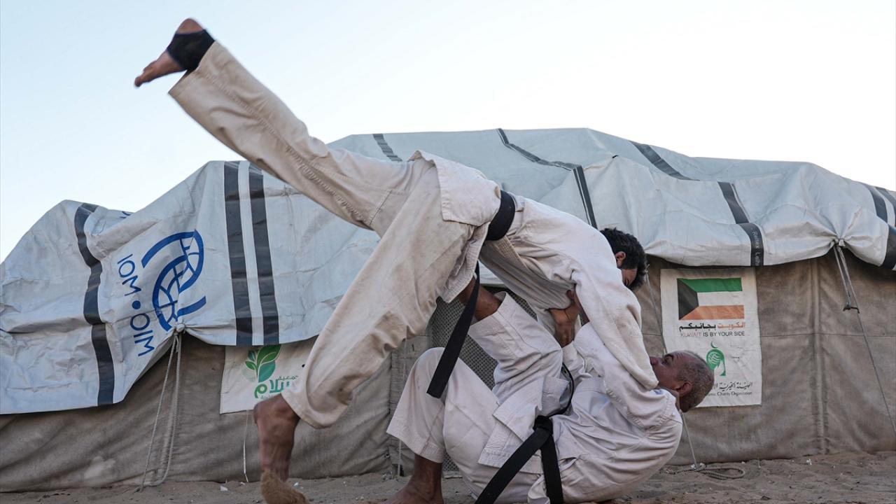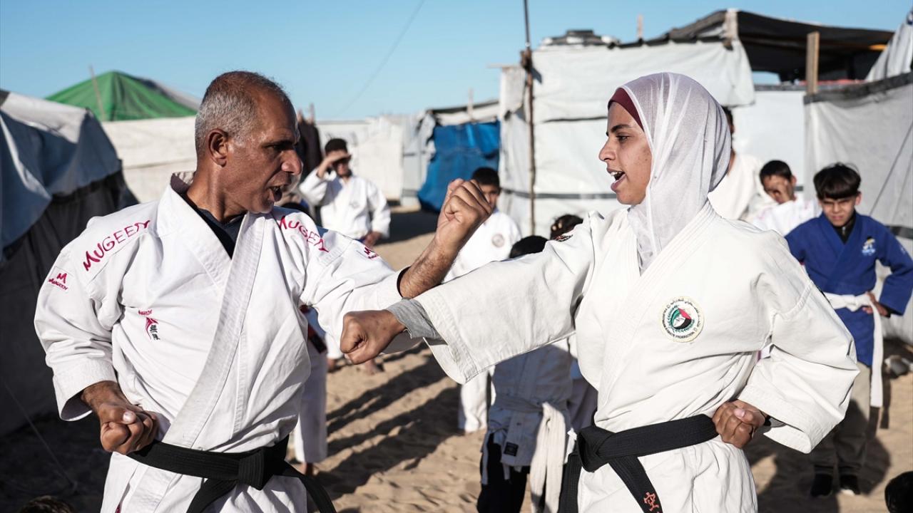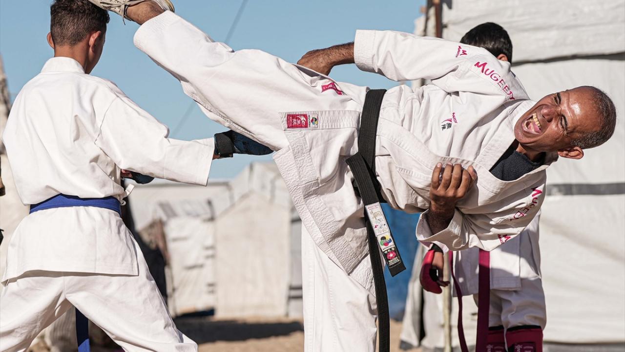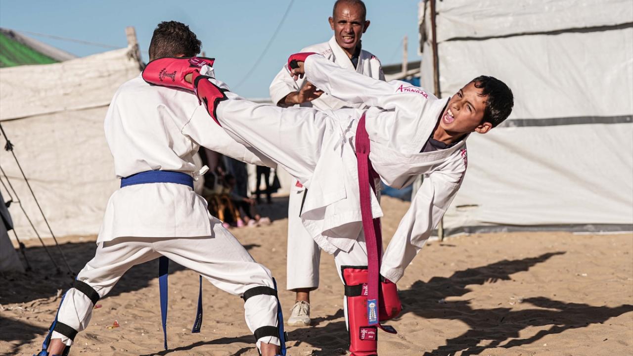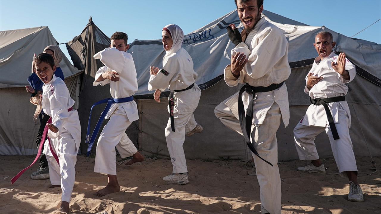 İsrail saldırıları nedeniyle Gazze Şeridi’nin Refah kentinden Han Yunus’a göç etmek zorunda kalan Filistinli karate antrenörü Halil Şakliye, çadır kamptaki tüm zorluklara rağmen çocuklara spor bilincini aşılamayı sürdürüyor.