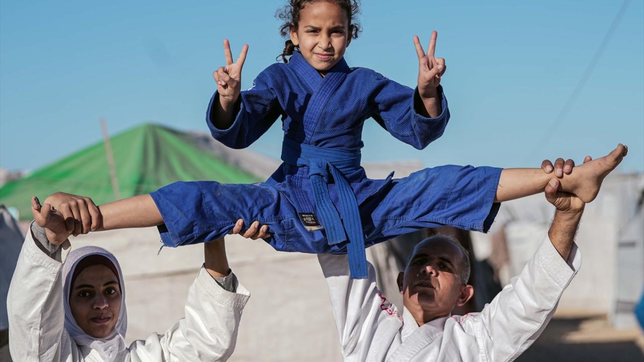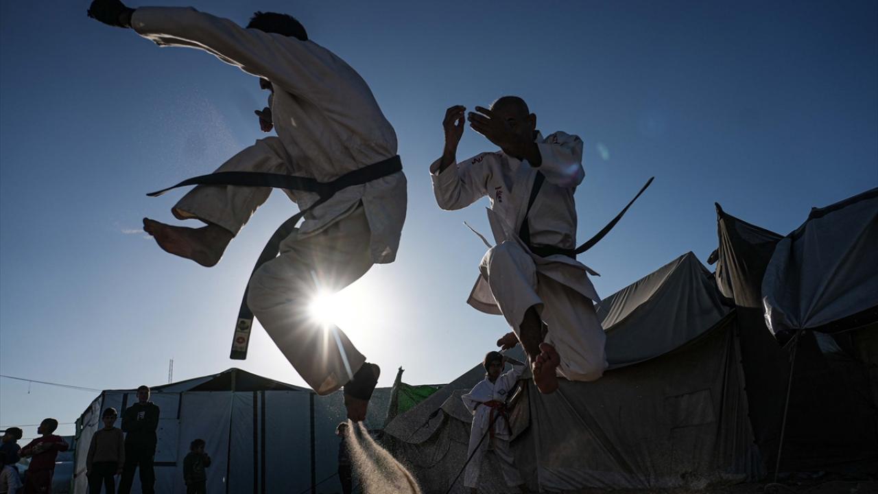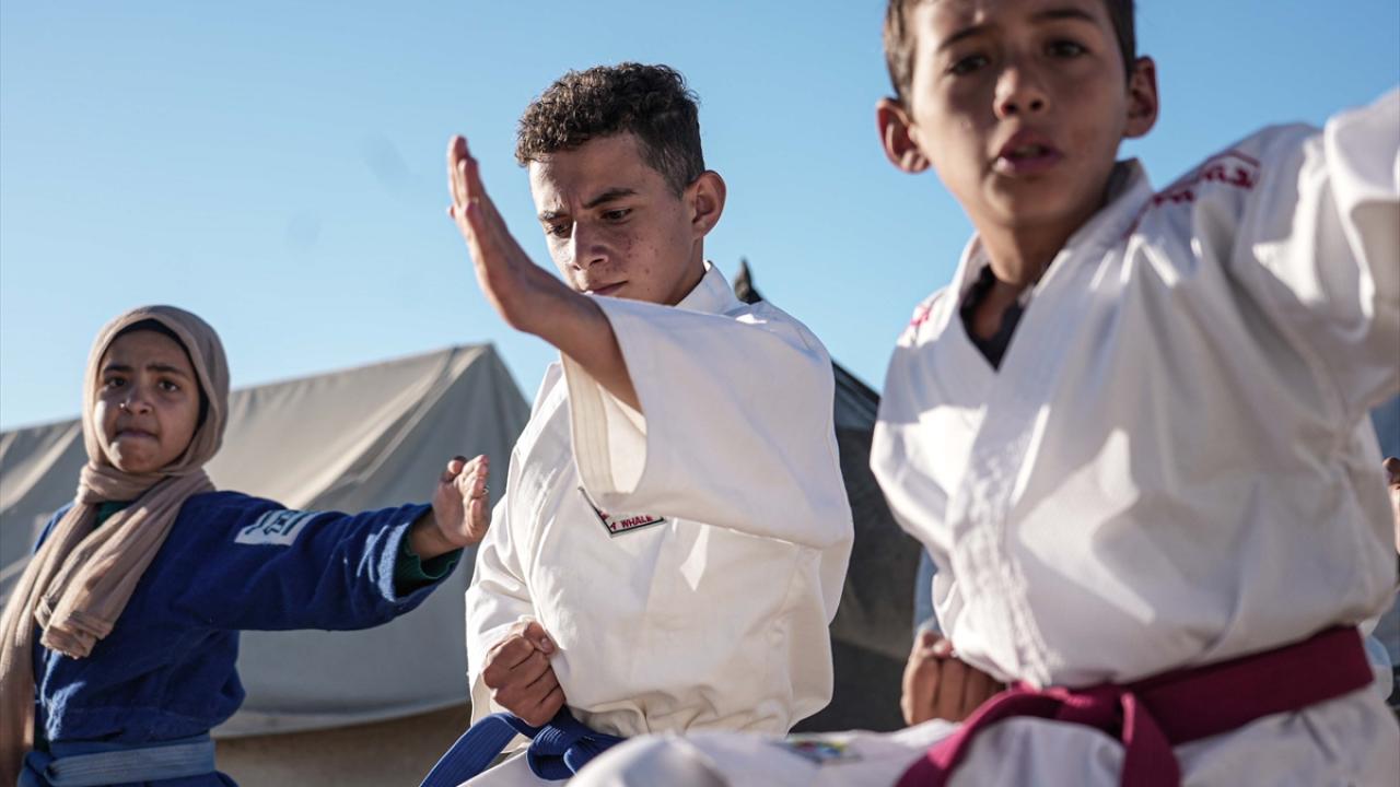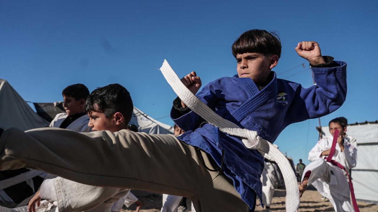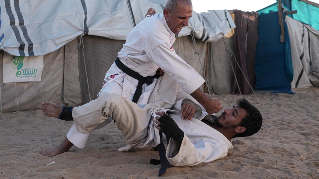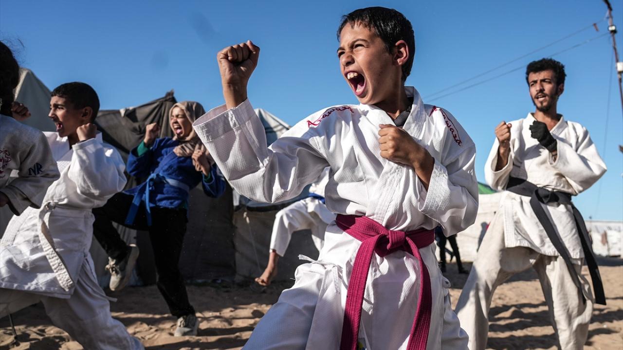 İsrail saldırıları nedeniyle Gazze Şeridi’nin Refah kentinden Han Yunus’a göç etmek zorunda kalan Filistinli karate antrenörü Halil Şakliye, çadır kamptaki tüm zorluklara rağmen çocuklara spor bilincini aşılamayı sürdürüyor.