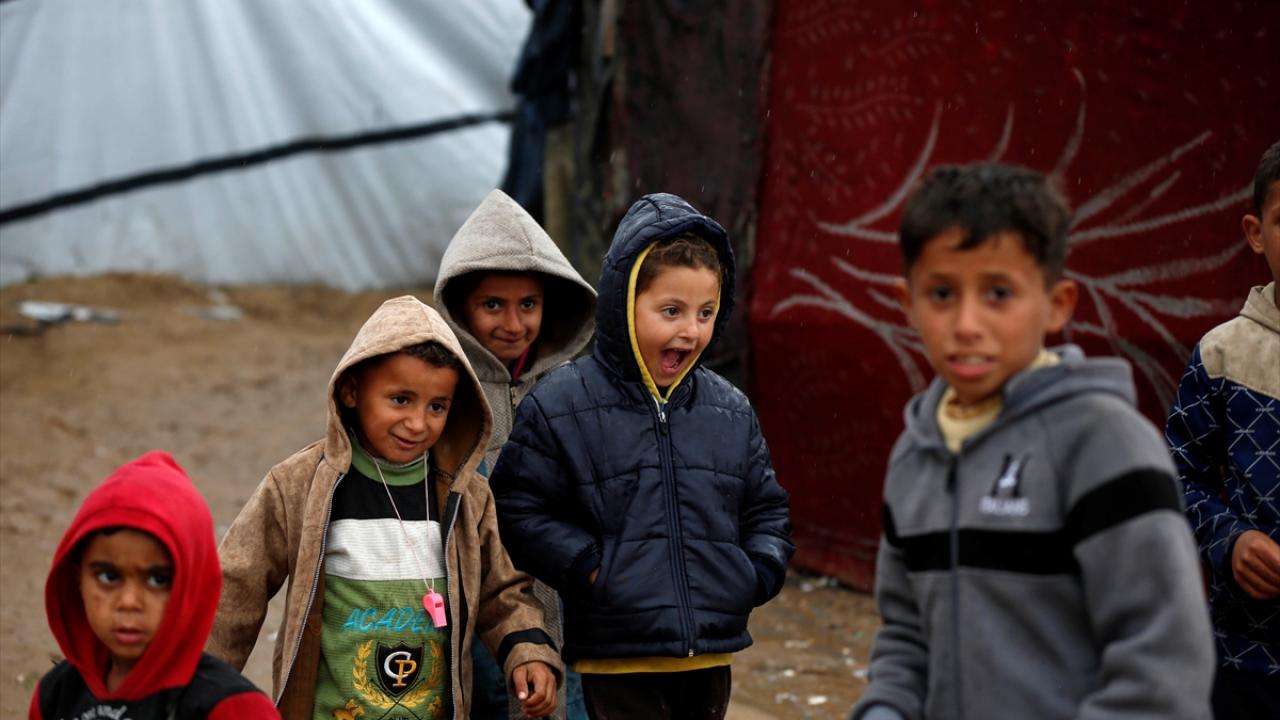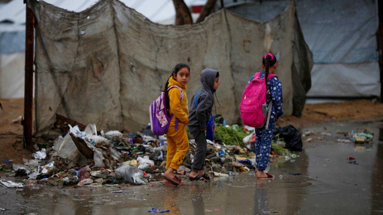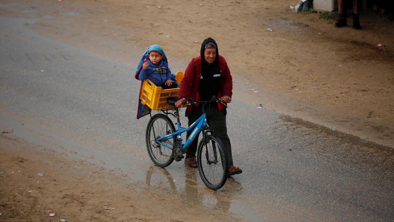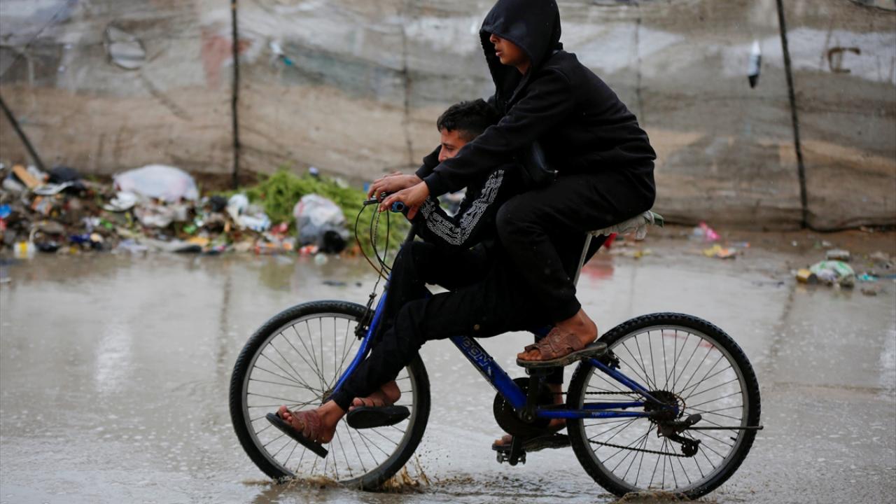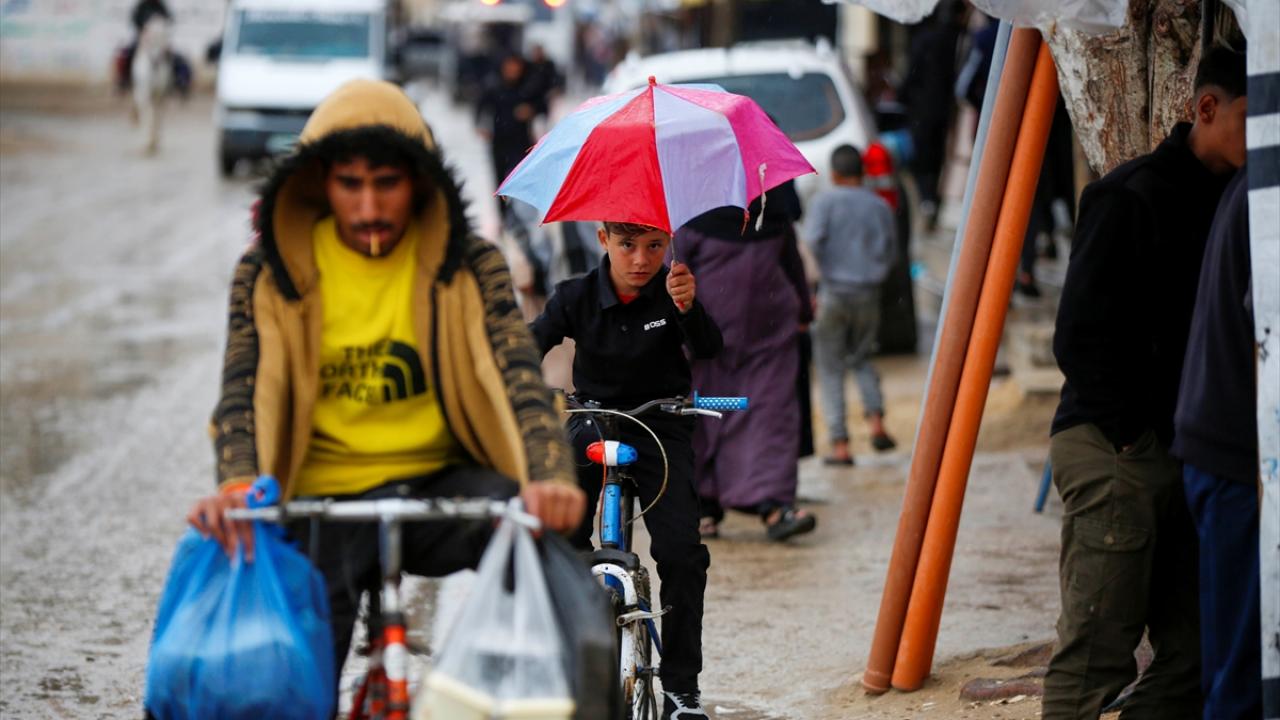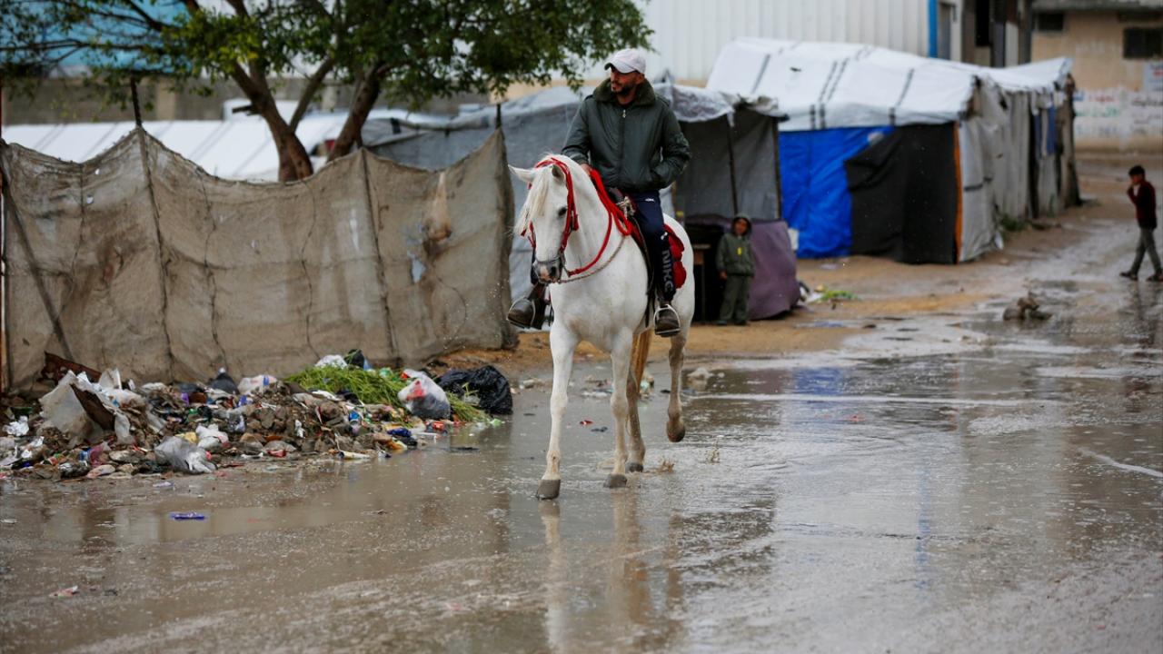 Gazze Şeridi'nin orta kesimindeki Deyr Belah kentinin batısında bulunan çadır kampta yaşayan Filistinliler, etkisini gösteren yağışlı hava ve şiddetli yağmur altında günlük yaşamlarını sürdürmeye çalışıyor.