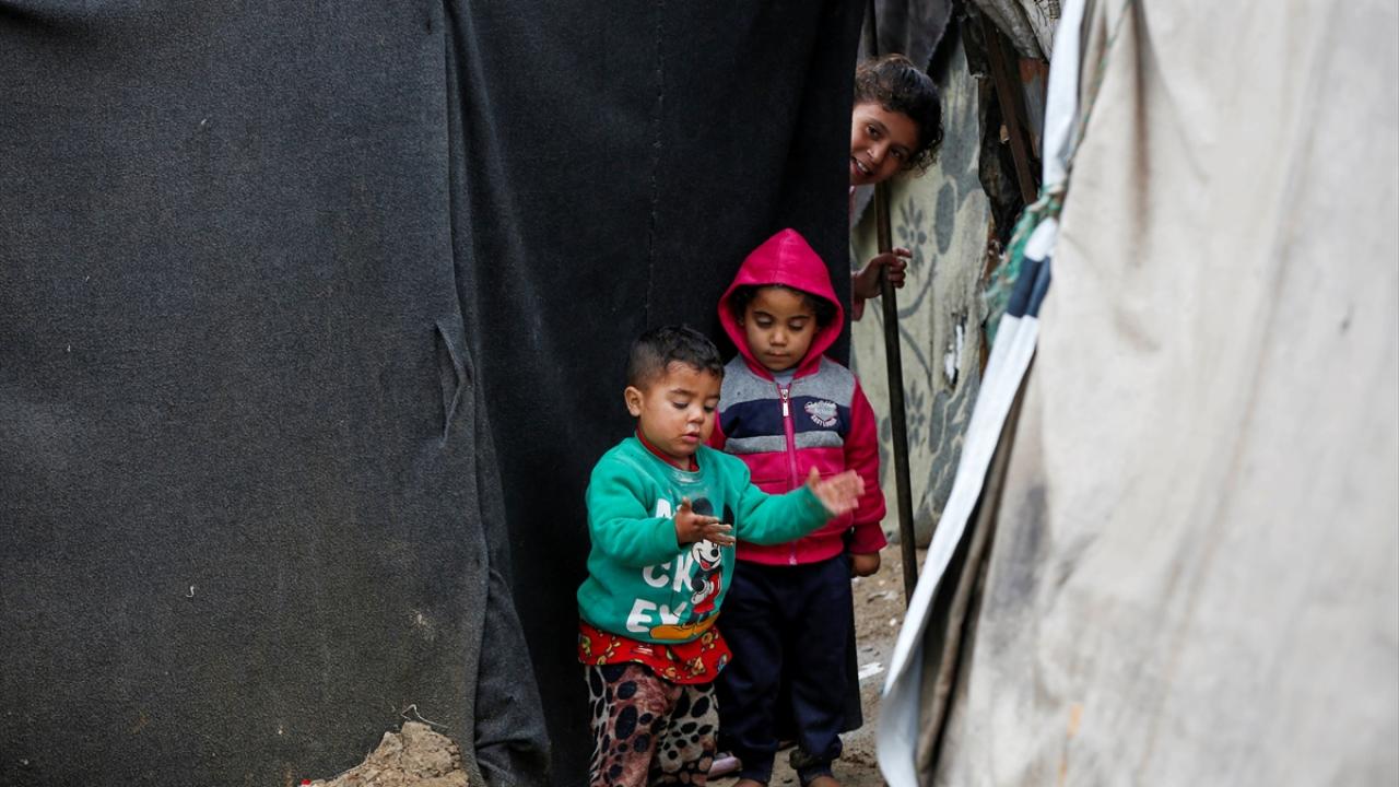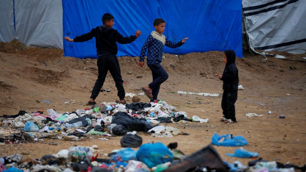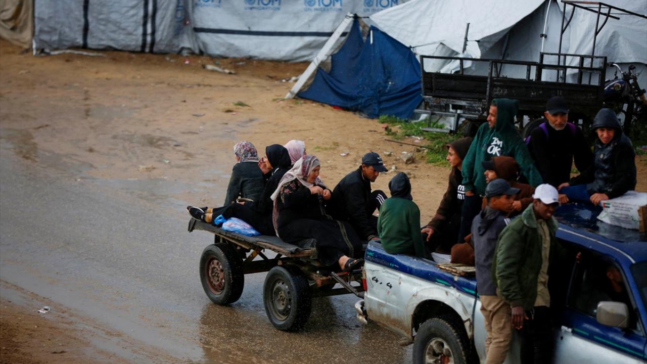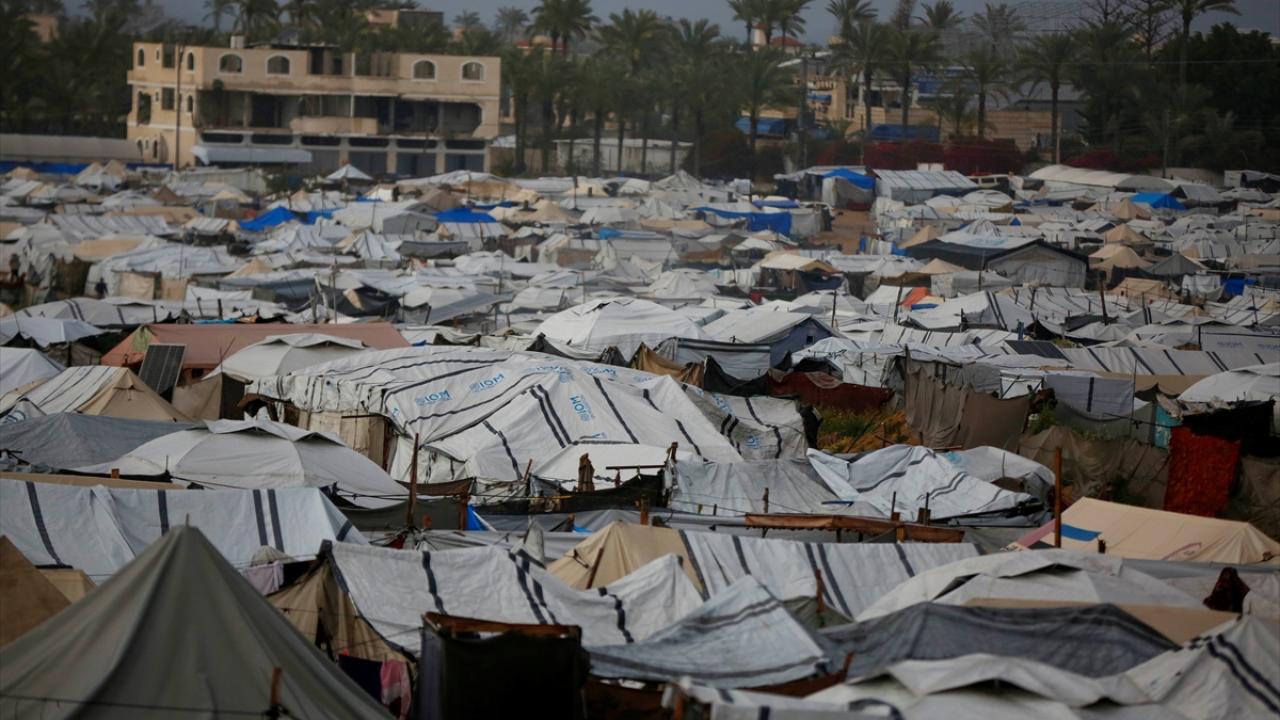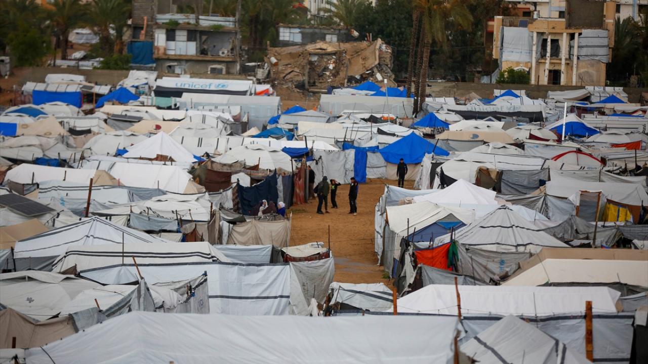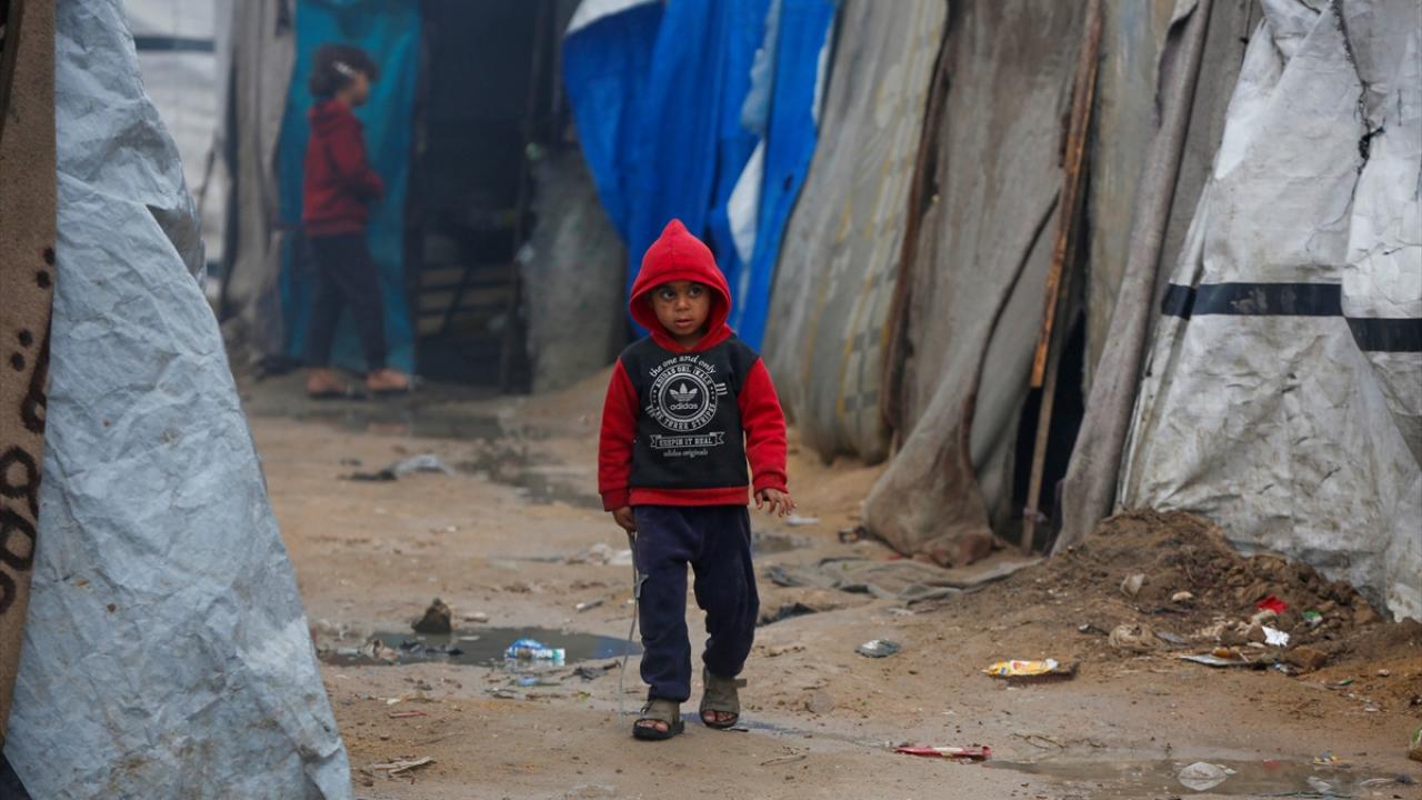 Gazze Şeridi'nin orta kesimindeki Deyr Belah kentinin batısında bulunan çadır kampta yaşayan Filistinliler, etkisini gösteren yağışlı hava ve şiddetli yağmur altında günlük yaşamlarını sürdürmeye çalışıyor.