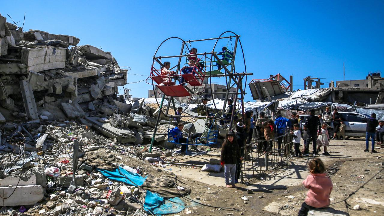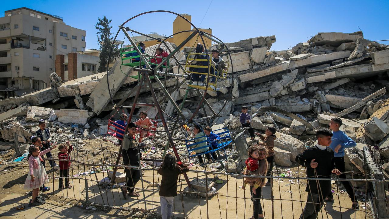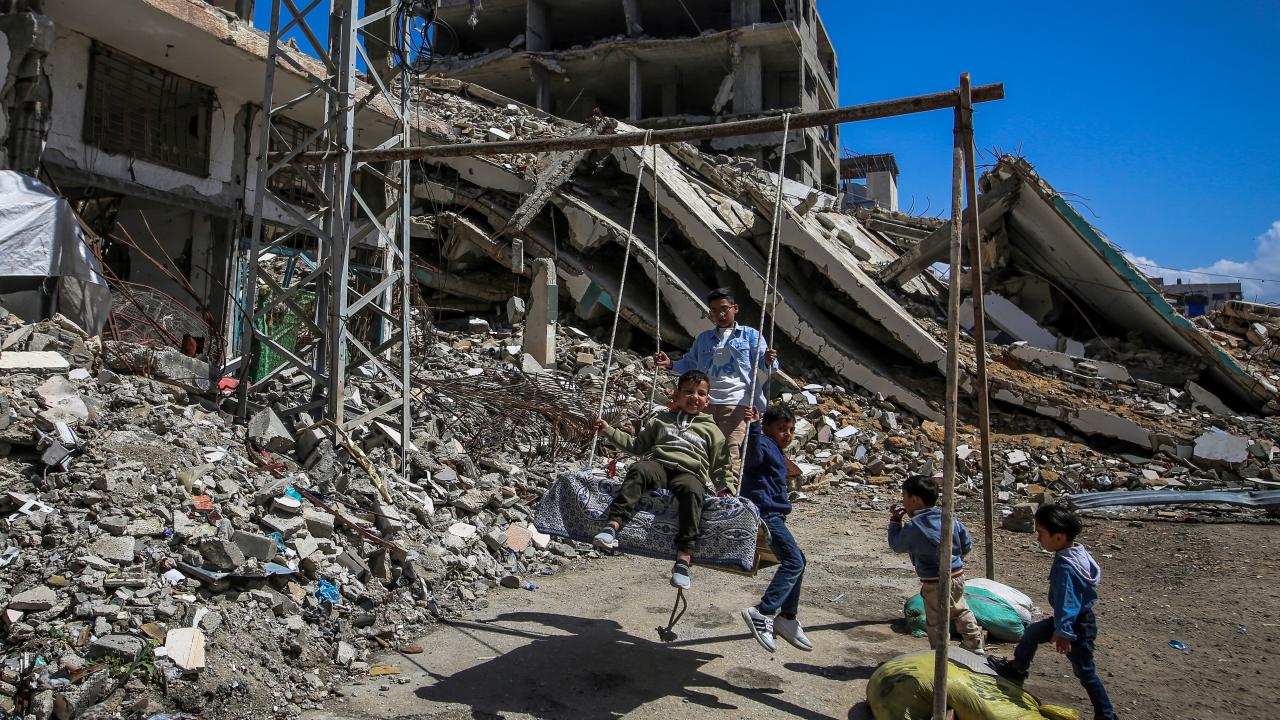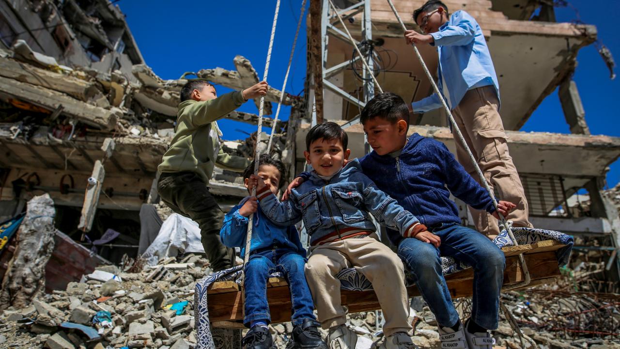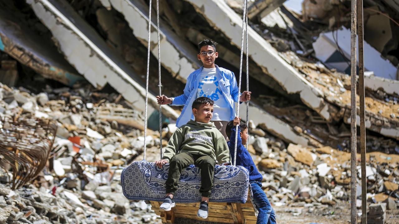 Gazze kentinin Tel el-Hava bölgesinde yerinden edilen Filistinli çocuklar, Ramazan Bayramı'nın 3. gününde enkaz halindeki binalar ve derme çatma çadırlar arasına kurulu salıncaklarda oyun oynayarak eğlendi.