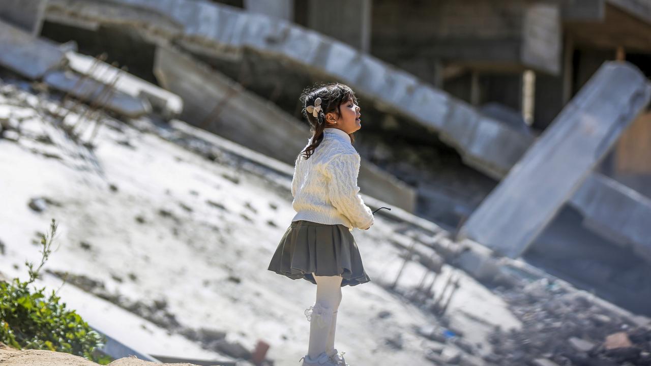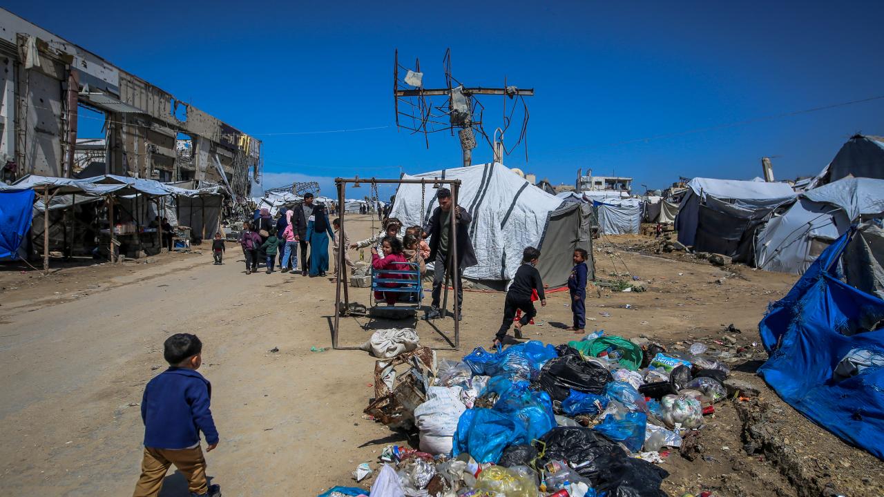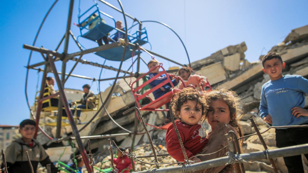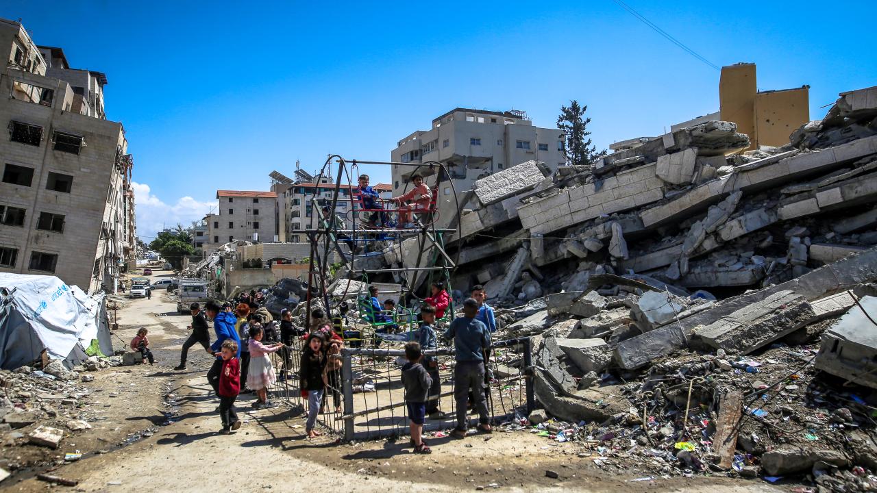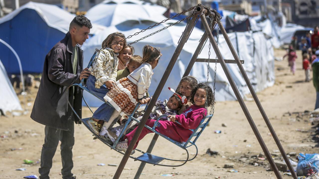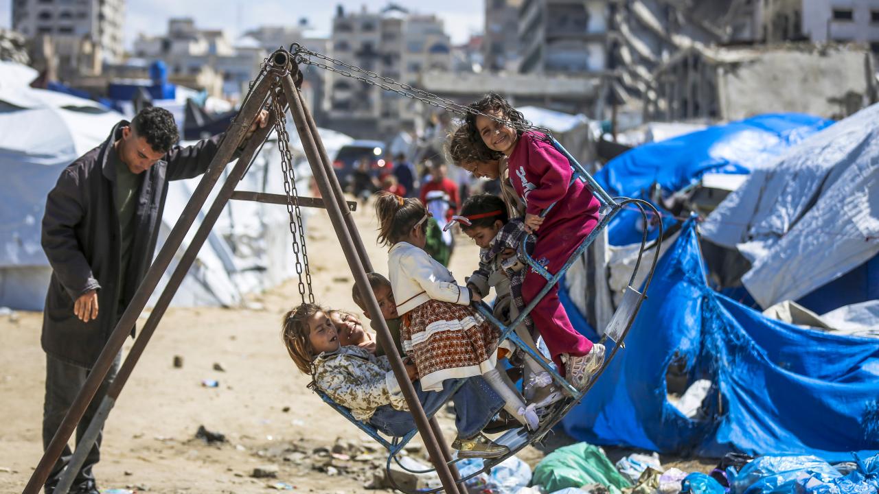 Gazze kentinin Tel el-Hava bölgesinde yerinden edilen Filistinli çocuklar, Ramazan Bayramı'nın 3. gününde enkaz halindeki binalar ve derme çatma çadırlar arasına kurulu salıncaklarda oyun oynayarak eğlendi.