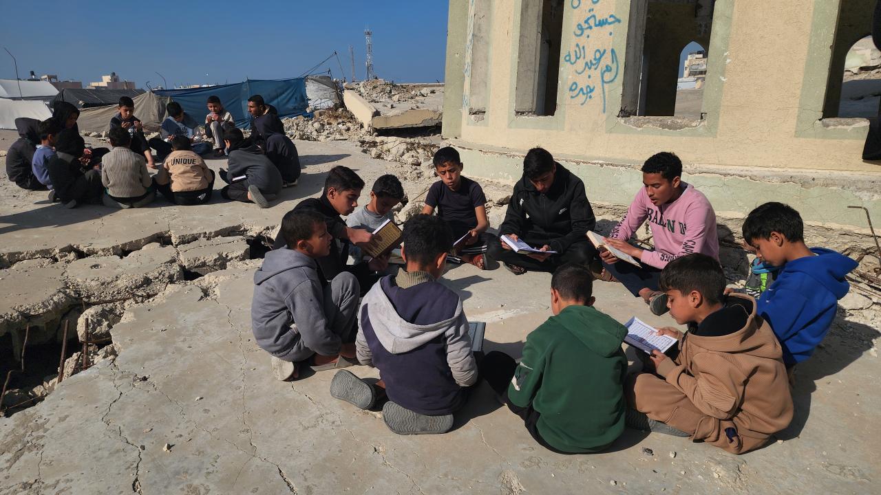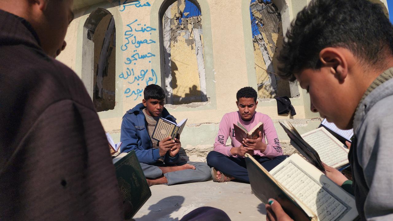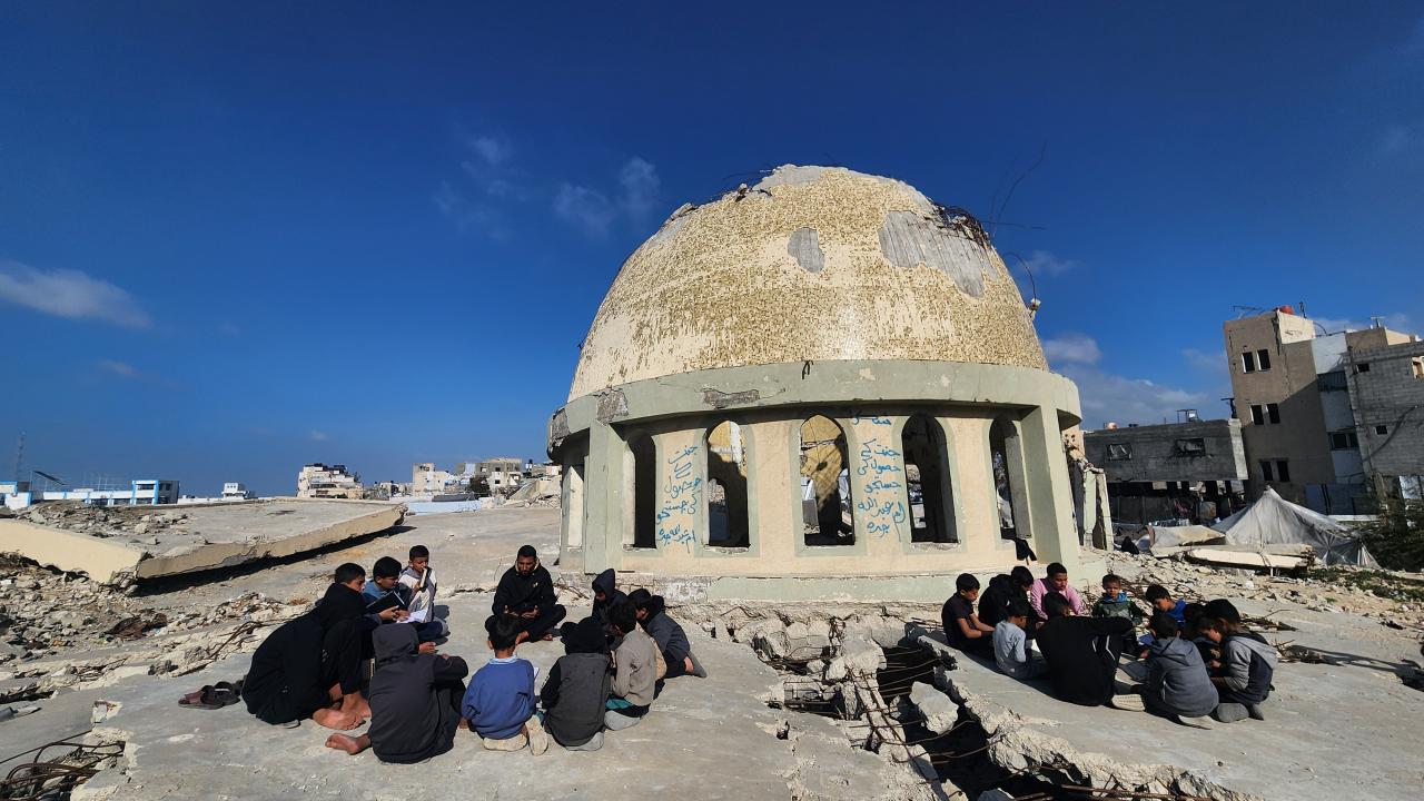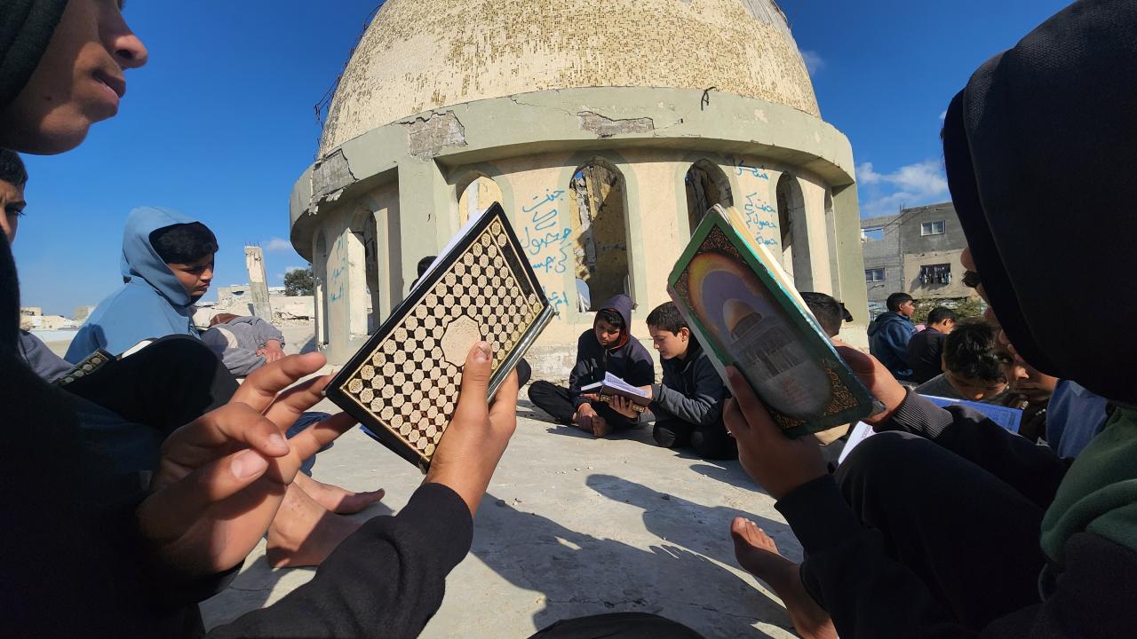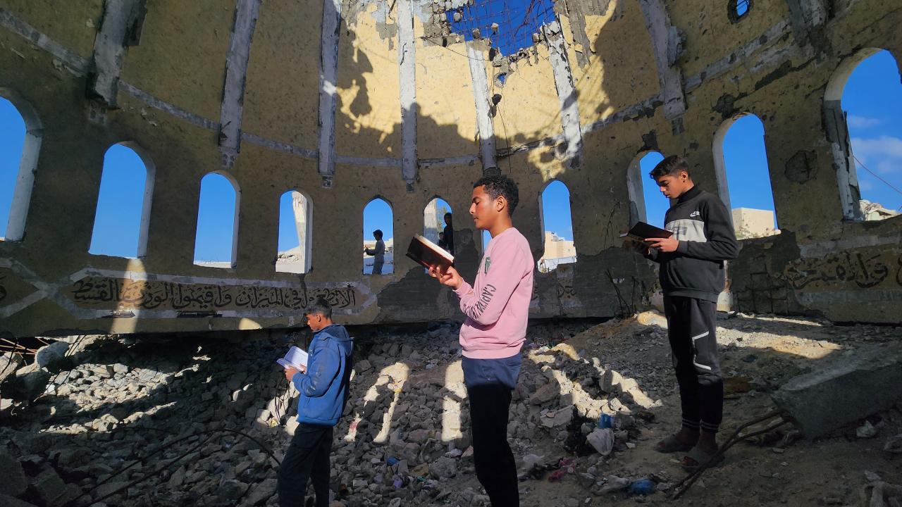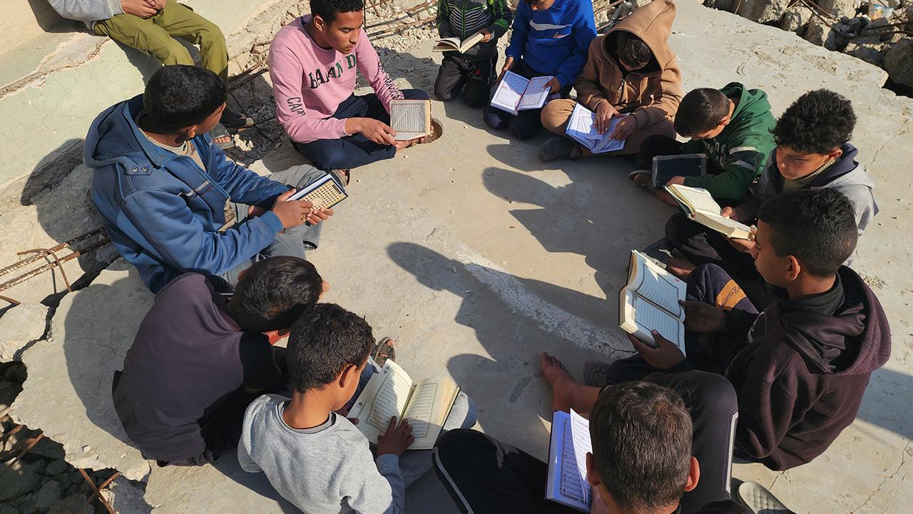 Gazze Şeridi'nin Han Yunus kentinde yaşayan Filistinli çocuklar, ramazan ayında iftar saatini beklerken günlerini, İsrail saldırısında ağır yıkıma uğrayan El Habib Muhammed Camii enkazında Kuran-ı Kerim okuyarak geçiriyor.