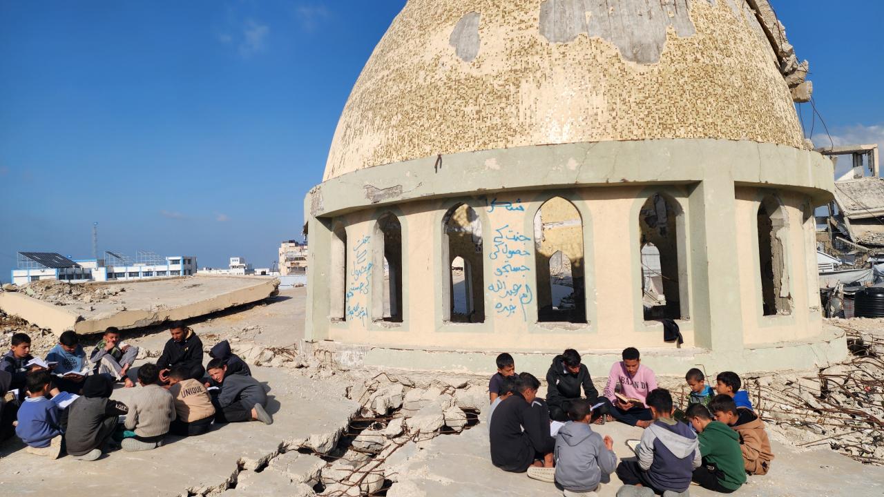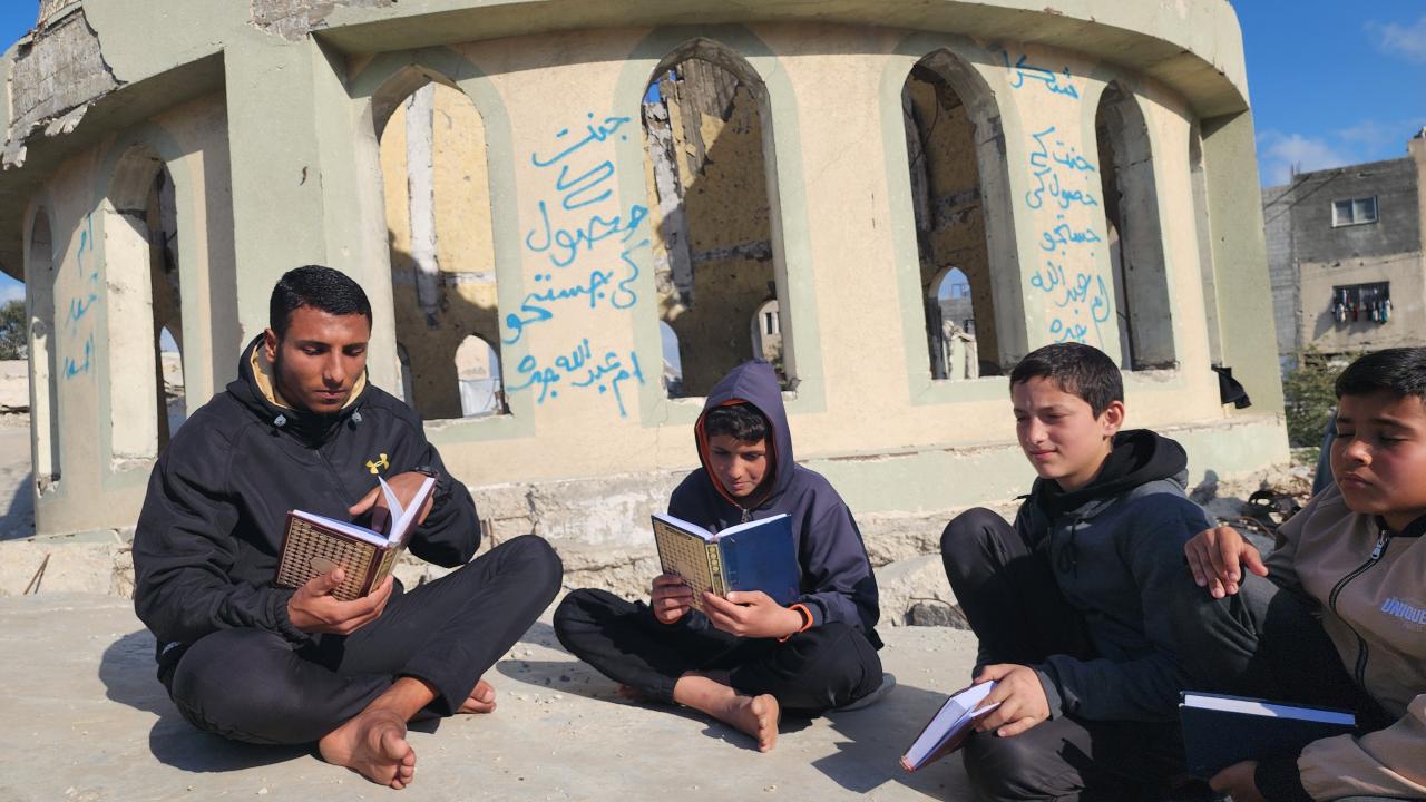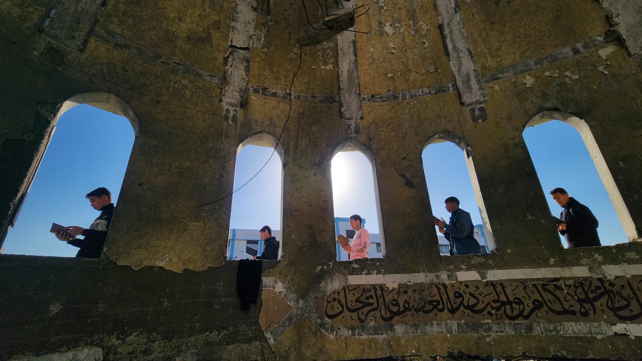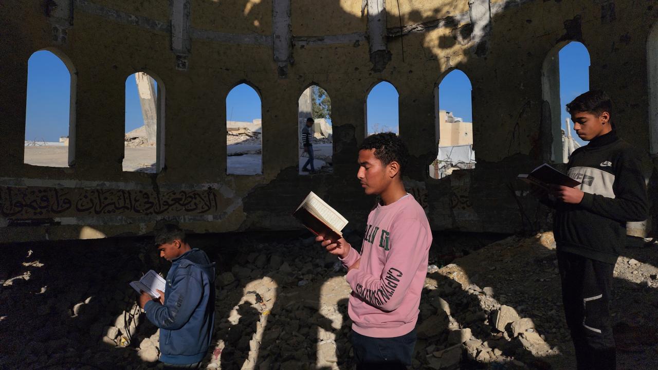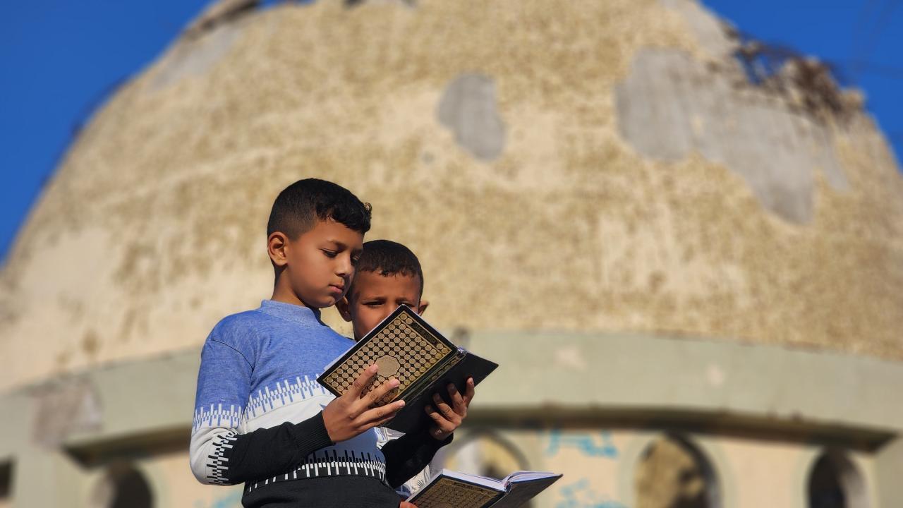 Gazze Şeridi'nin Han Yunus kentinde yaşayan Filistinli çocuklar, ramazan ayında iftar saatini beklerken günlerini, İsrail saldırısında ağır yıkıma uğrayan El Habib Muhammed Camii enkazında Kuran-ı Kerim okuyarak geçiriyor.