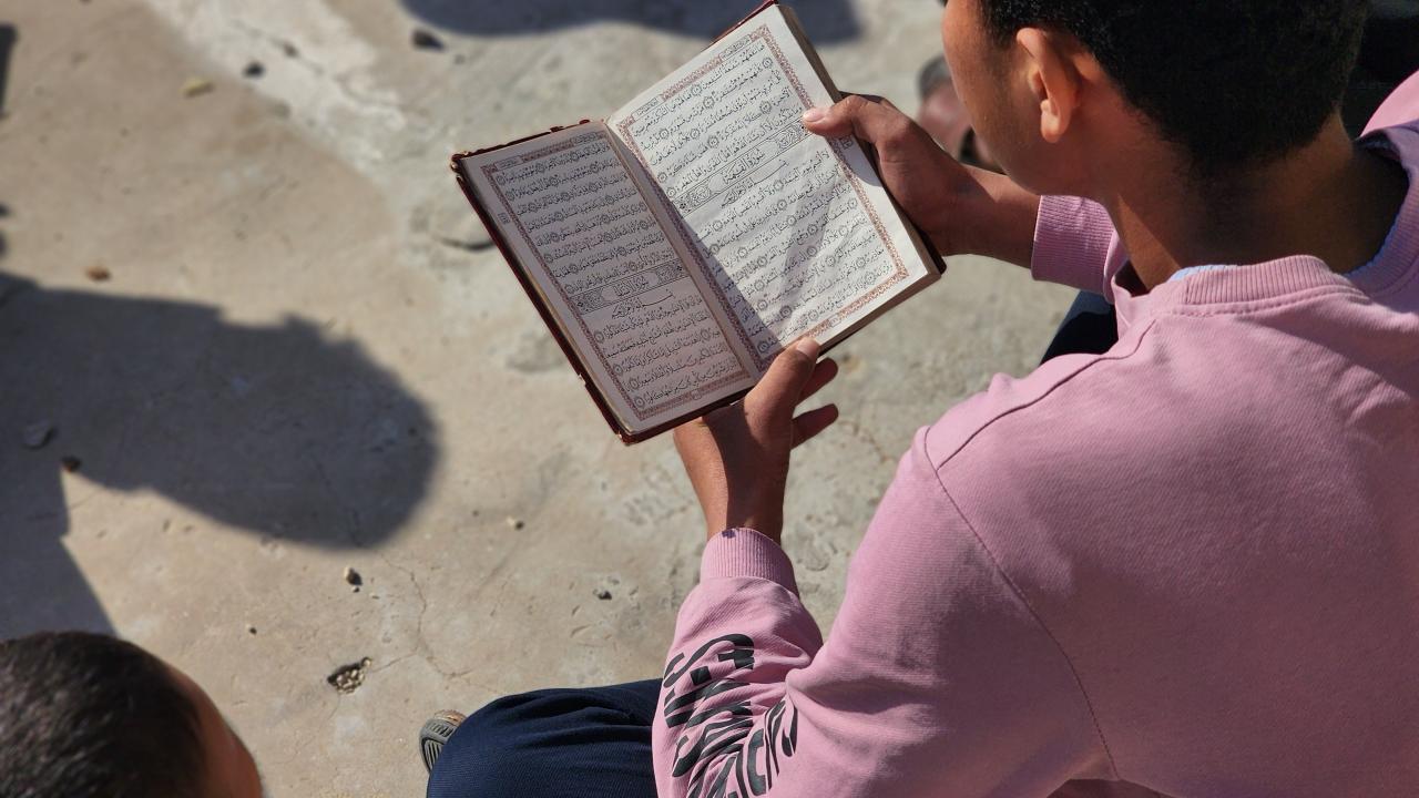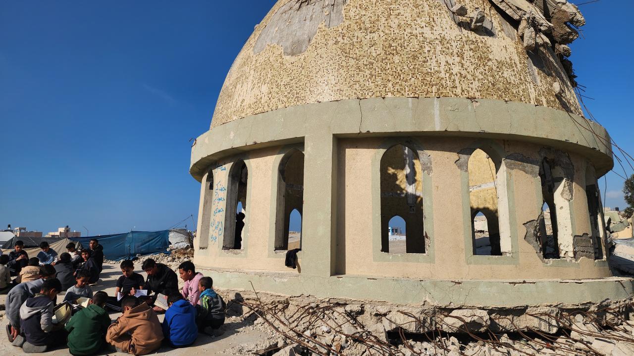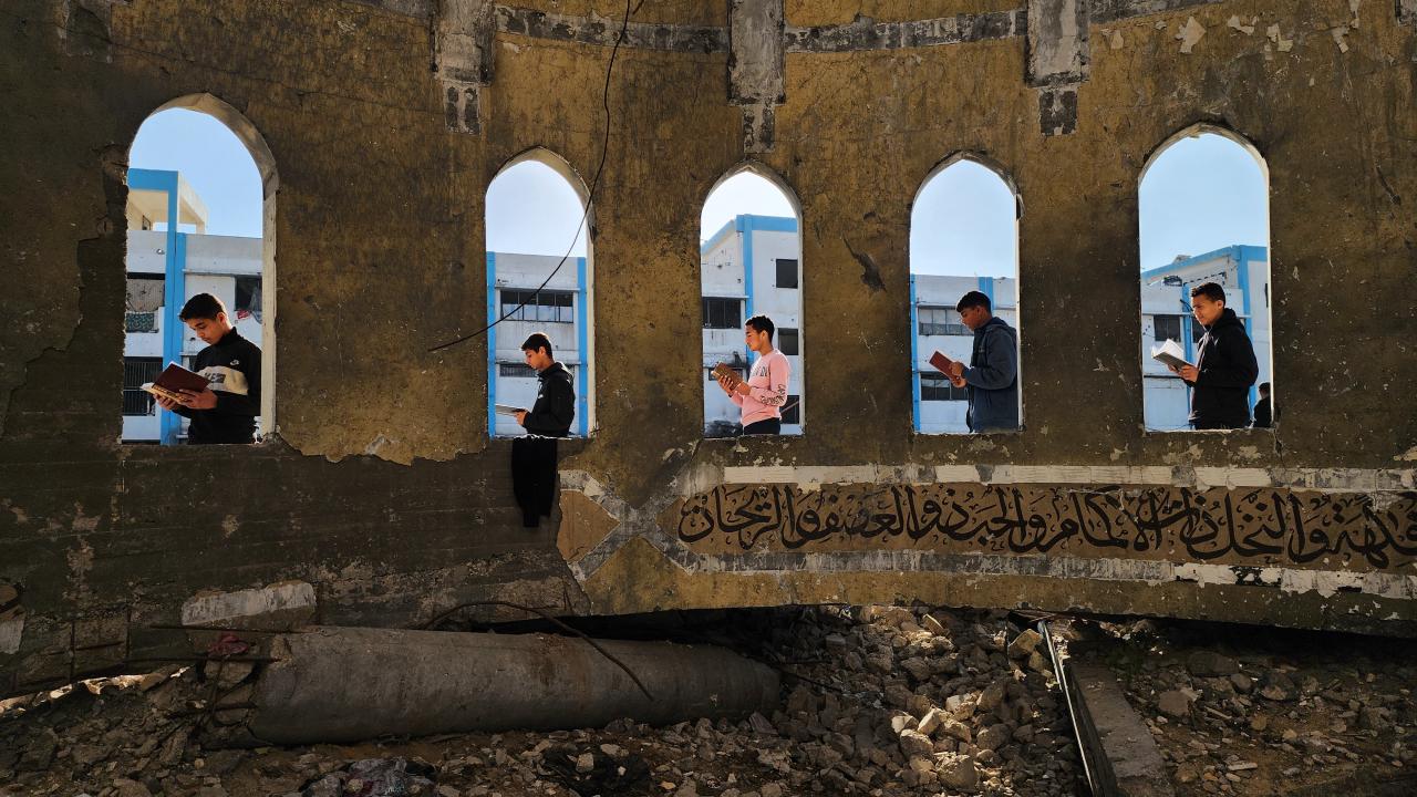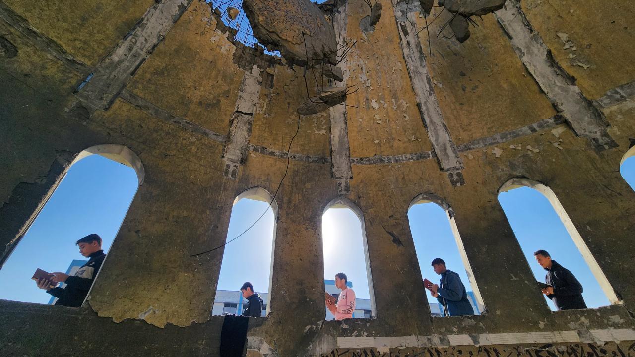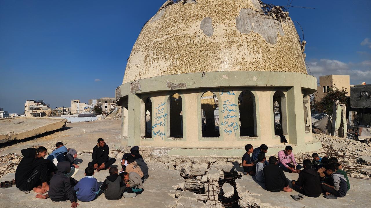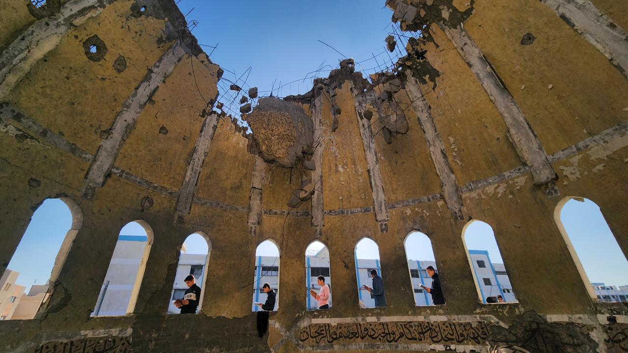 Gazze Şeridi'nin Han Yunus kentinde yaşayan Filistinli çocuklar, ramazan ayında iftar saatini beklerken günlerini, İsrail saldırısında ağır yıkıma uğrayan El Habib Muhammed Camii enkazında Kuran-ı Kerim okuyarak geçiriyor.