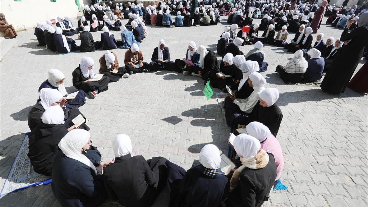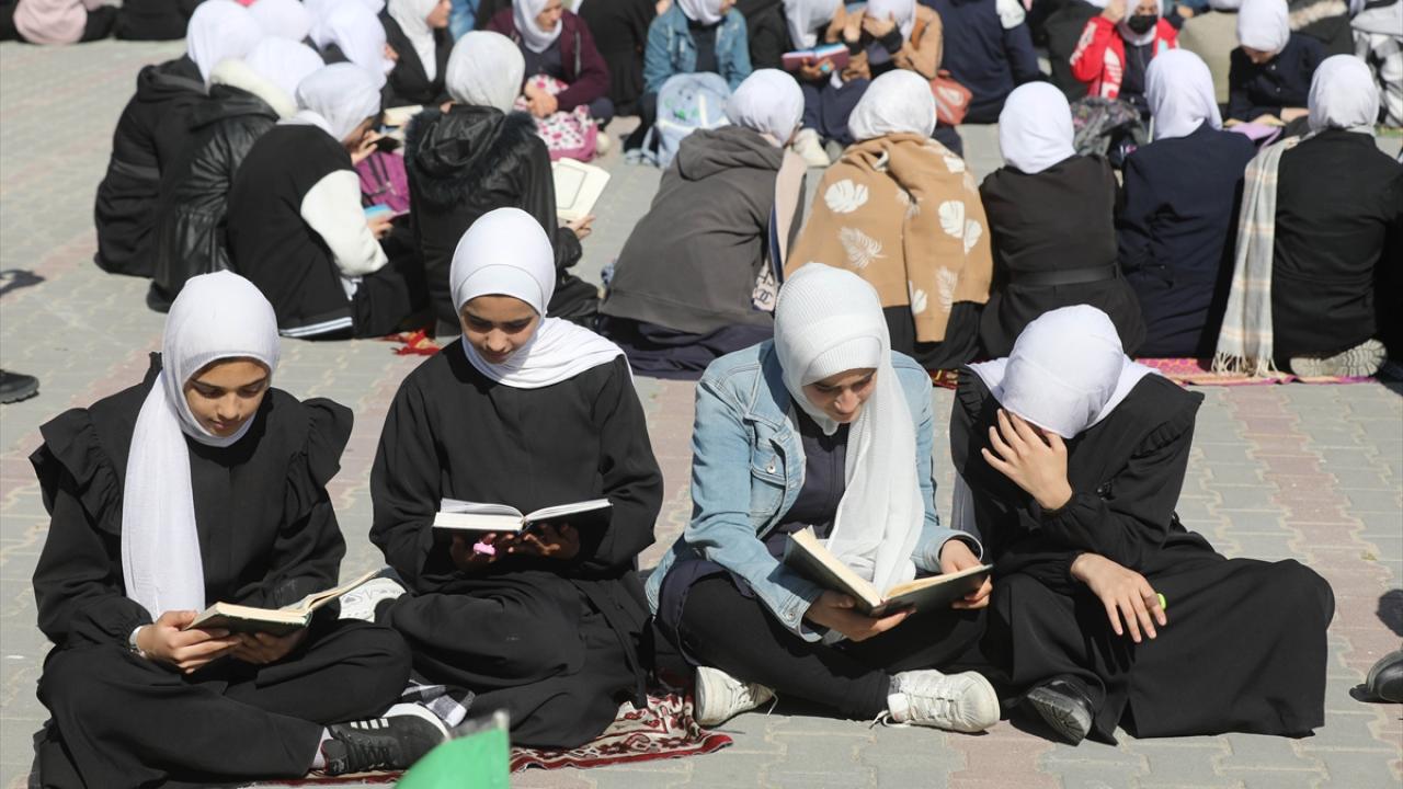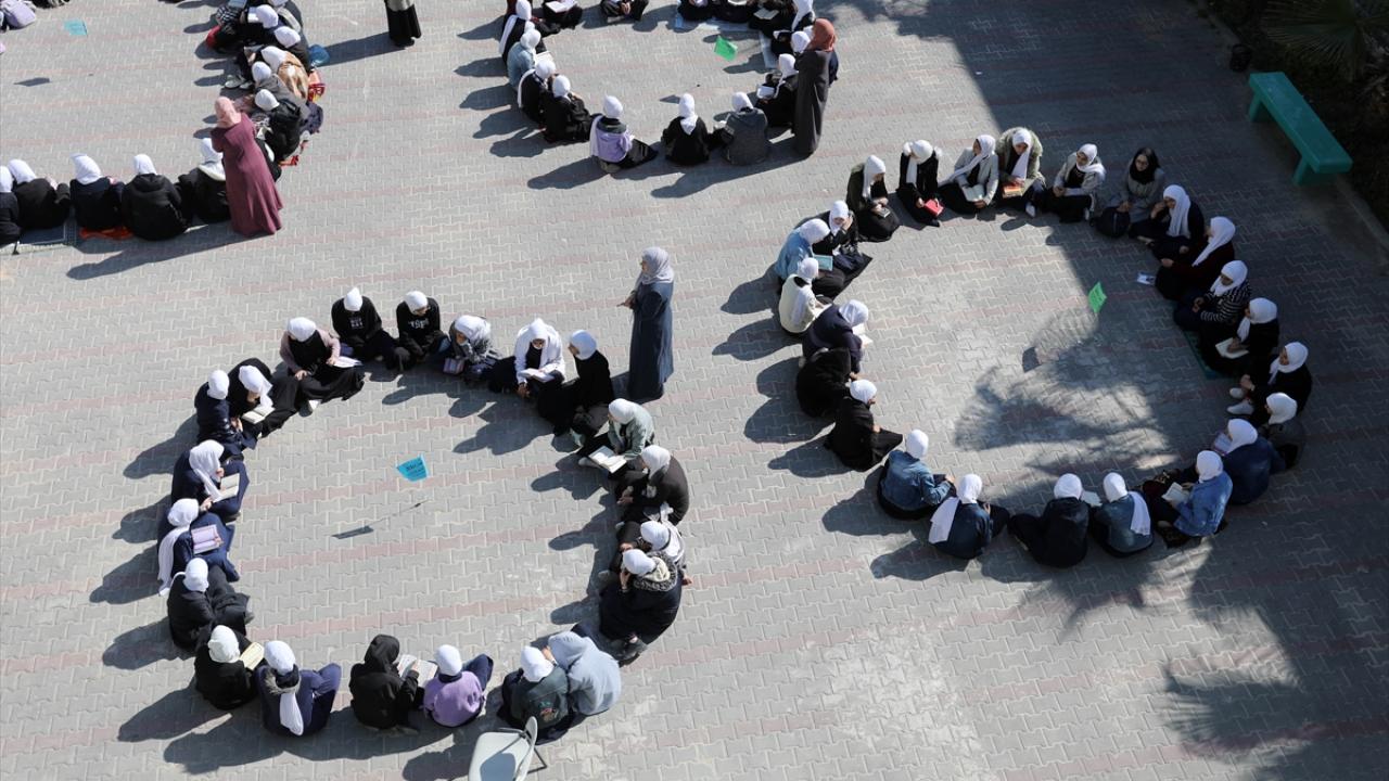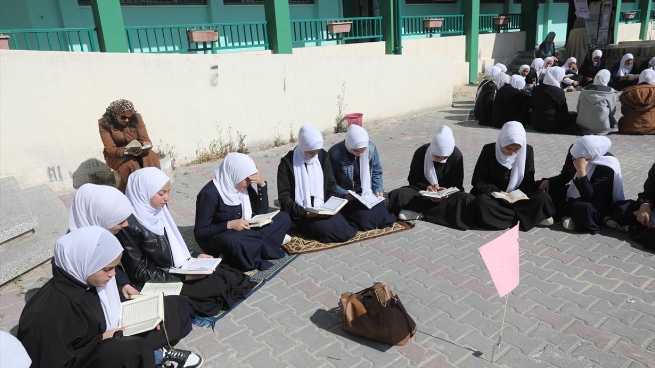 Abluka altındaki Gazze Şeridi’nin orta kesimindeki Nuseyrat Mülteci Kampı'nda bulunan Memduh Sidem Kız lisesi öğrencileri, Ramazan ayı dolayısıyla teneffüs aralarında yaklaşık yirmişer gruplar halinde bir araya gelerek oluşturdukları 30 halkada, Kur'an-ı Kerim’i hatim ediyorlar.