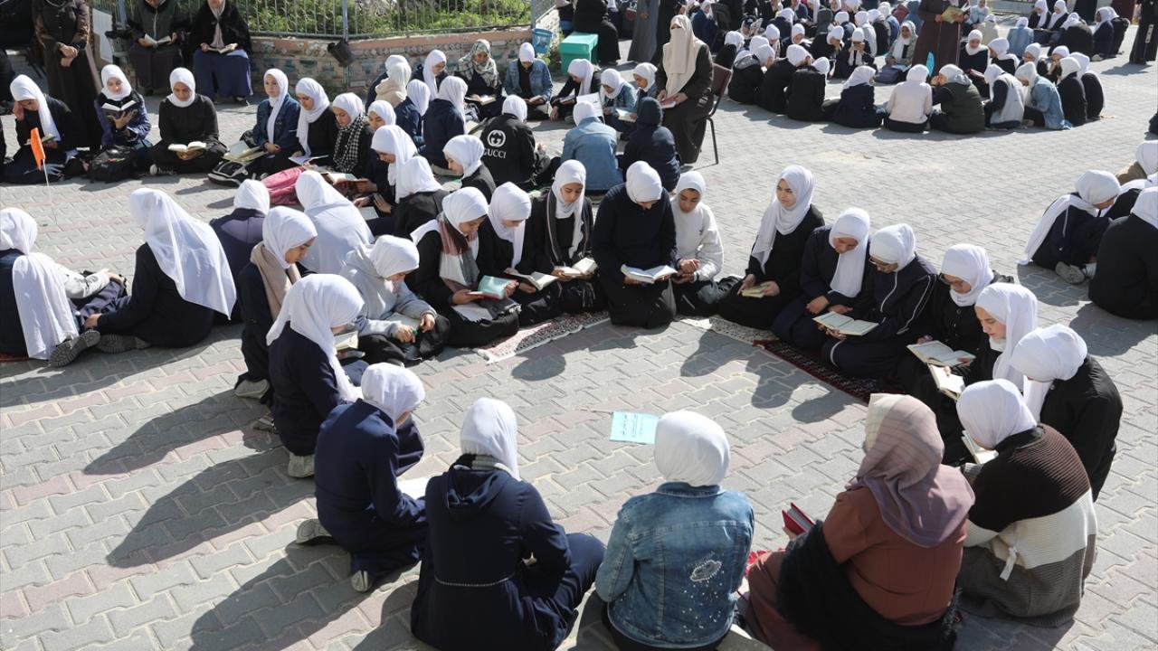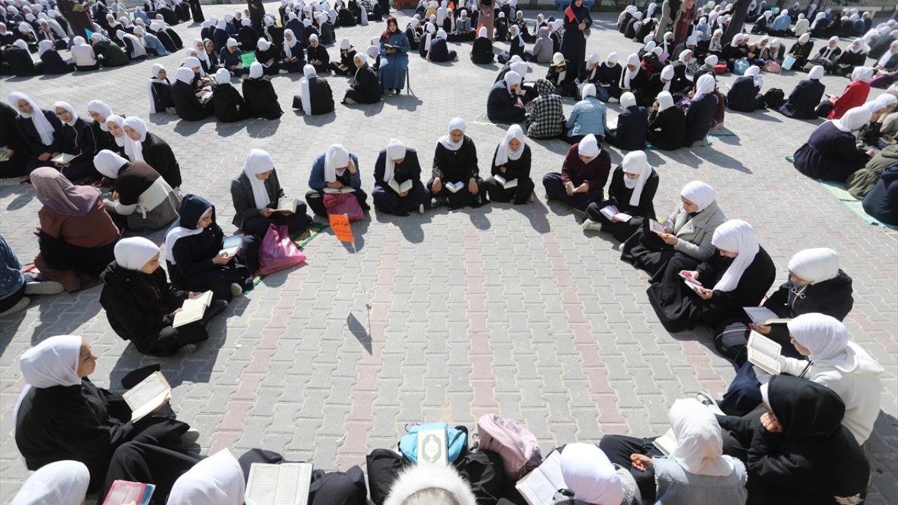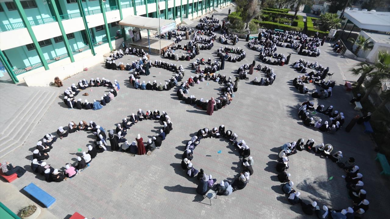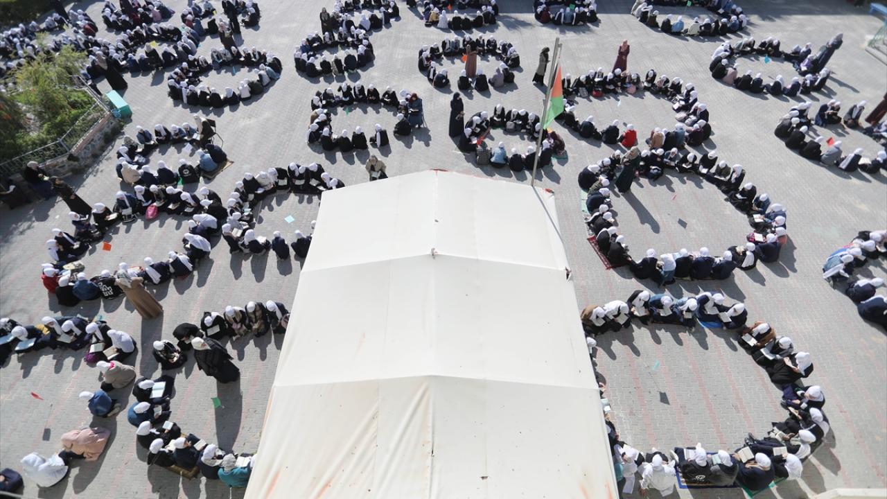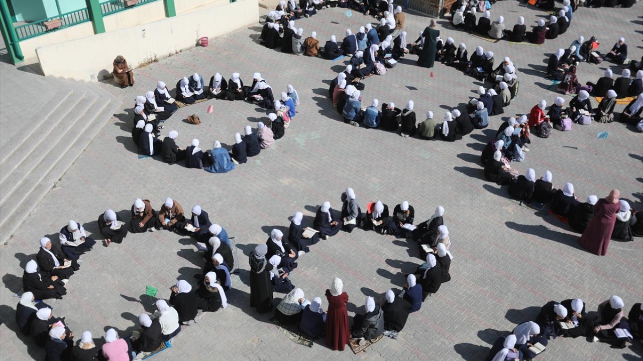 Abluka altındaki Gazze Şeridi’nin orta kesimindeki Nuseyrat Mülteci Kampı'nda bulunan Memduh Sidem Kız lisesi öğrencileri, Ramazan ayı dolayısıyla teneffüs aralarında yaklaşık yirmişer gruplar halinde bir araya gelerek oluşturdukları 30 halkada, Kur'an-ı Kerim’i hatim ediyorlar.