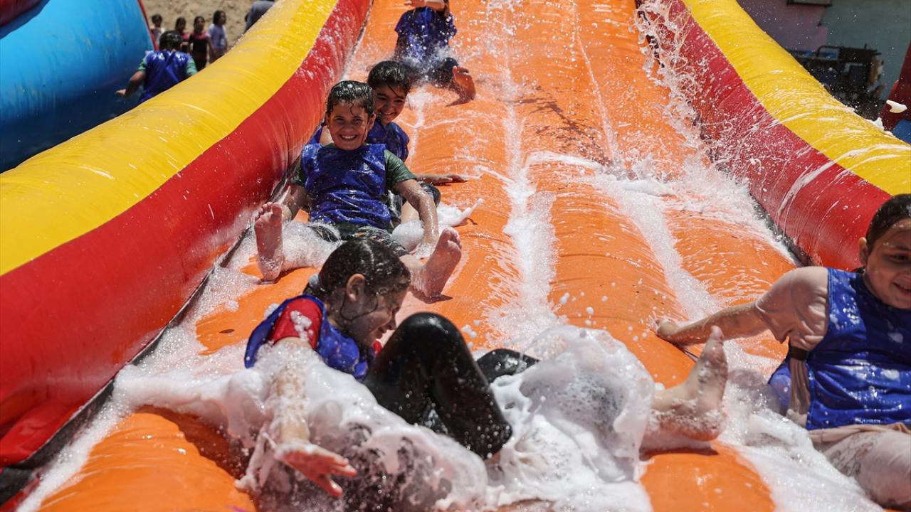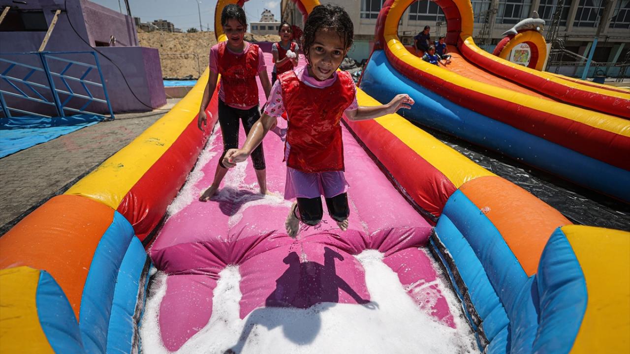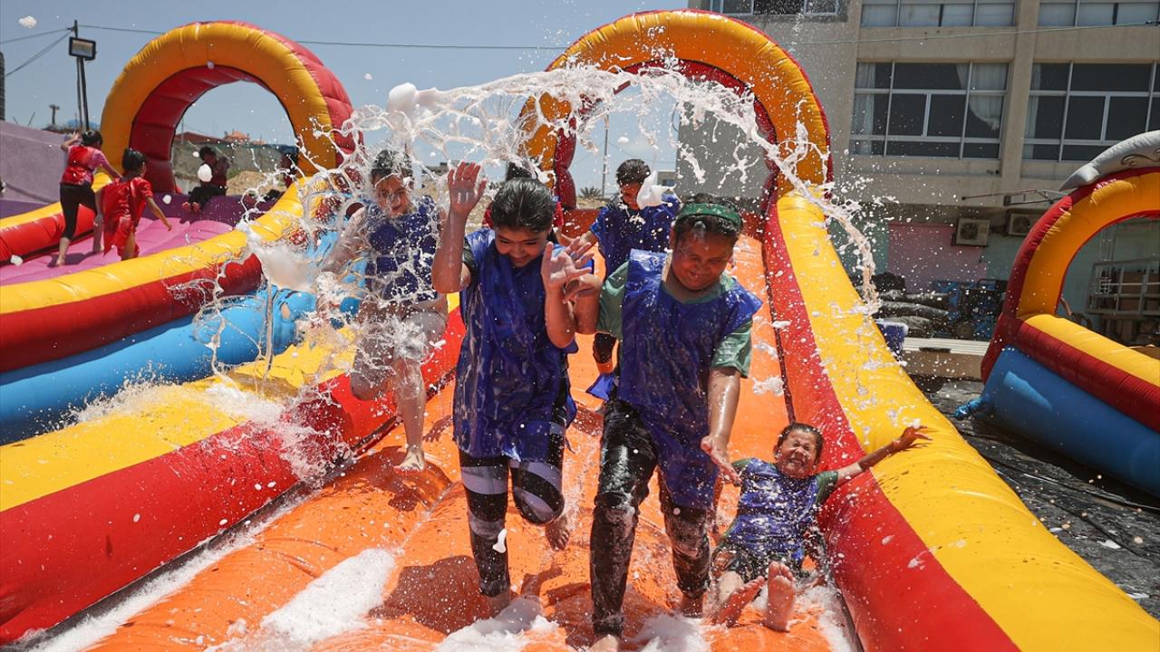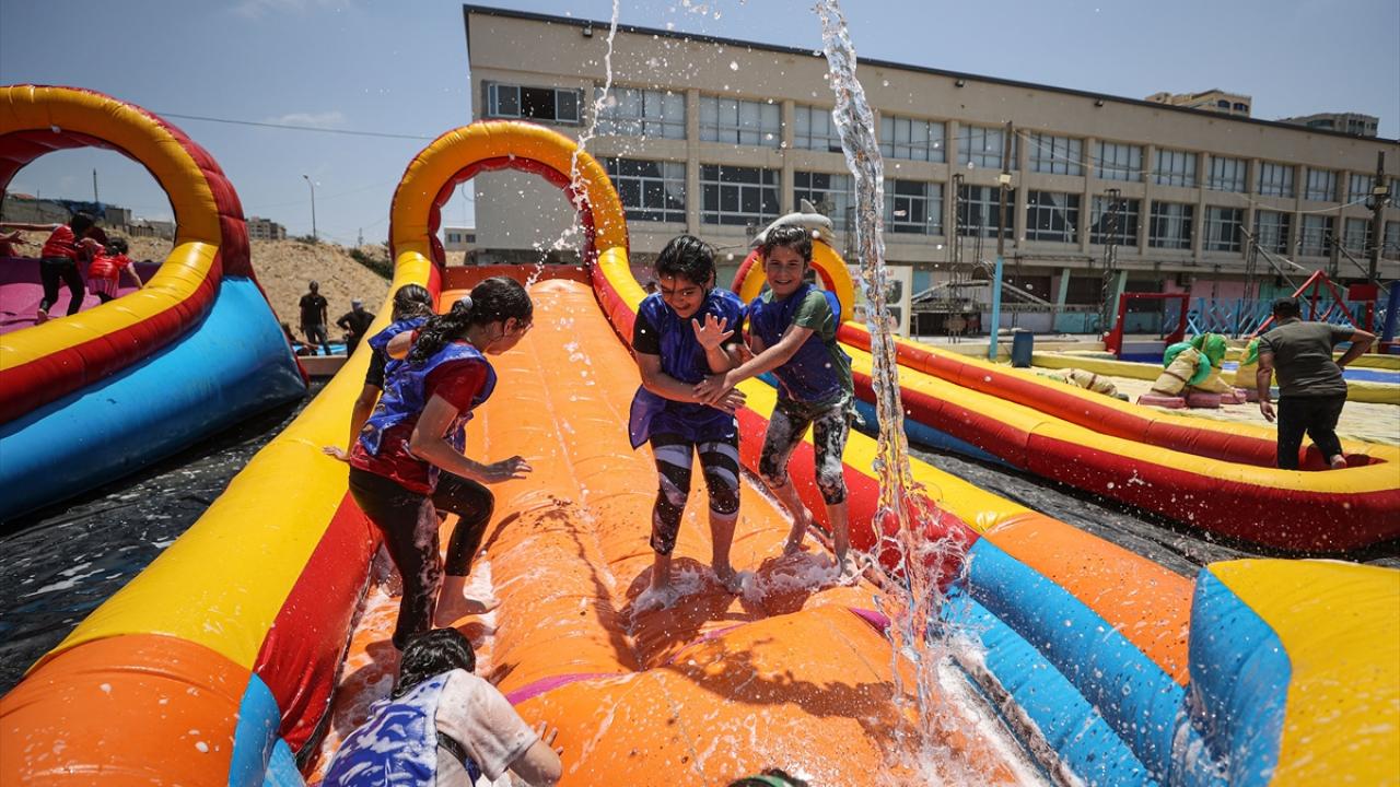 Gazze'de sıcaktan bunalan çocuklar, su parklarına akın ediyor