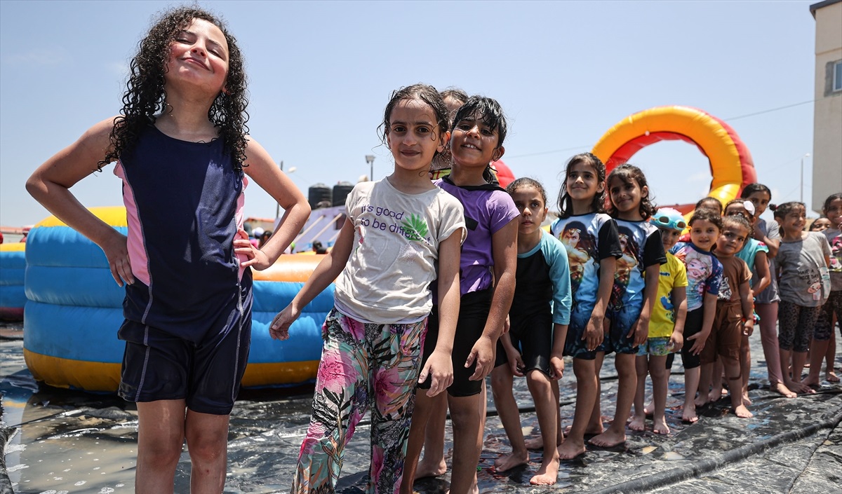 Gazze'de sıcak havadan bunalan çocuklar, serinlemek için kentteki su parklarına akın ediyor.