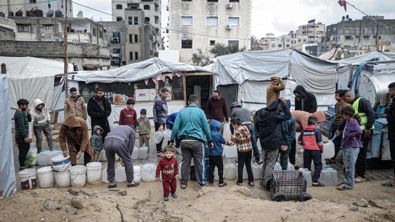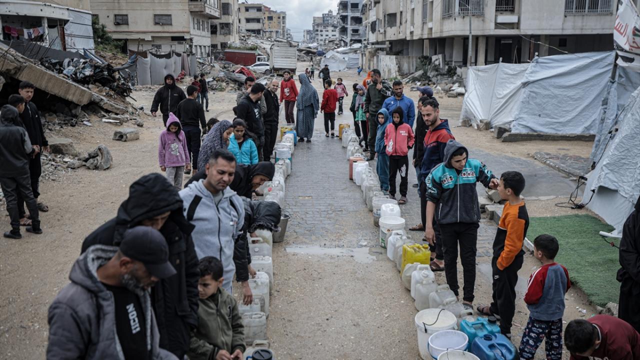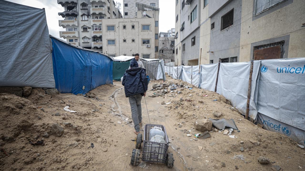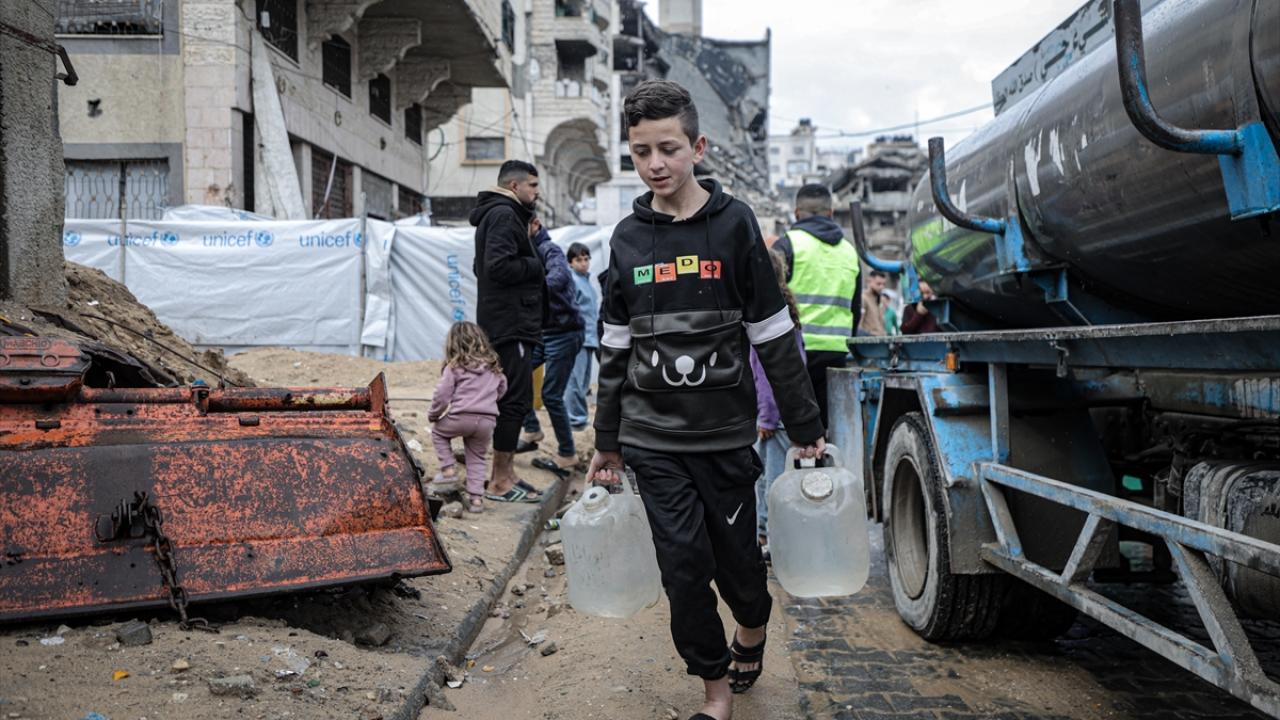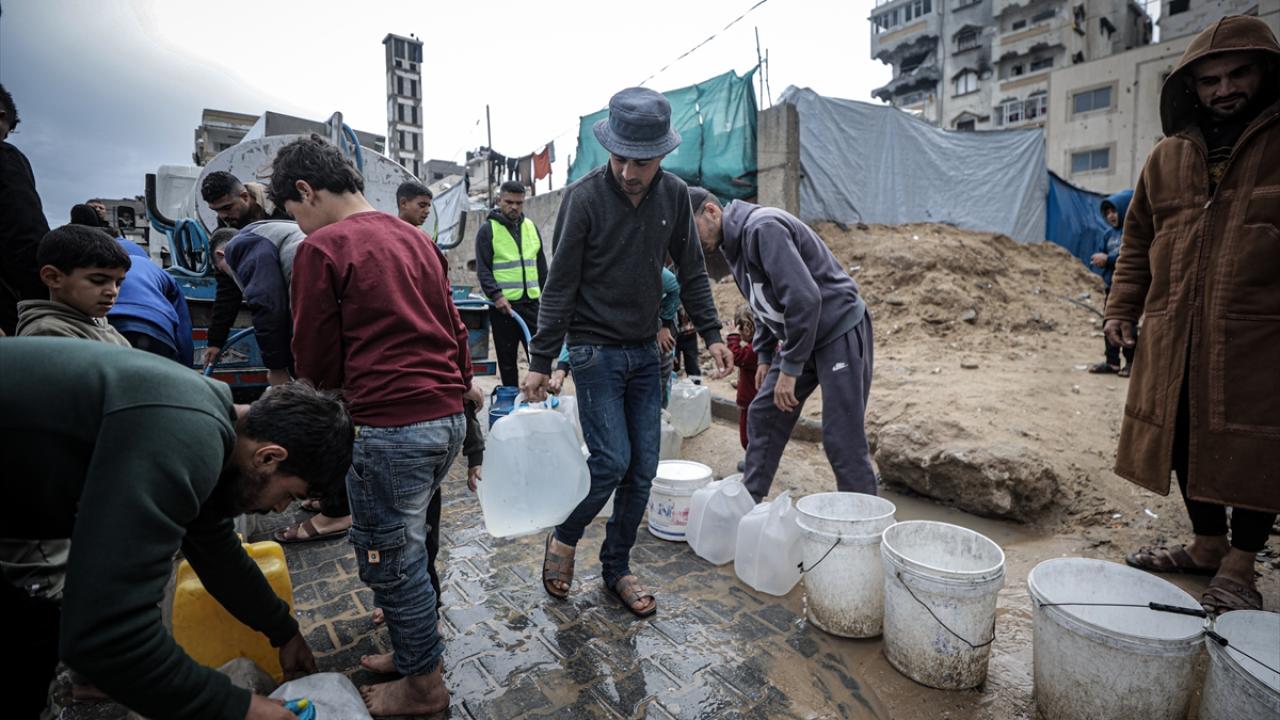 İsrail saldırıları sonucu altyapının ağır hasar görmesi sebebiyle su krizinin yaşandığı Gazze kentinin Rimal Mahallesi’nde Filistinliler, tankerlerin dağıttığı suları bidonlara doldurarak yaşam alanlarına taşıdı.