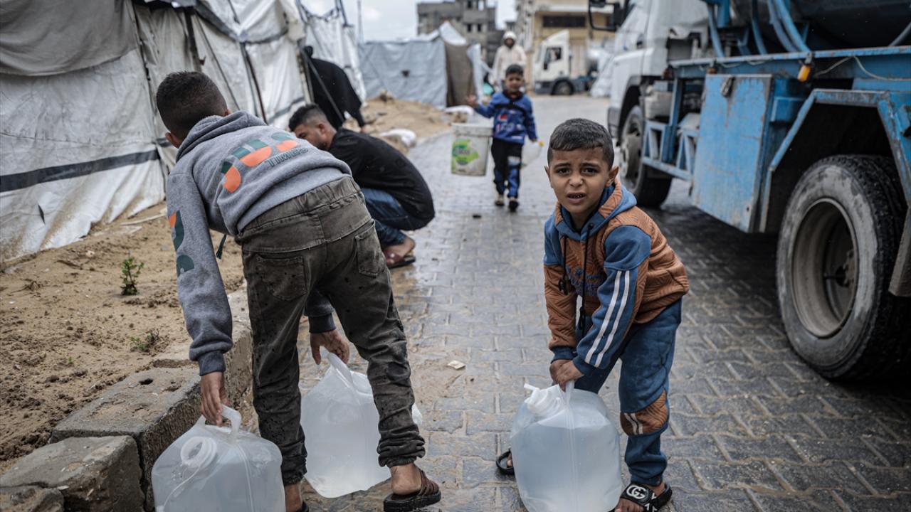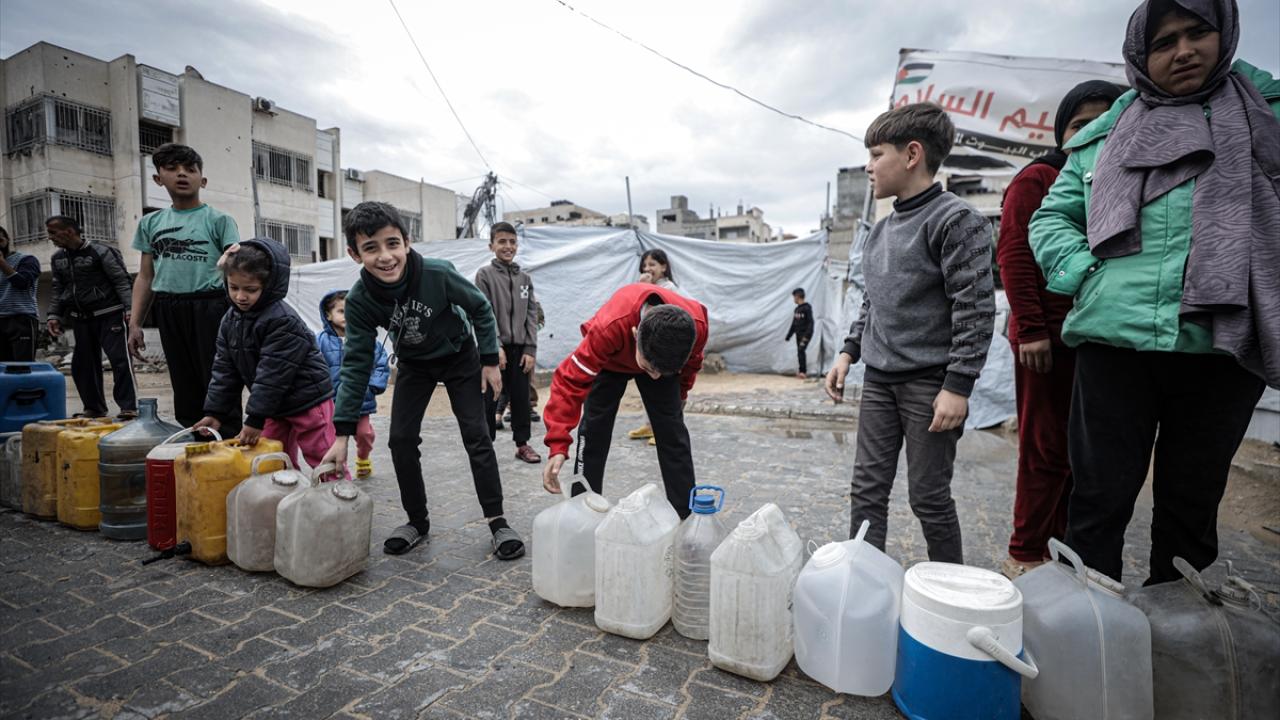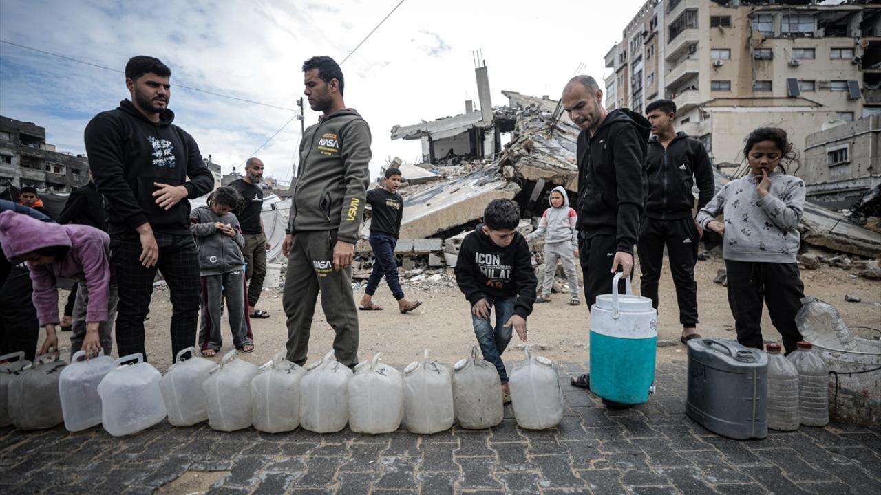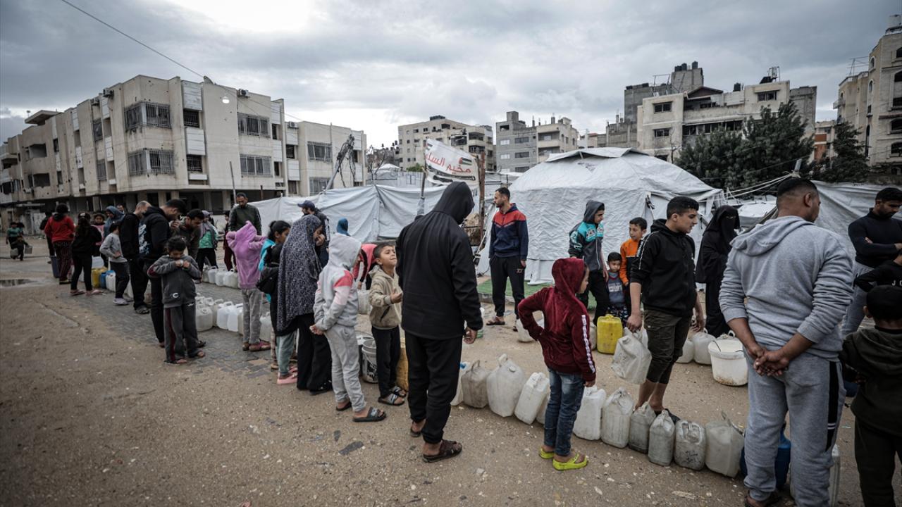 İsrail saldırıları sonucu altyapının ağır hasar görmesi sebebiyle su krizinin yaşandığı Gazze kentinin Rimal Mahallesi’nde Filistinliler, tankerlerin dağıttığı suları bidonlara doldurarak yaşam alanlarına taşıdı.