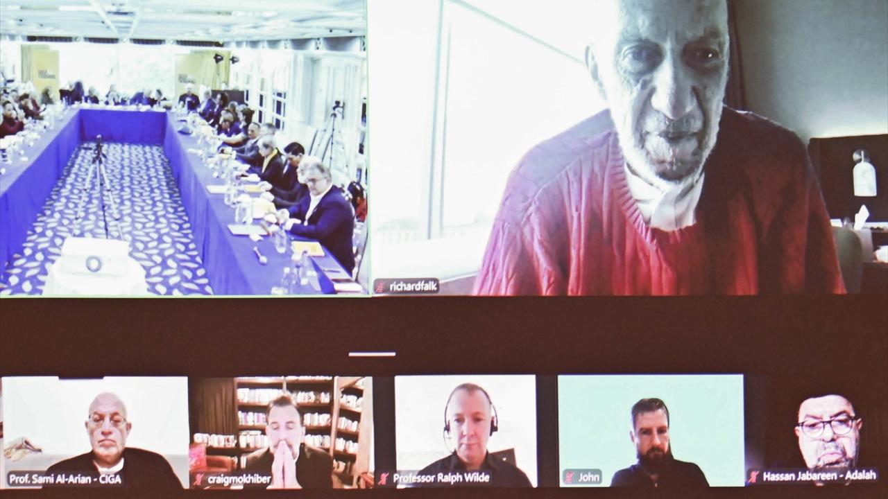 Eski Birleşmiş Milletler (BM) Filistin Özel Raportörü Richard Falk (sağ üst) da toplantıya çevrim içi olarak katıldı.
