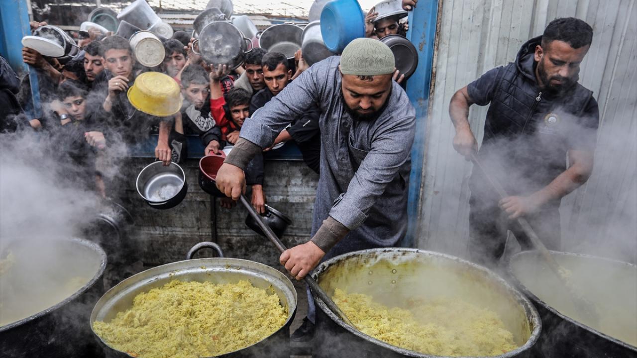 İsrail`in saldırılarından kaçarak Gazze Şeridi`nin güneyinde yer alan Han Yunus kentine sığınan Filistinlilere, hayır kurumları tarafından yemek dağıtımı yapıldı.