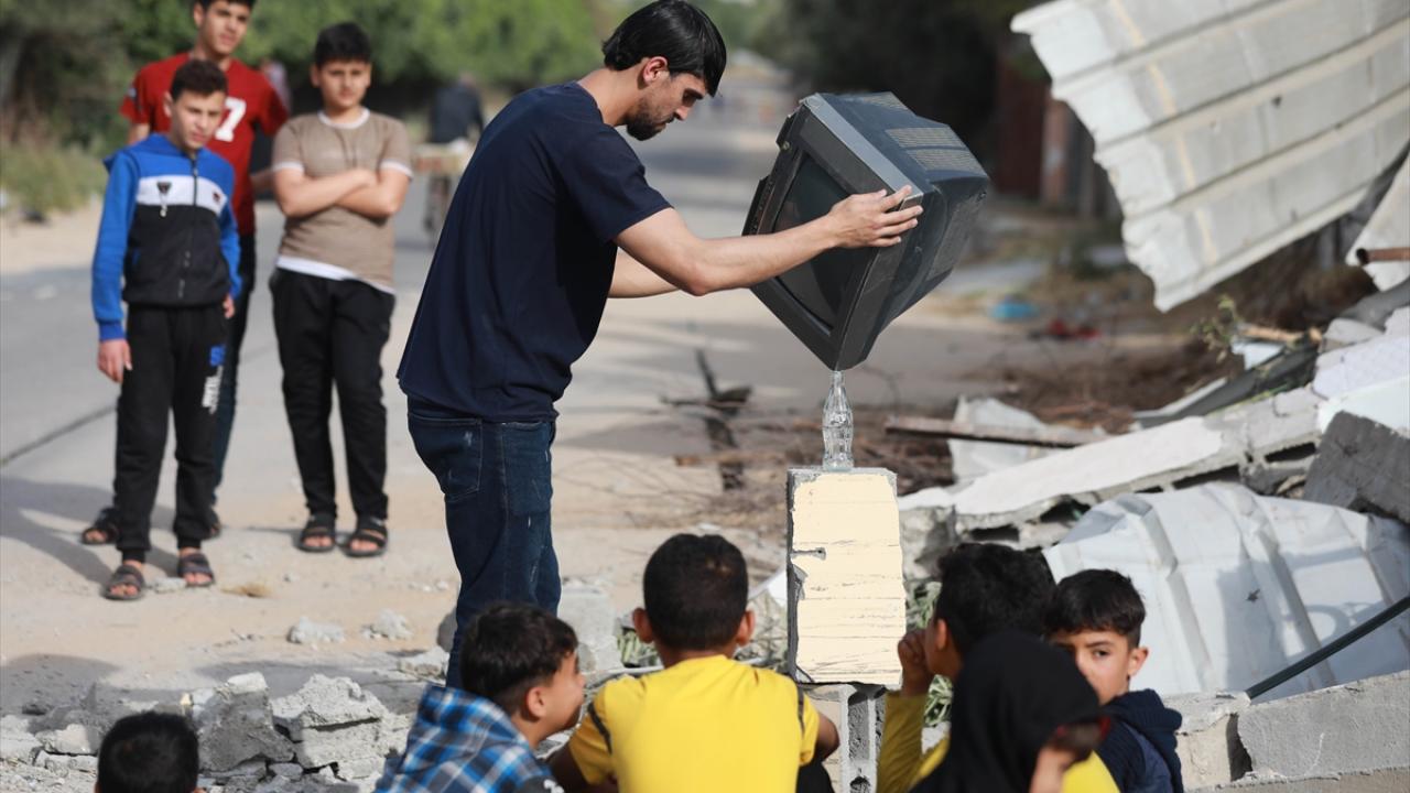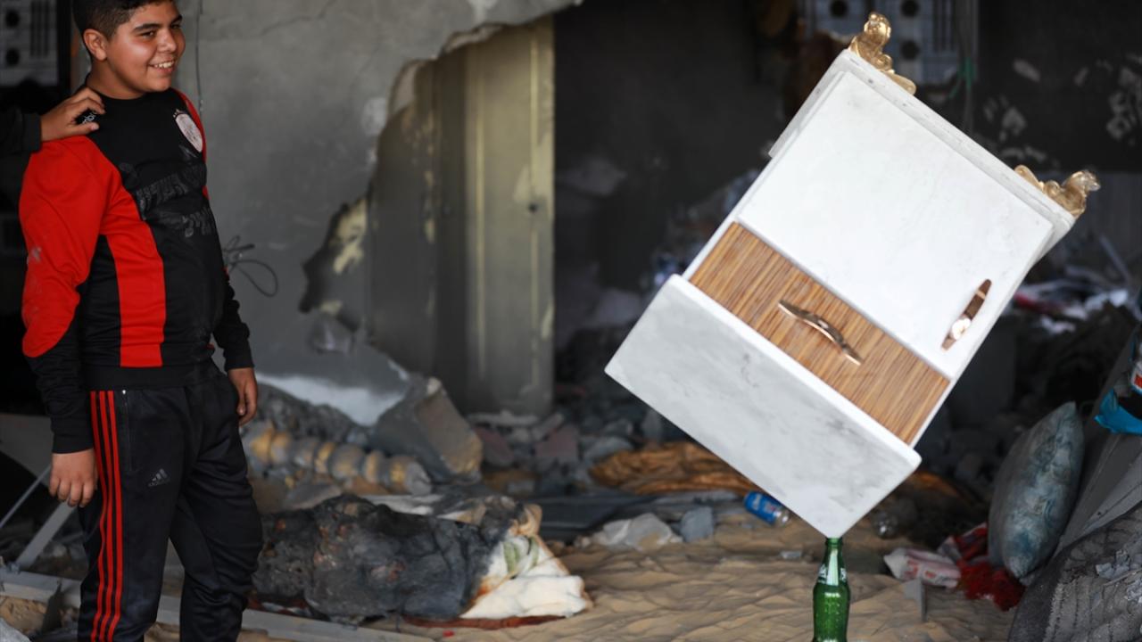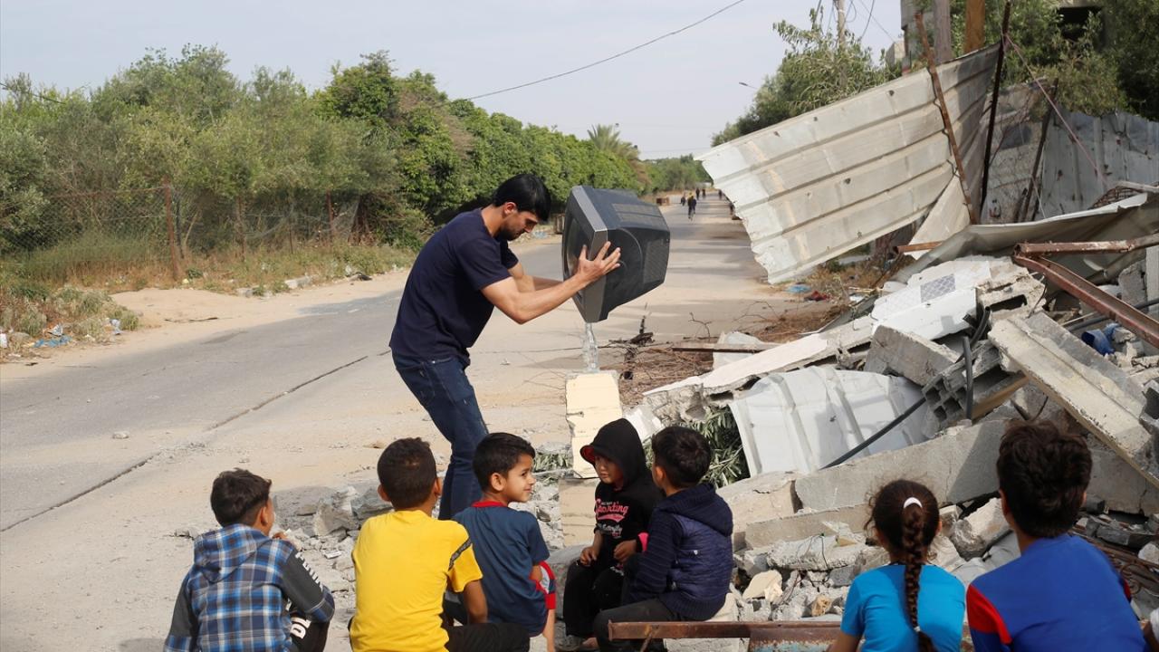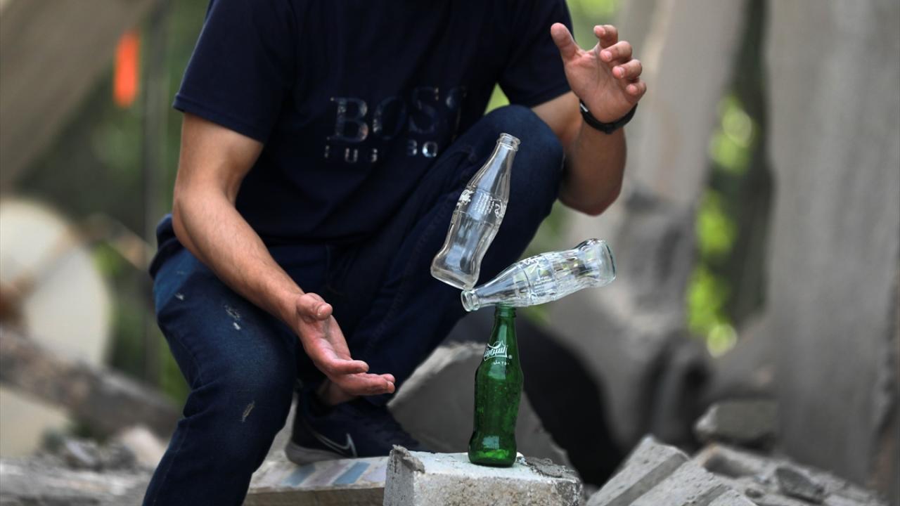 Filistinli Muhammad Al-Shanbari, İsrail'in Gazze'ye yönelik son saldırılarının ardından çocukların yüzlerini güldürmek ve savaşın olumsuz izlerini bir nebze unutturmak için denge gösterileri yapıyor.