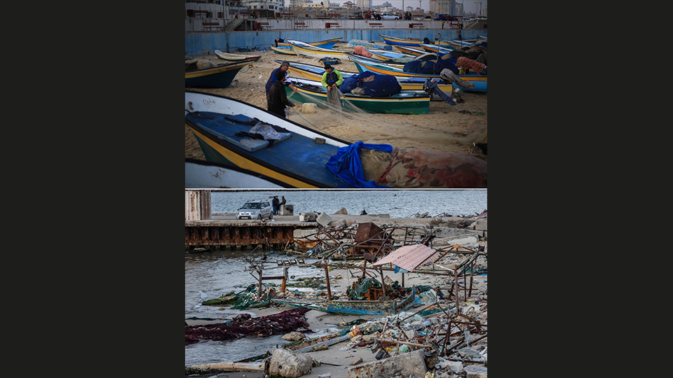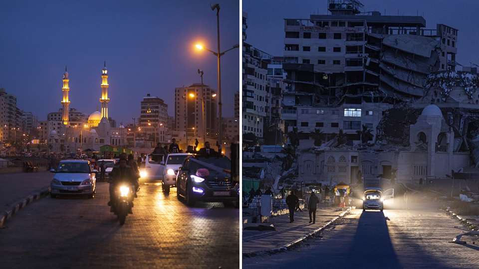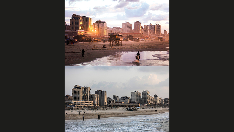 Fotoğraflarda, Gazze kentinin 7 Ekim öncesi ve sonrası uğradığı yıkım gözler önüne seriliyor.
