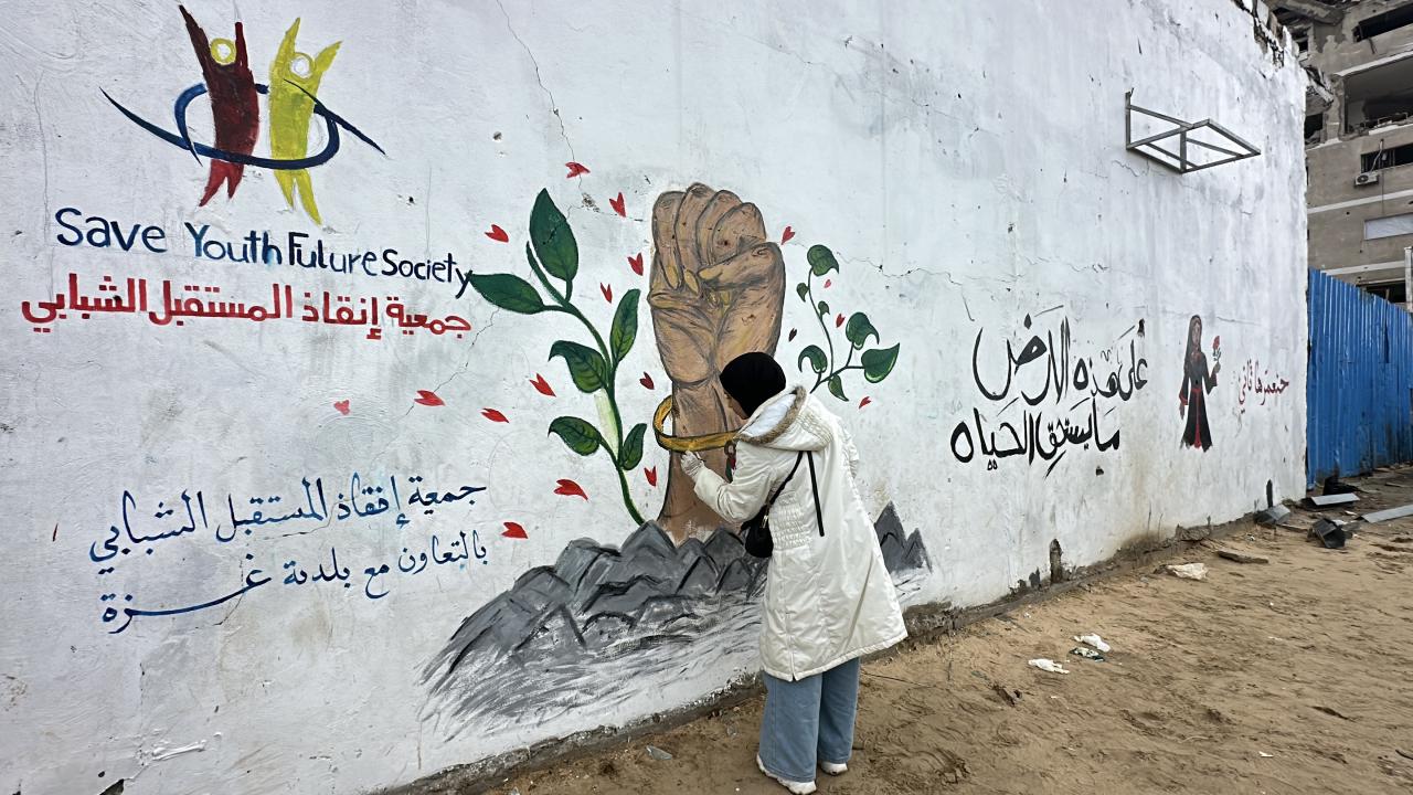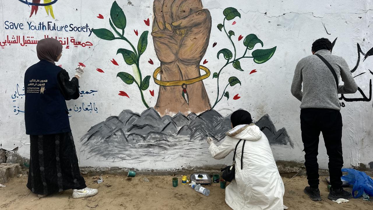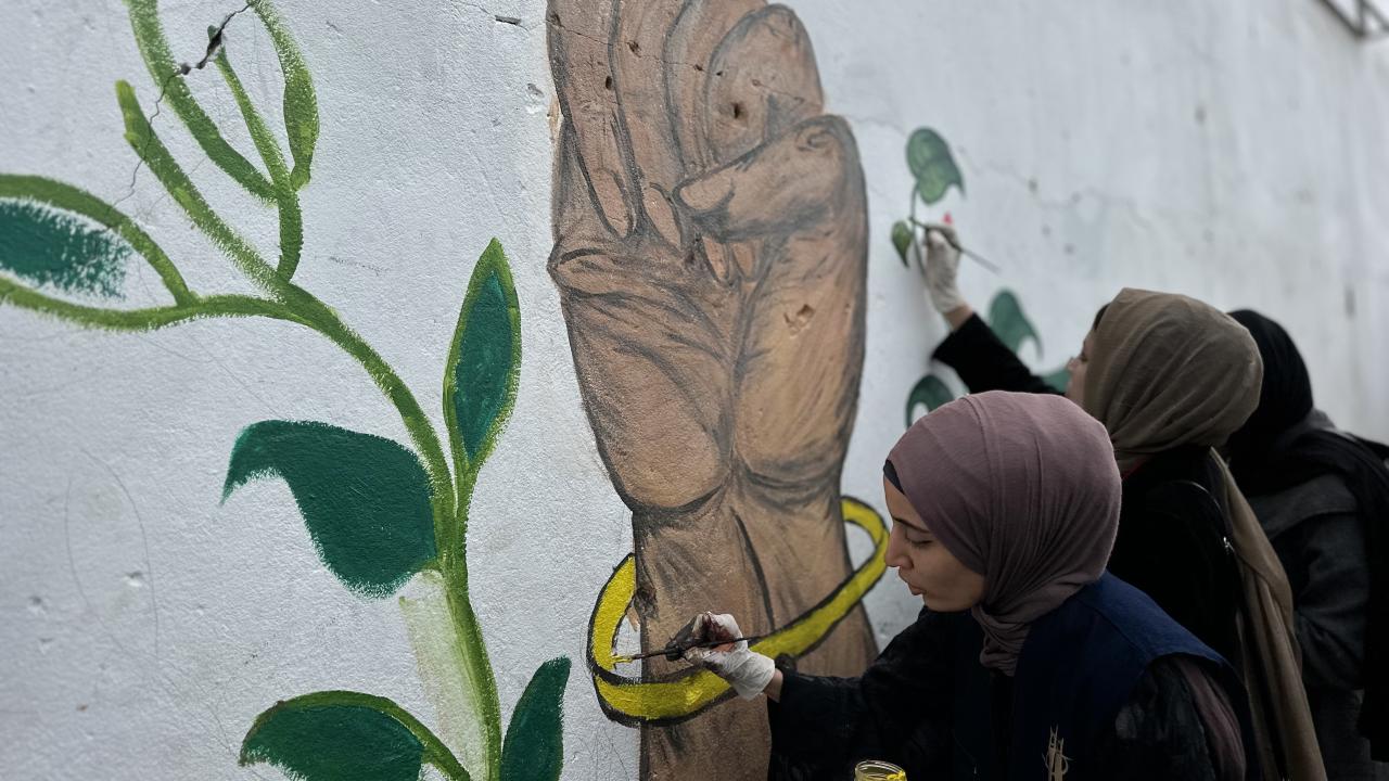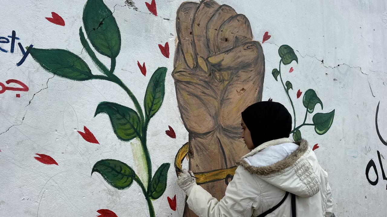 Bir grup Filistinli ressam, “Yeniden İnşa Edeceğiz” sloganını Gazze kentinde ayakta kalan bir duvara çizdi.