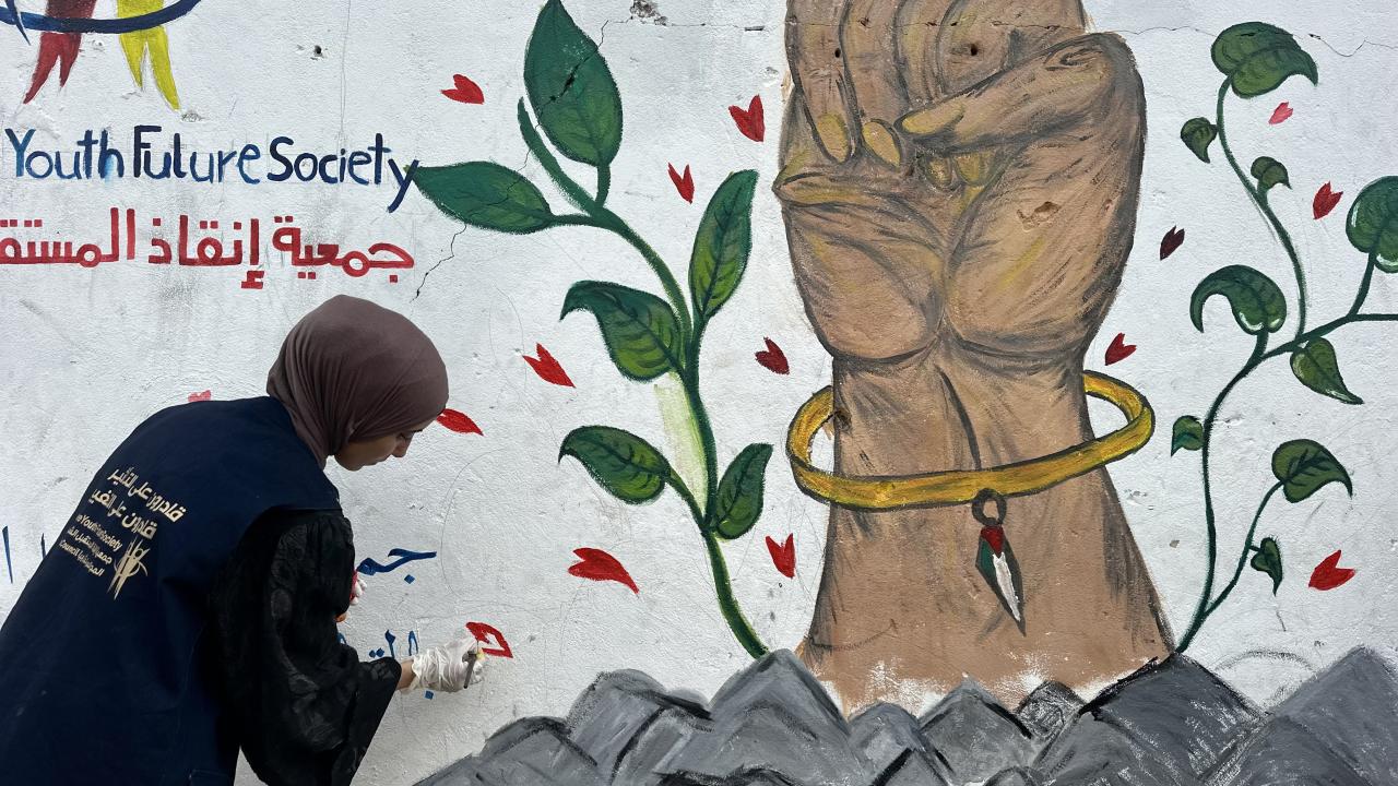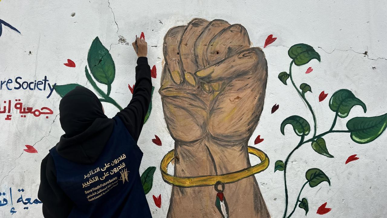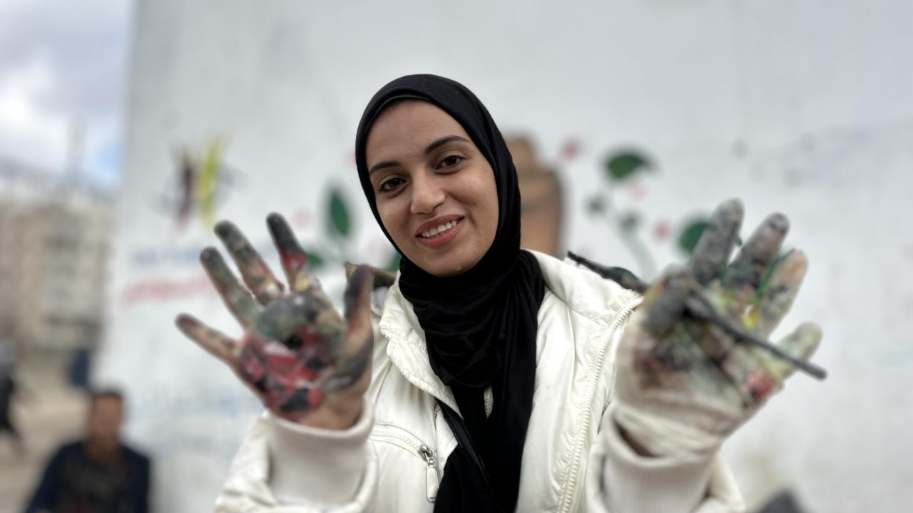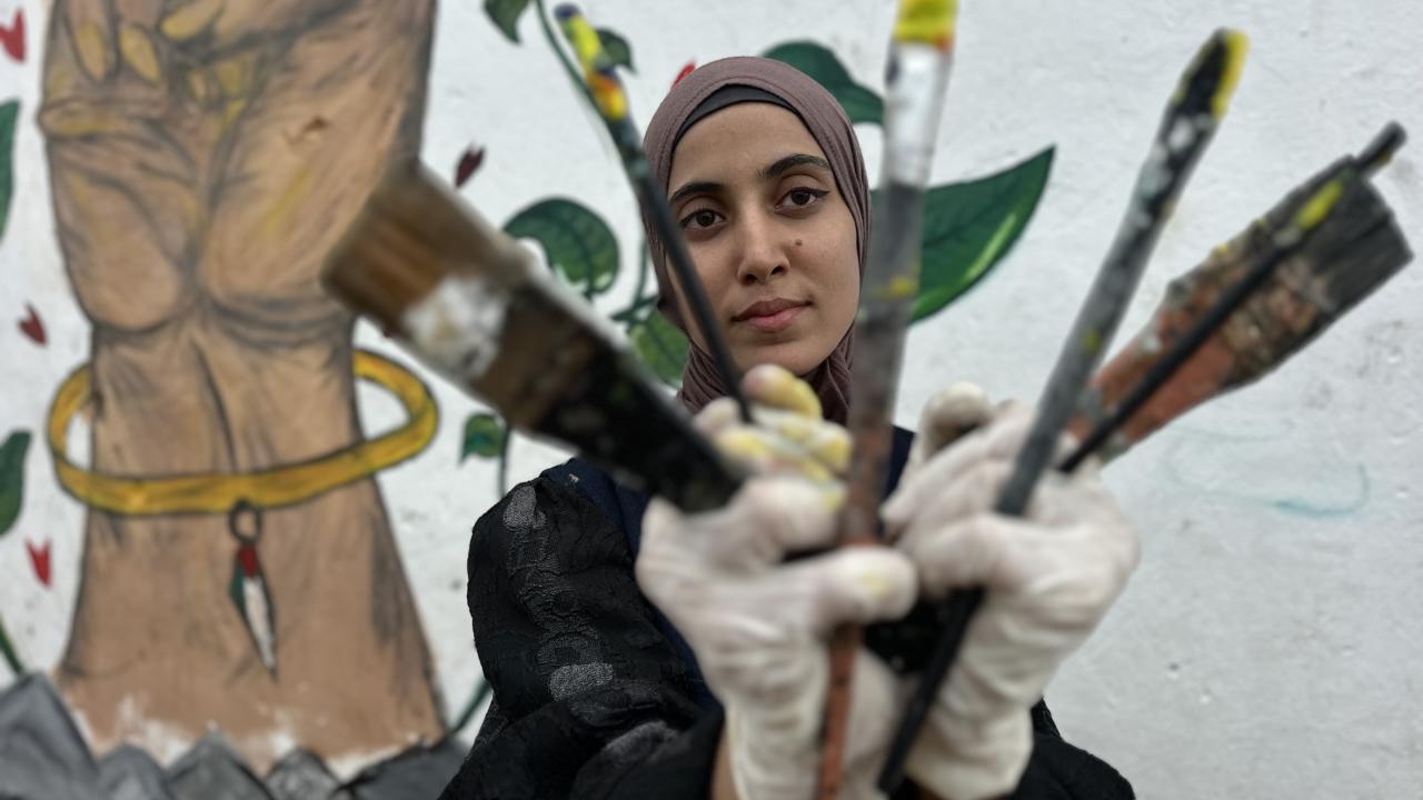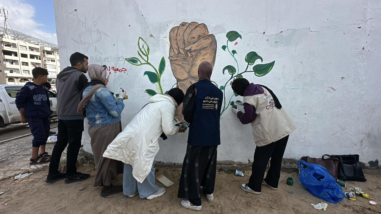 Bir grup Filistinli ressam, “Yeniden İnşa Edeceğiz” sloganını Gazze kentinde ayakta kalan bir duvara çizdi.