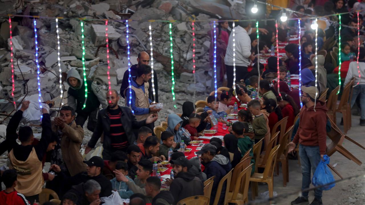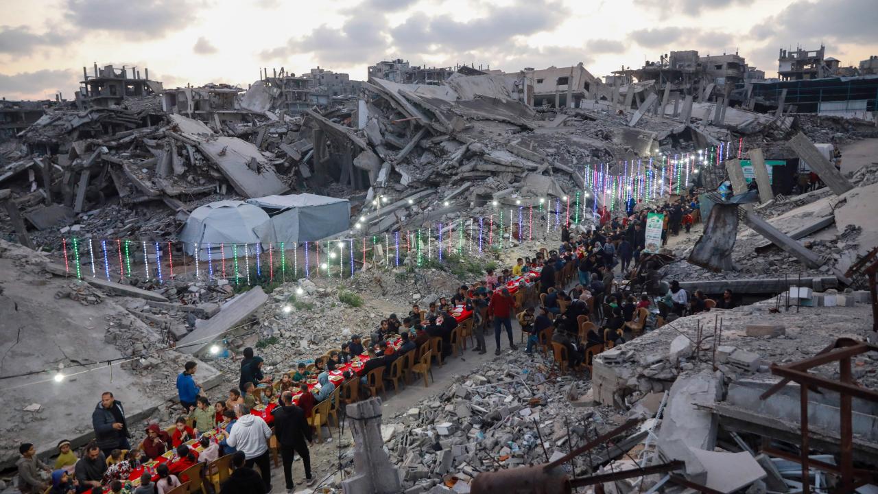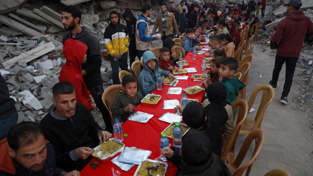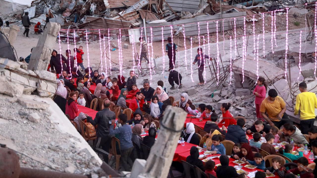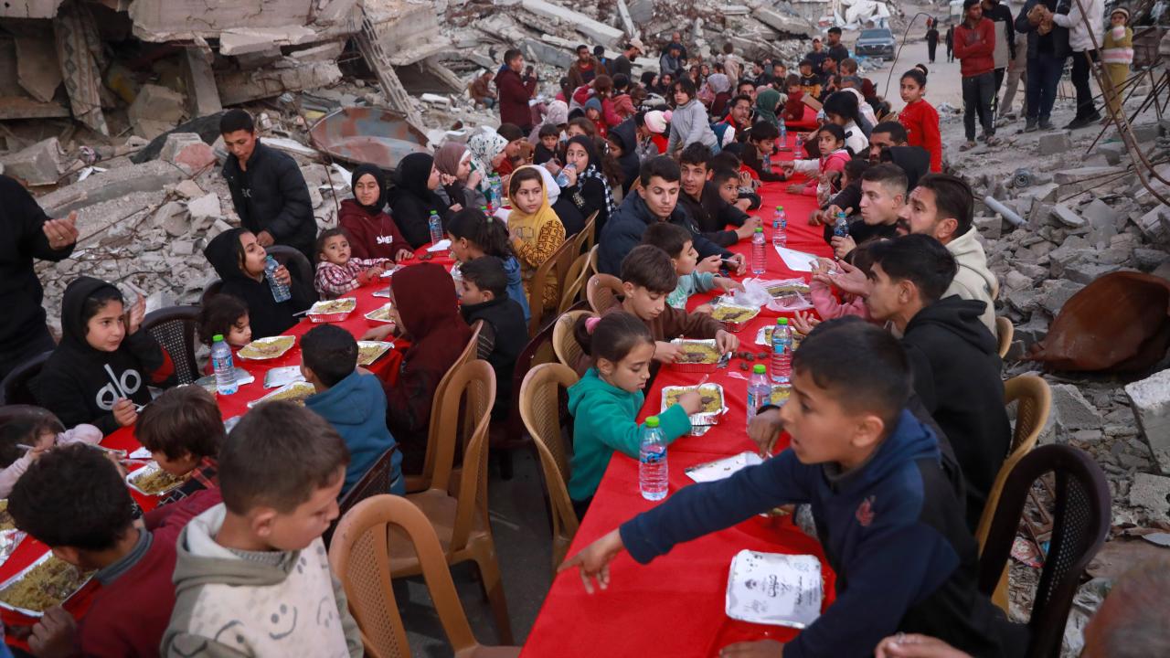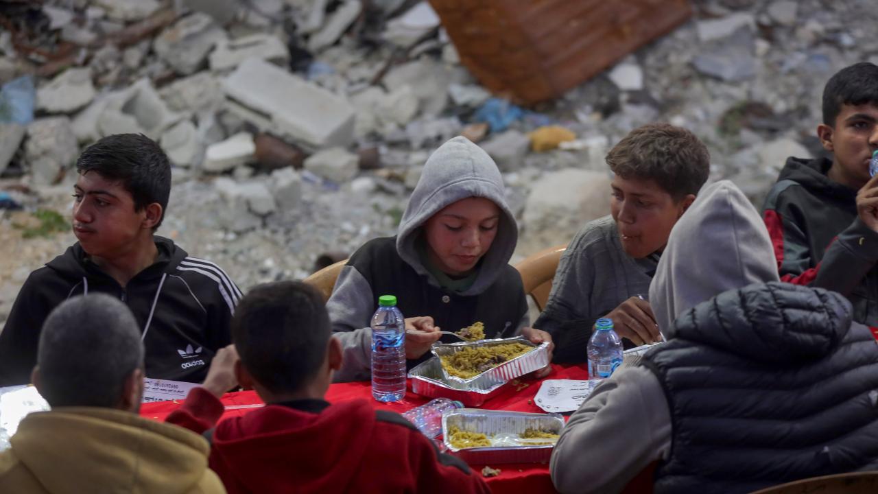 İsrail saldırılarında yıkıma uğrayan Gazze’nin Şeyh Radvan Mahallesi’nde, bir hayır kurumu tarafından toplu iftar programı düzenlendi. Yıkılan binalar arasında bir araya gelen Filistinliler, birlikte oruçlarını açtı.