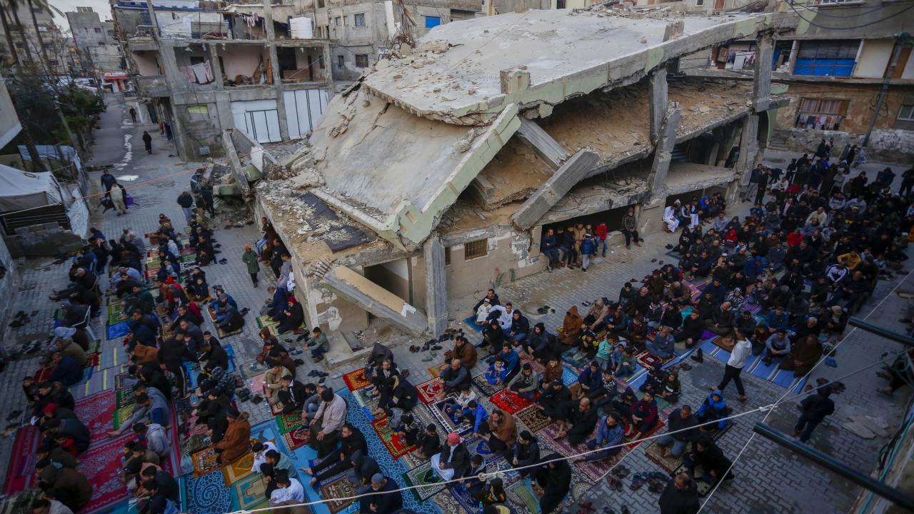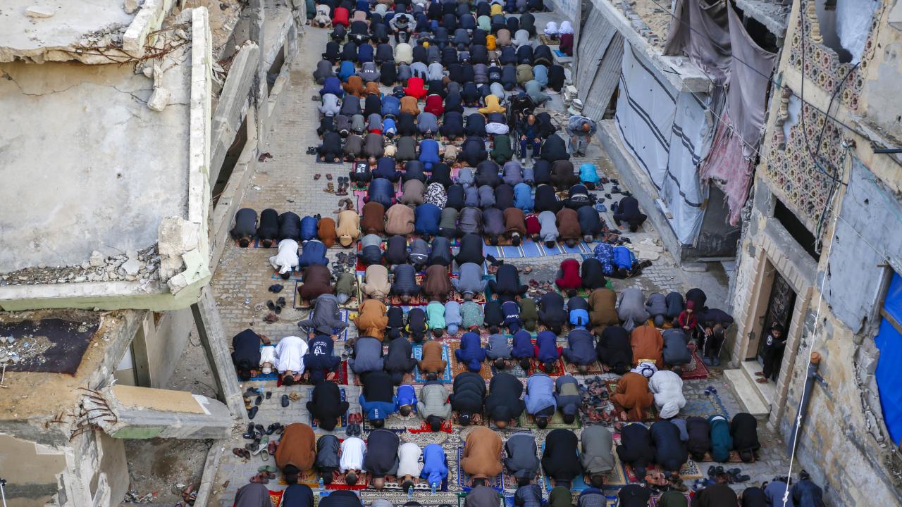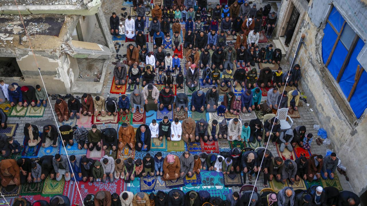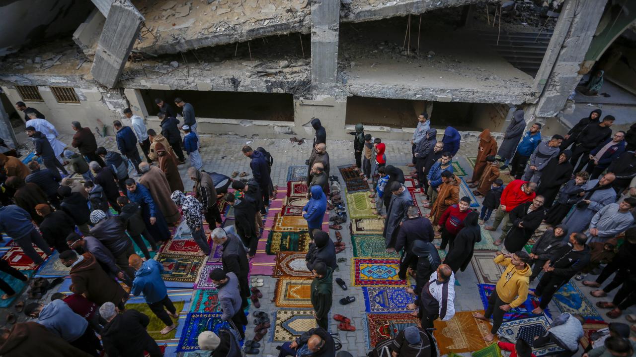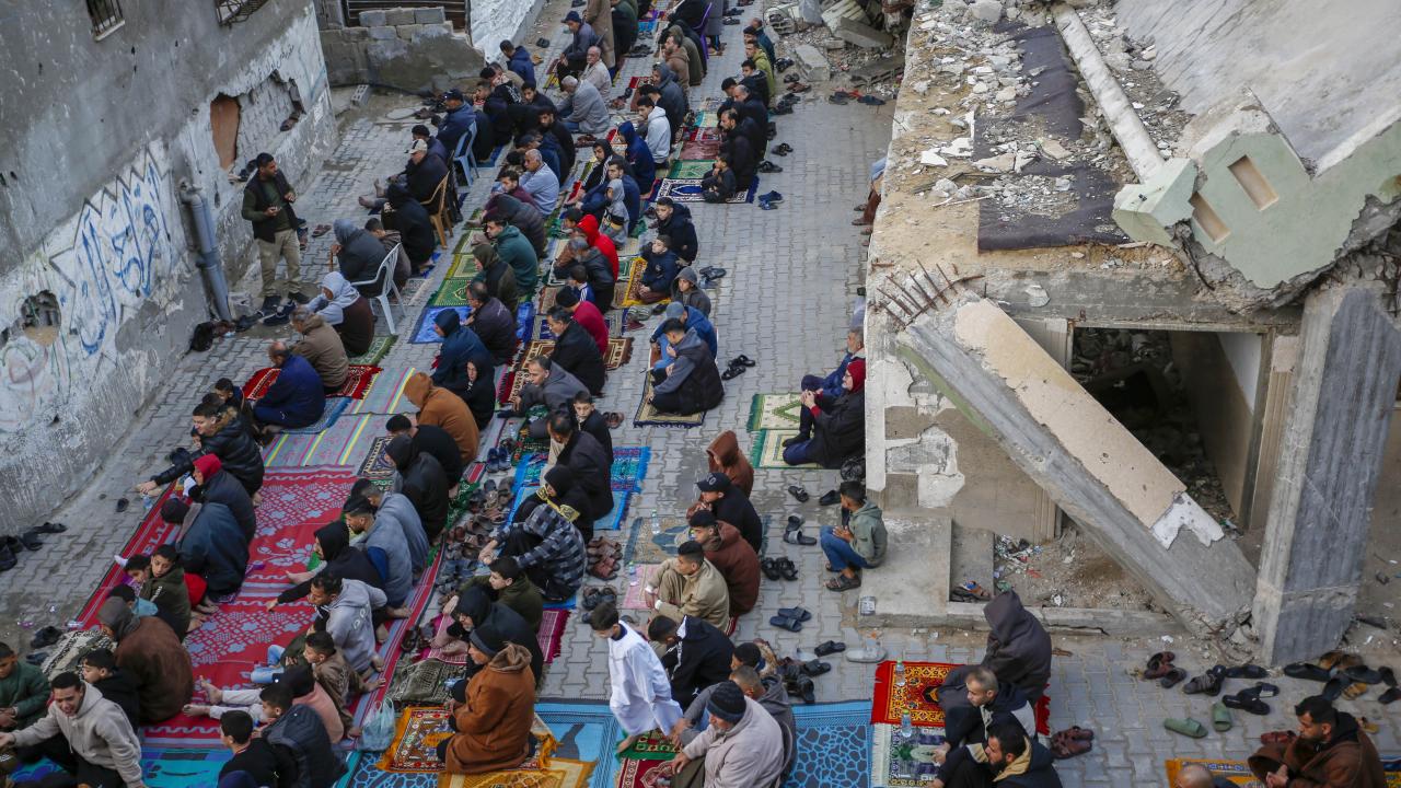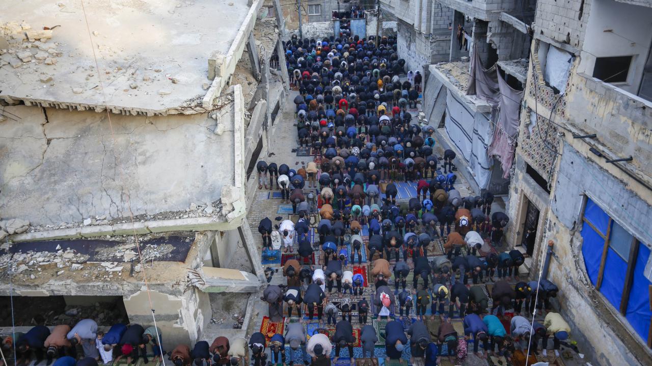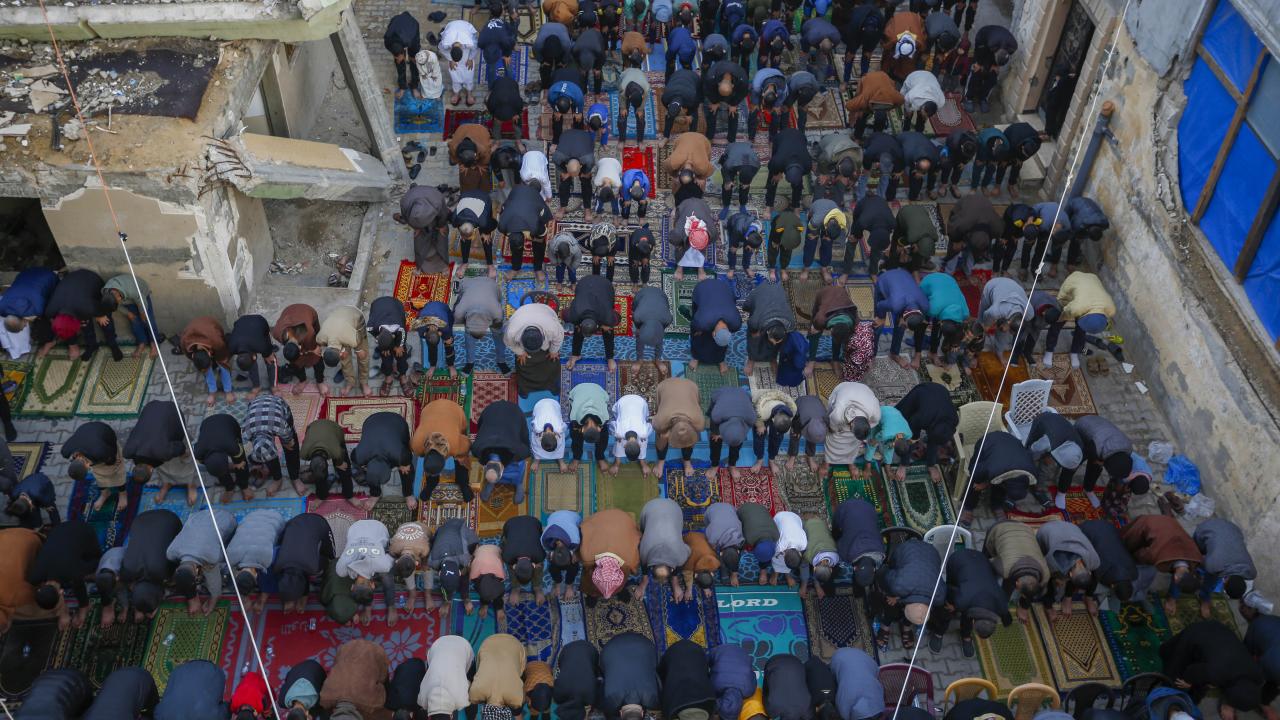 Gazze Şeridi'nin güneyindeki Refah kentindeki Filistinliler, Ramazan Bayramı namazını İsrail saldırılarında yıkılan İbn-i Teymiyye Camii enkazında ve çevresinde kıldı.