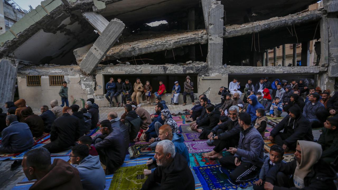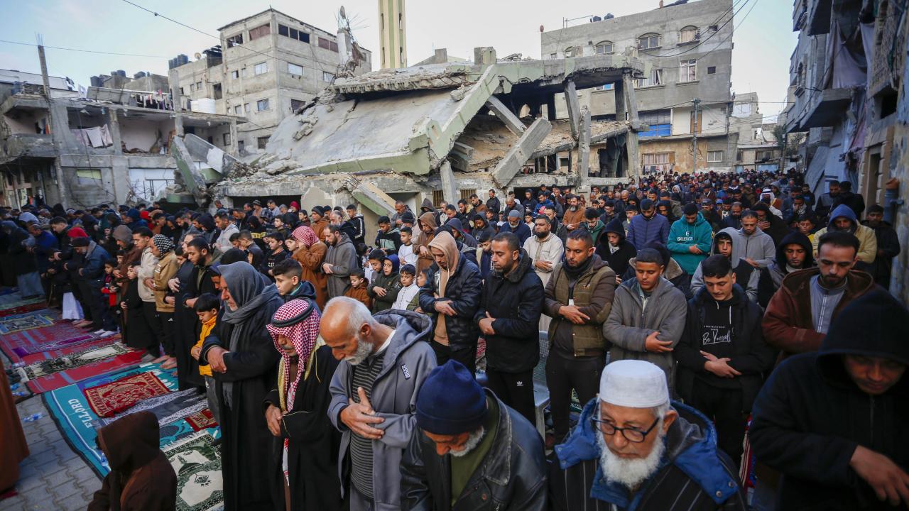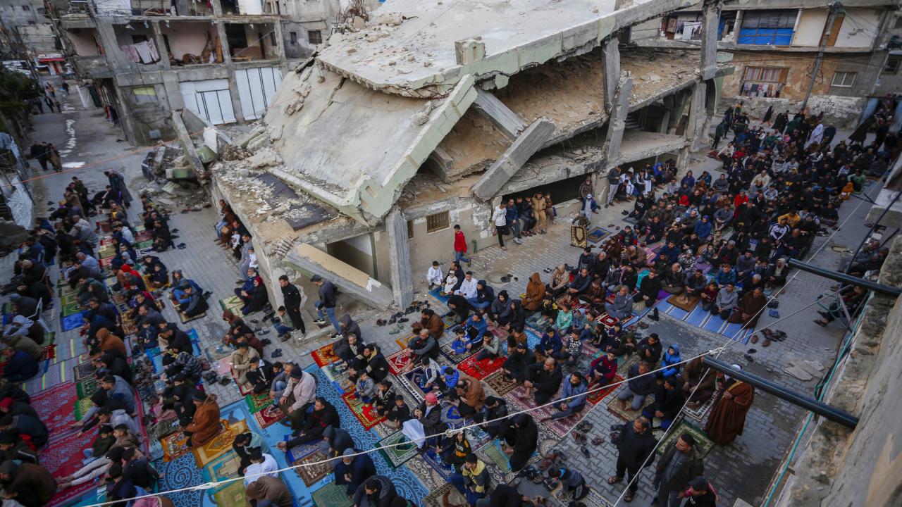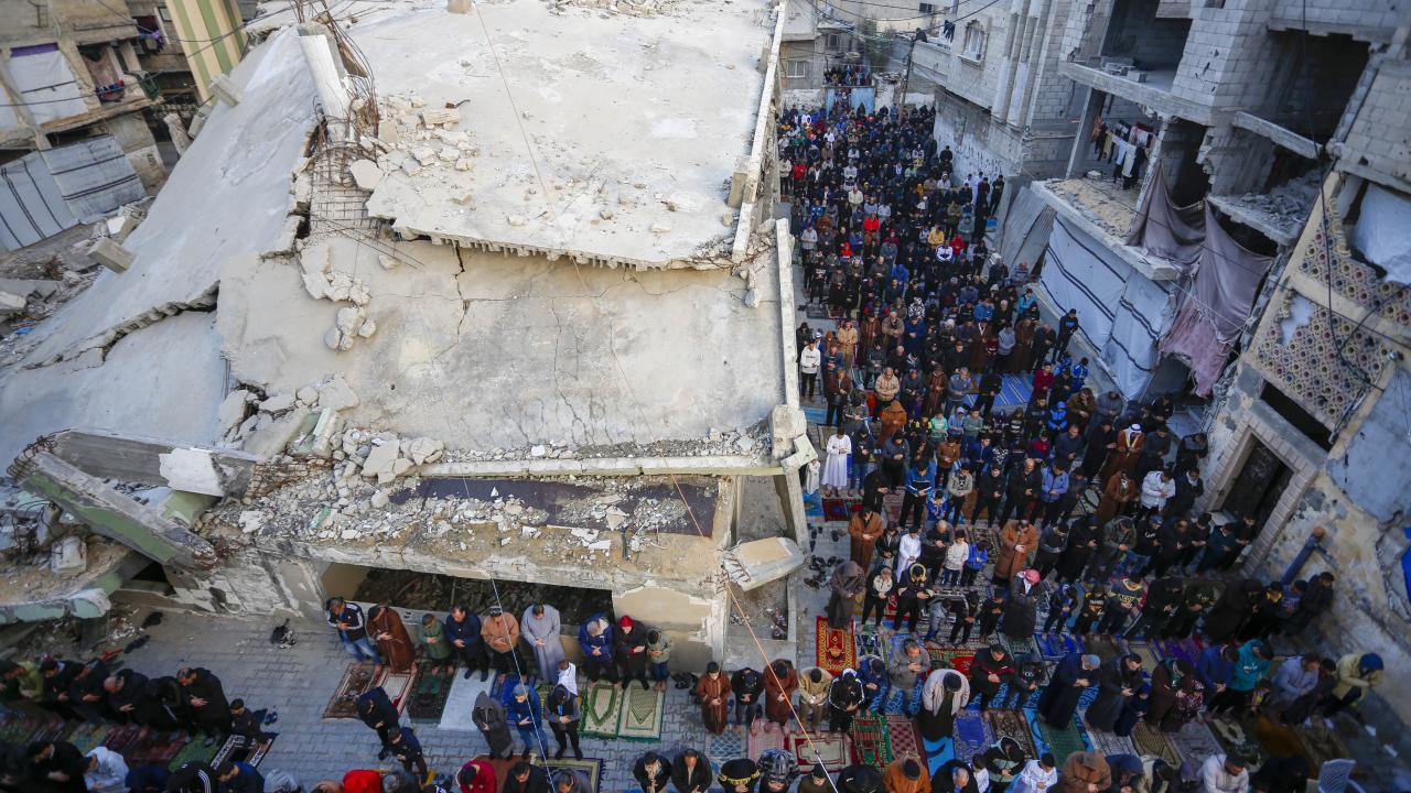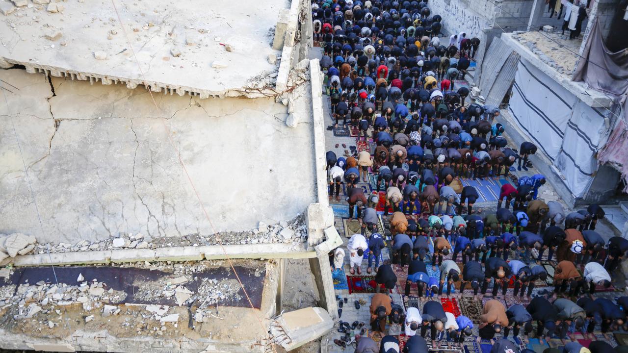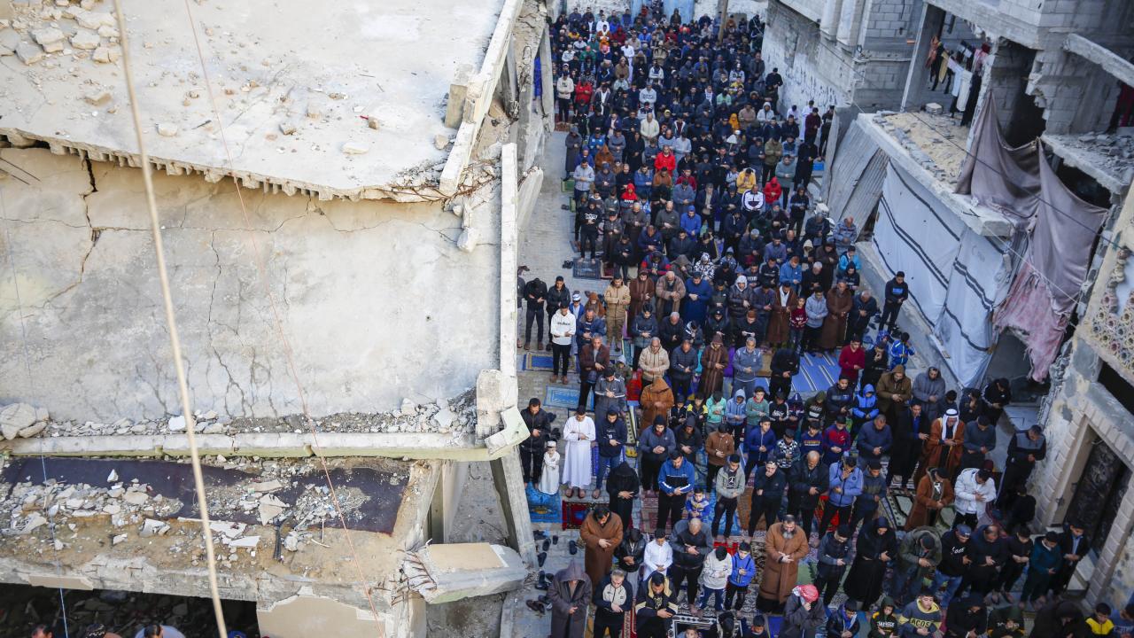 Gazze Şeridi'nin güneyindeki Refah kentindeki Filistinliler, Ramazan Bayramı namazını İsrail saldırılarında yıkılan İbn-i Teymiyye Camii enkazında ve çevresinde kıldı.