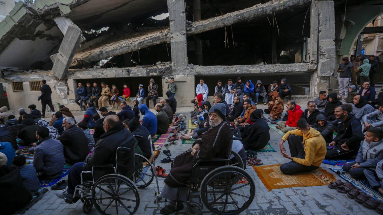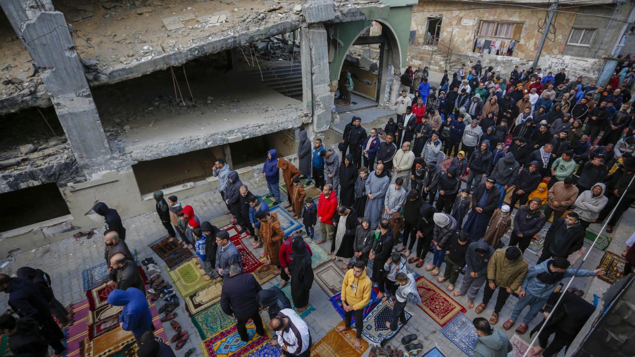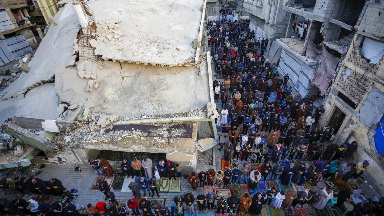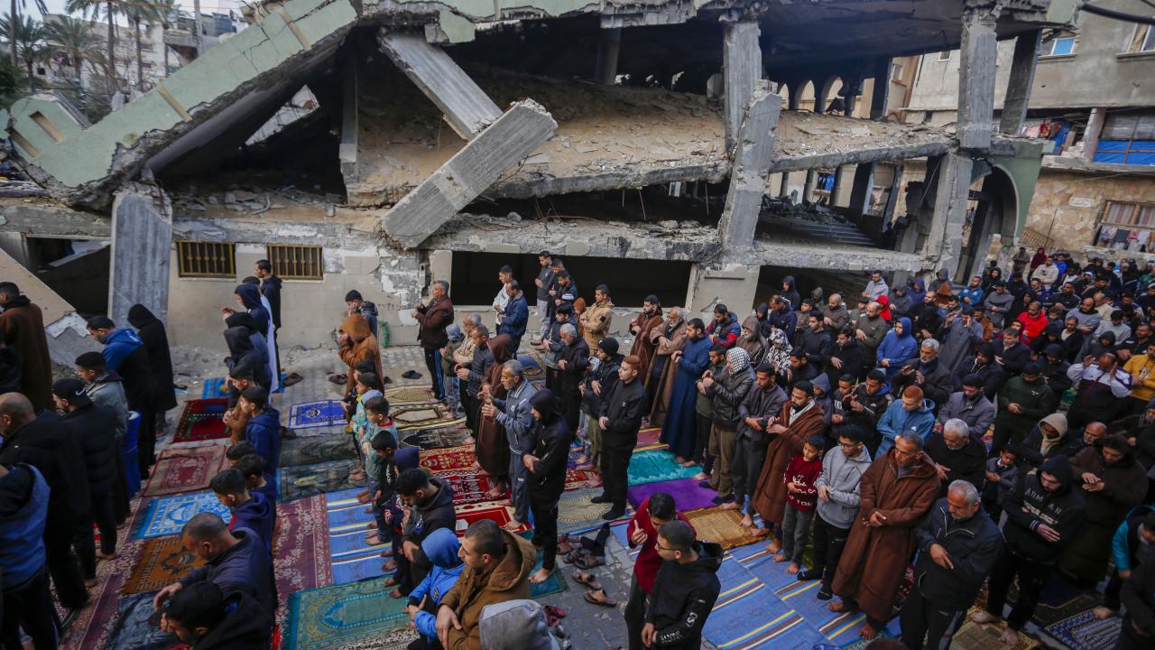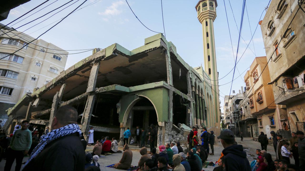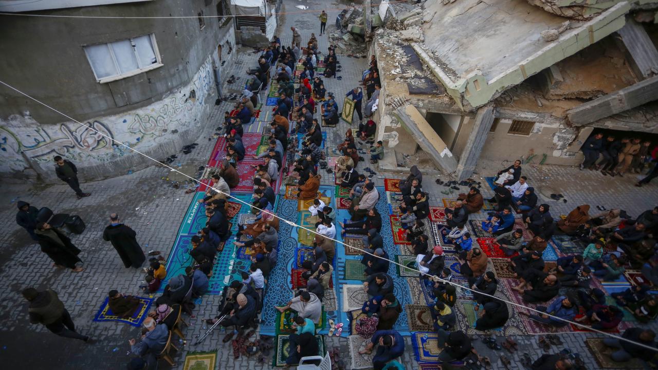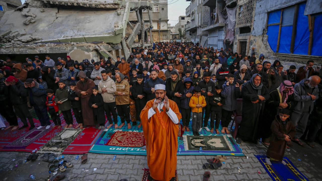 Gazze Şeridi'nin güneyindeki Refah kentindeki Filistinliler, Ramazan Bayramı namazını İsrail saldırılarında yıkılan İbn-i Teymiyye Camii enkazında ve çevresinde kıldı.