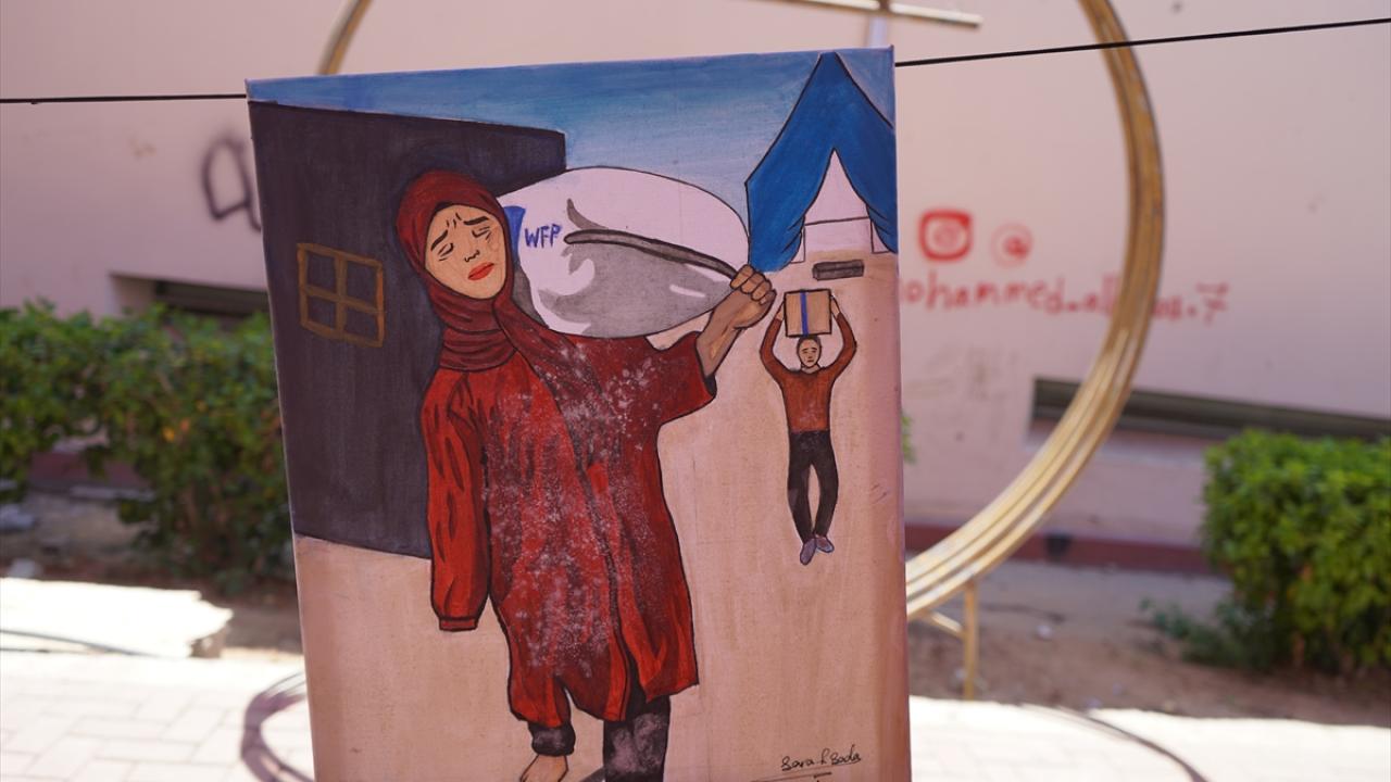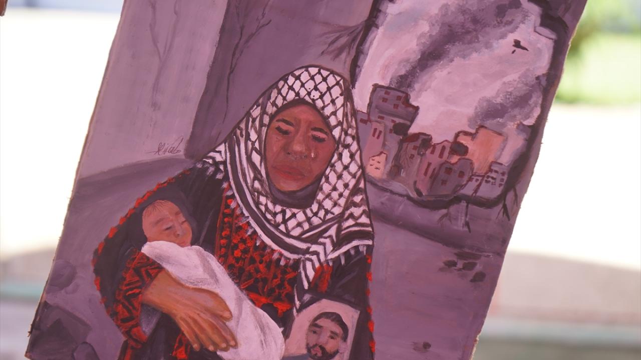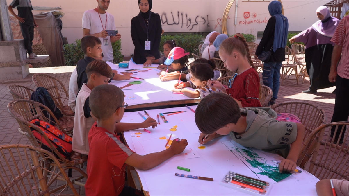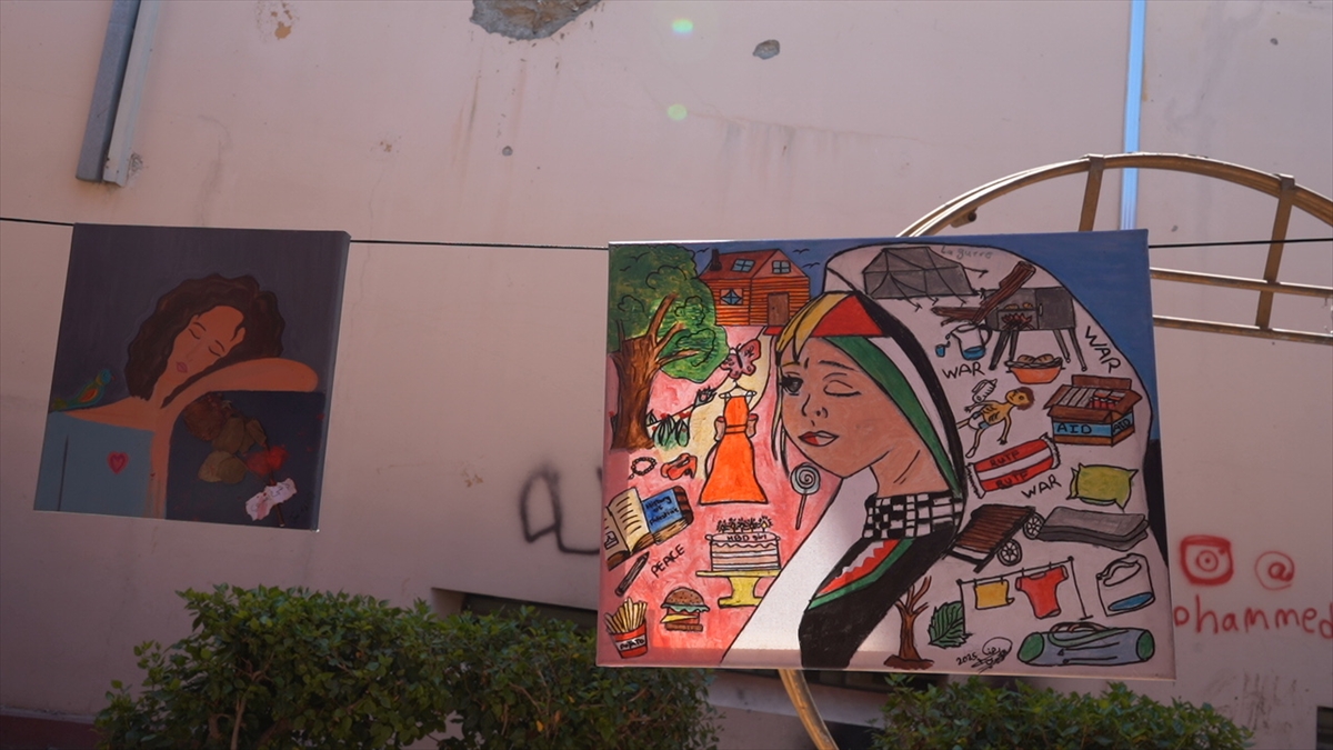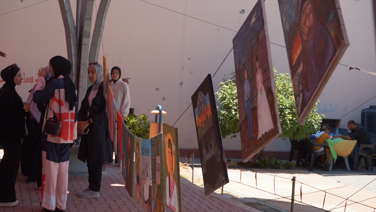 Gazze Belediyesi’ne bağlı Çocuk Esenliği Merkezi tarafından başlatılan “Nefes Al ve Resmet” adlı girişim kapsamında, merkezin savaşta yıkılan binası önünde bir resim ve fotoğraf sergisi düzenlendi.