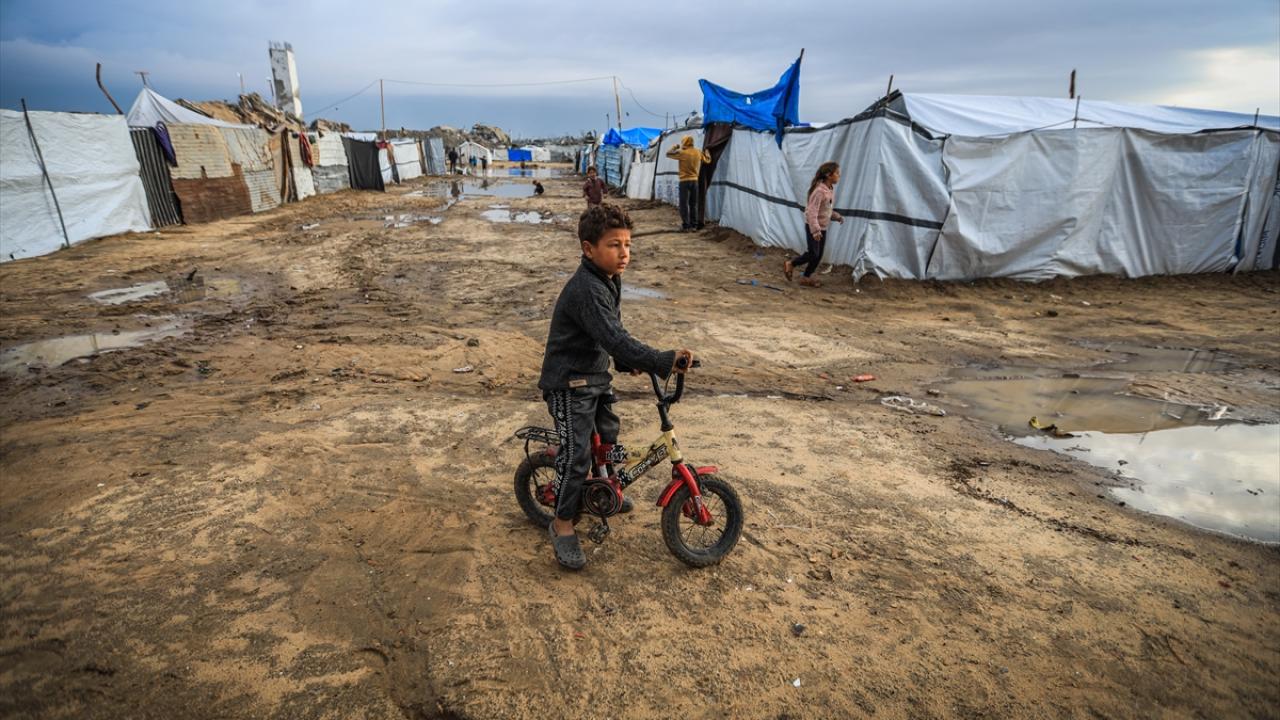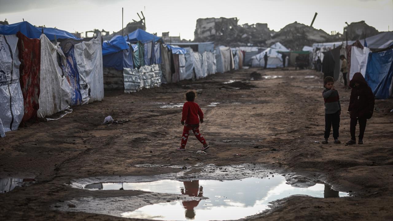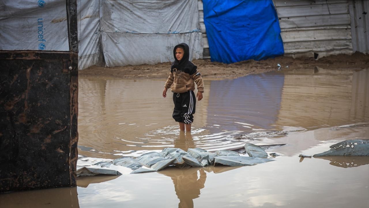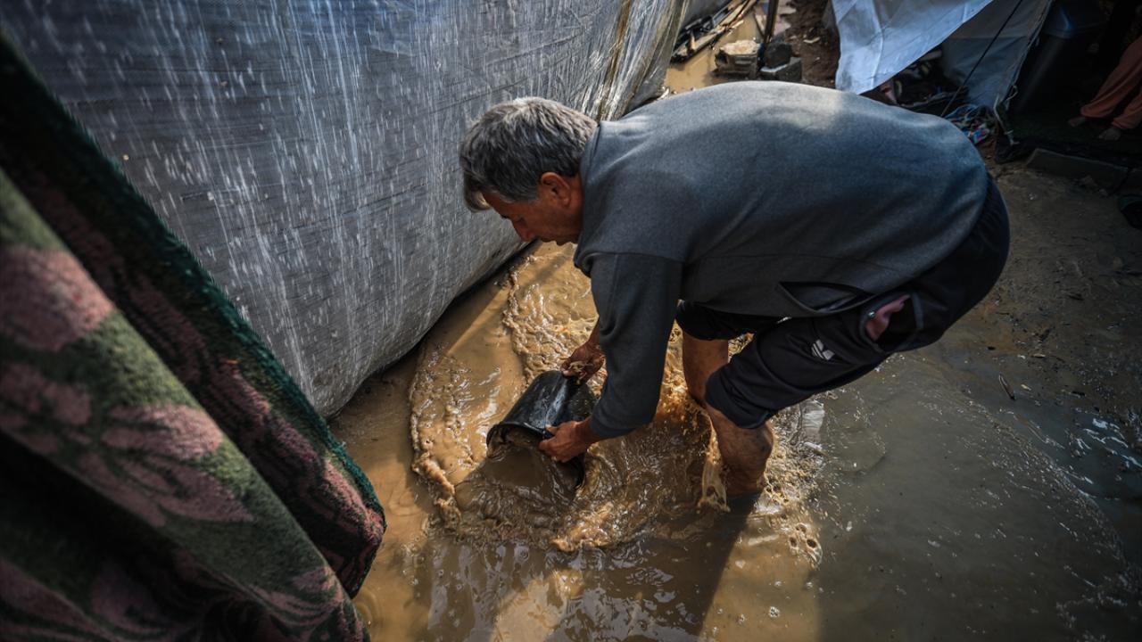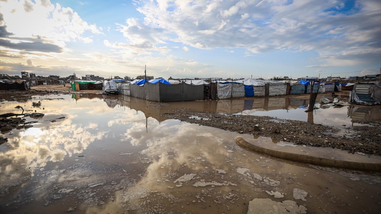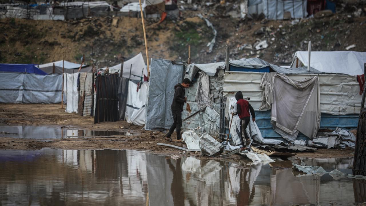 Yağış sonrası su ve çamur birikintilerinin oluştuğu bölgede yaşamlarını sürdüren ve İsrail`in saldırıları nedeniyle evleri yıkılan Filistinliler kötü hava koşullarıyla da mücadele ediyor.