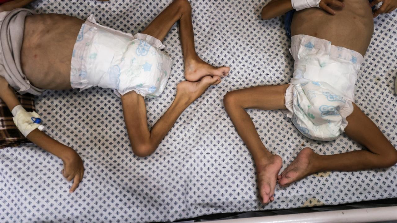 İsrail’in açlığa mahkum ettiği Gazze kentindeki Hasta Dostları Hastanesi’nde tedavi gören 3 yaşındaki Muhammed Mehre ile 4 yaşındaki kardeşi Uday Mehre, ağır yetersiz beslenme nedeniyle hayati tehlike altında.