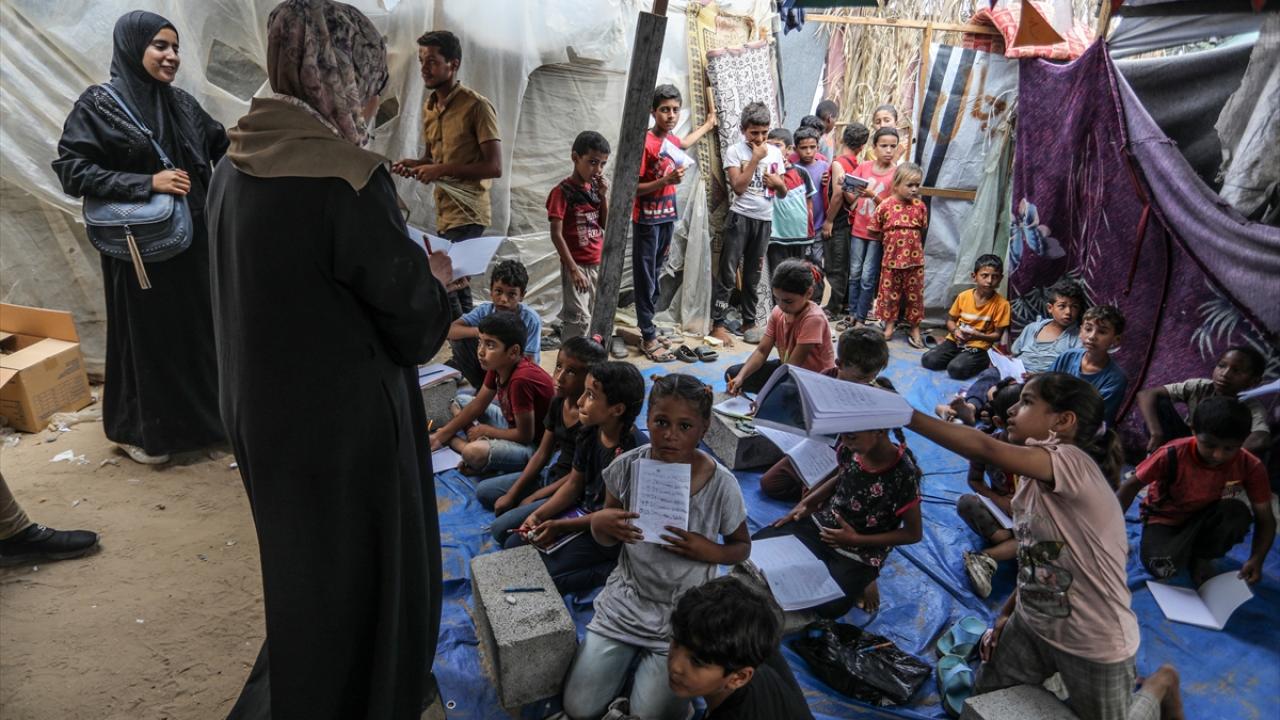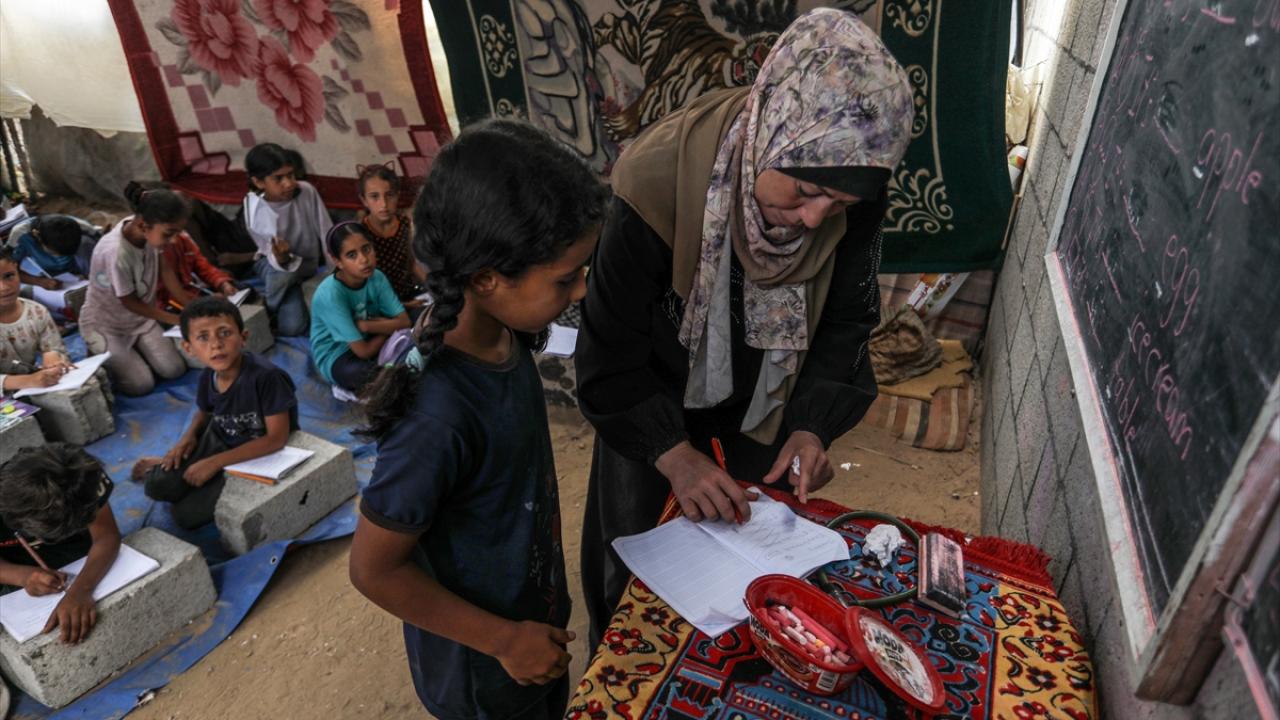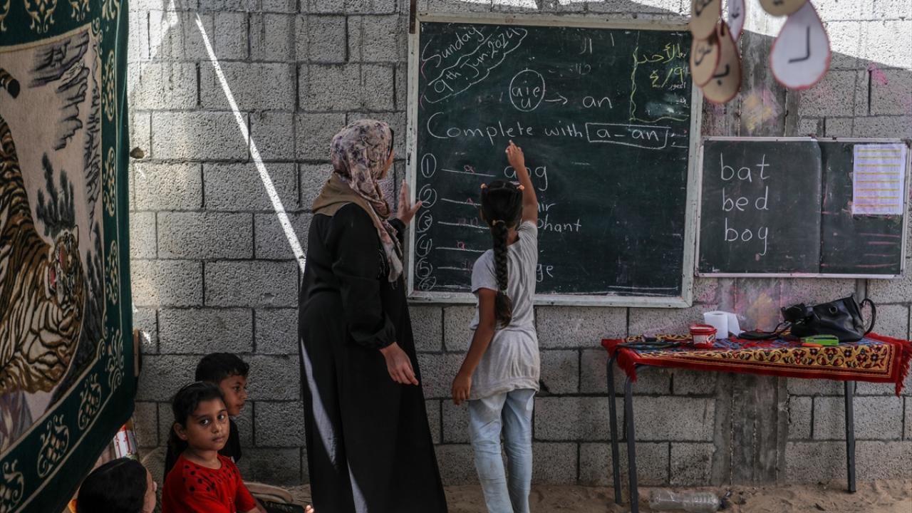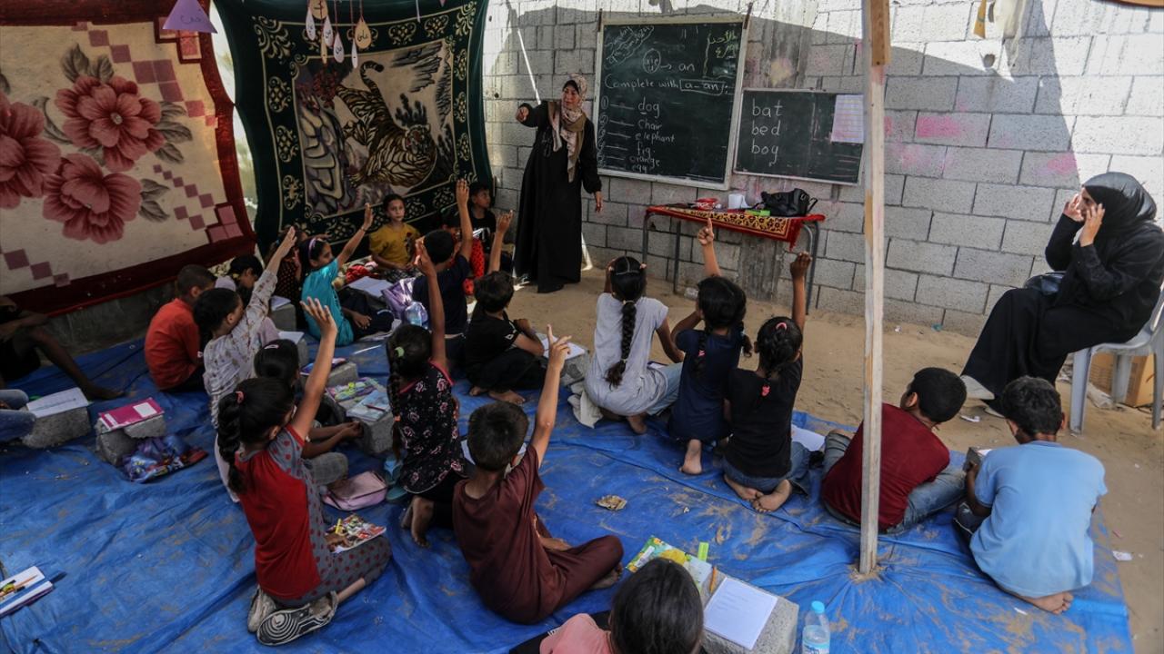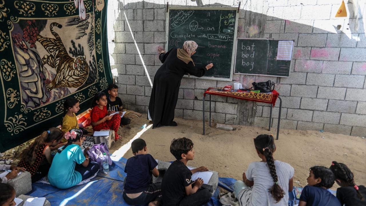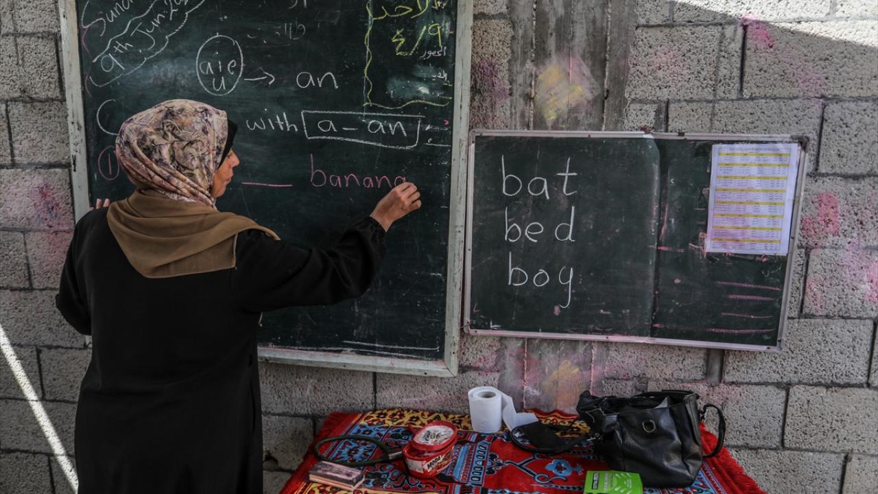 Öğretmen Heba Al-Jamasi, İsrail'in düzenlediği saldırılar nedeniyle eğitimden mahrum kalan Filistinli çocukların eğitimlerini sürdürebilmeleri için Gazze Şeridi'nin orta kesiminde Deyr el-Balah kentindeki çadır kampta kısıtlı imkanlarla İngilizce dersi veriyor.