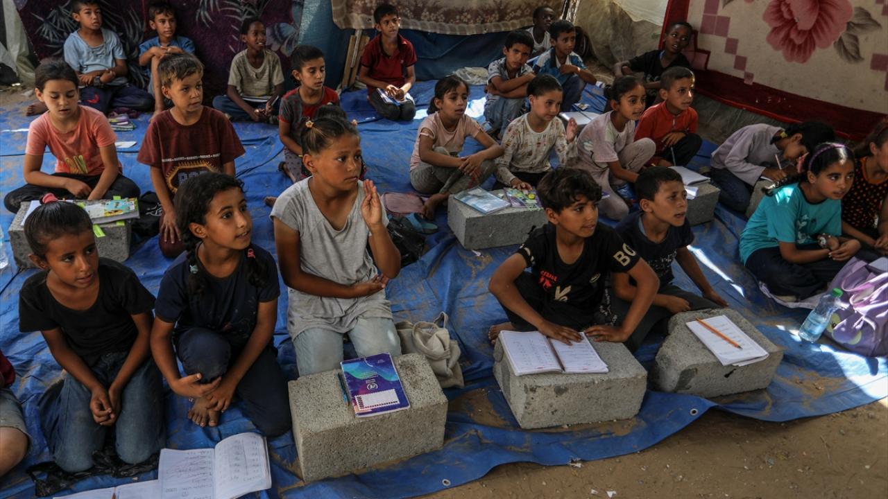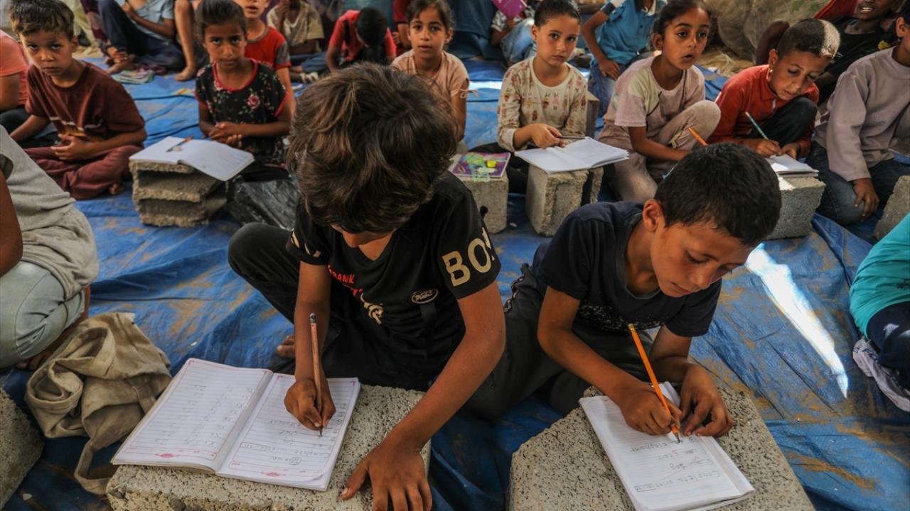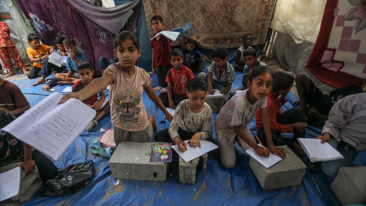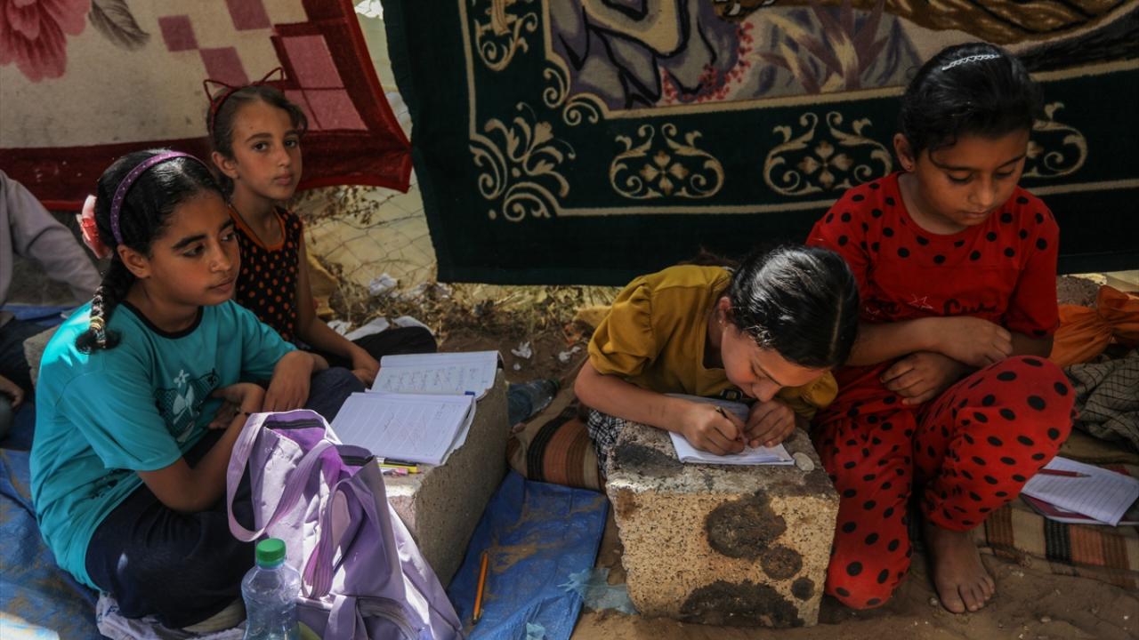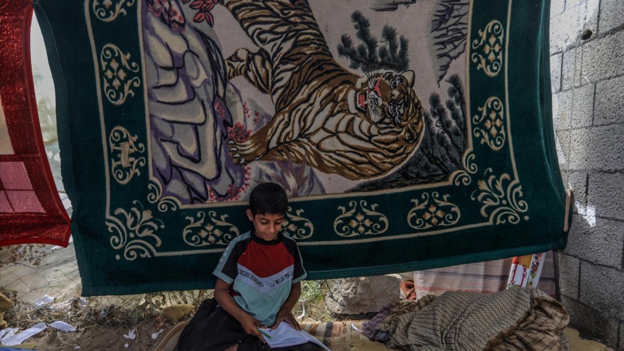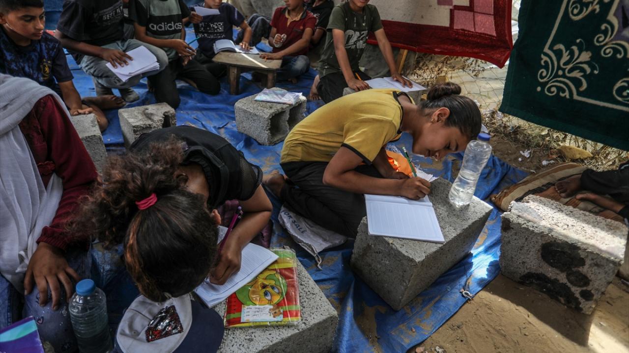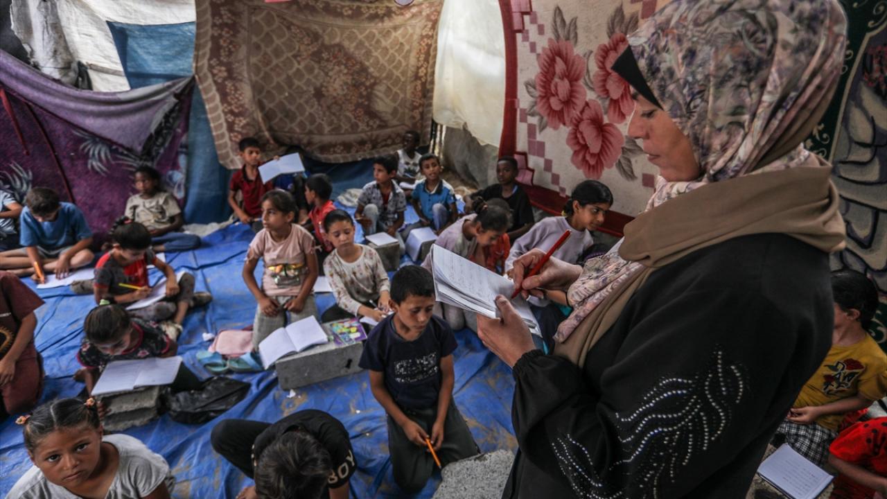 Öğretmen Heba Al-Jamasi, İsrail'in düzenlediği saldırılar nedeniyle eğitimden mahrum kalan Filistinli çocukların eğitimlerini sürdürebilmeleri için Gazze Şeridi'nin orta kesiminde Deyr el-Balah kentindeki çadır kampta kısıtlı imkanlarla İngilizce dersi veriyor.