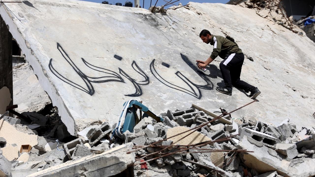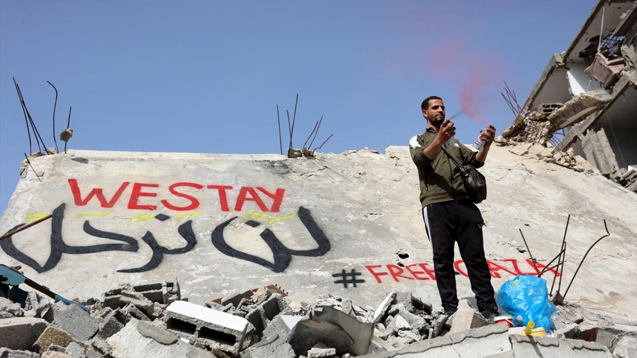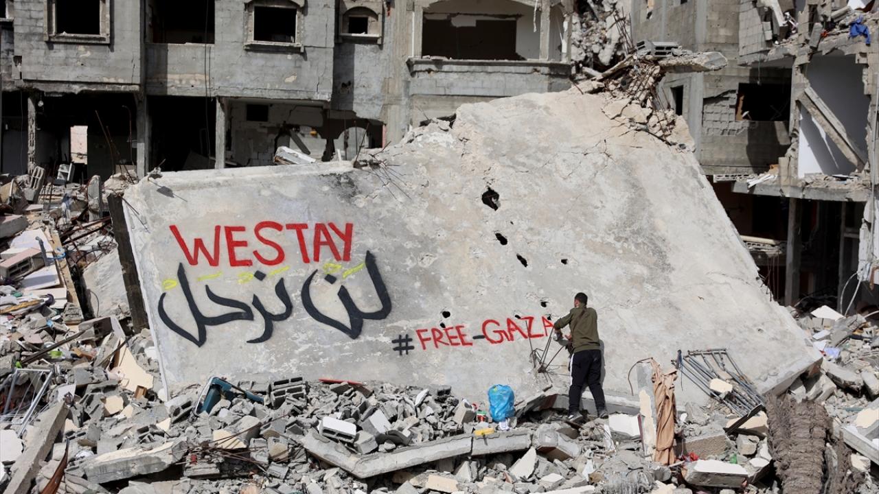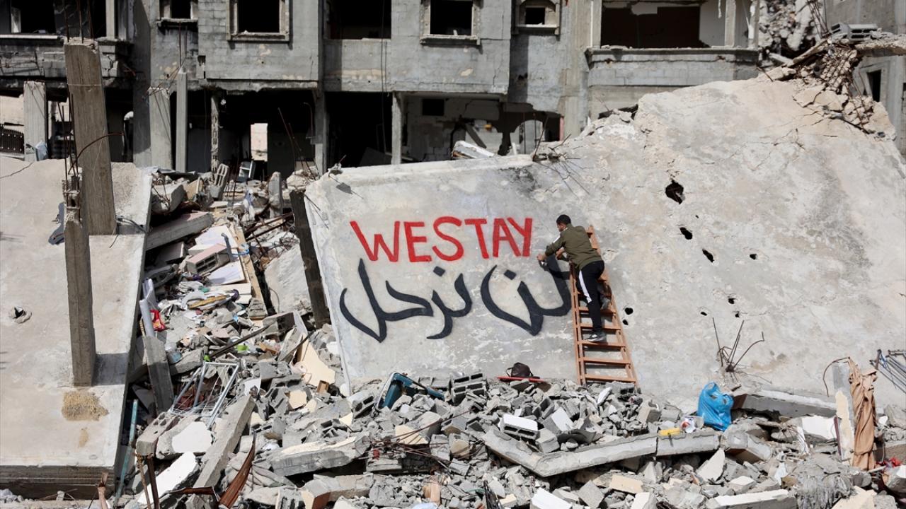 İsrail'in 7 Ekim'den bu yana saldırılarını sürdürdüğü Gazze Şeridi'nde, bir Filistinli ağır bir yıkıma maruz kalan Gazze'nin kuzeyindeki Beyt Lahiya kentinde İsrail saldırılarında yıkılan bir binanın duvarına Arapça ve İngilizce dilinde `ayrılmayacağız` yazdı.