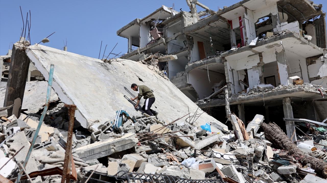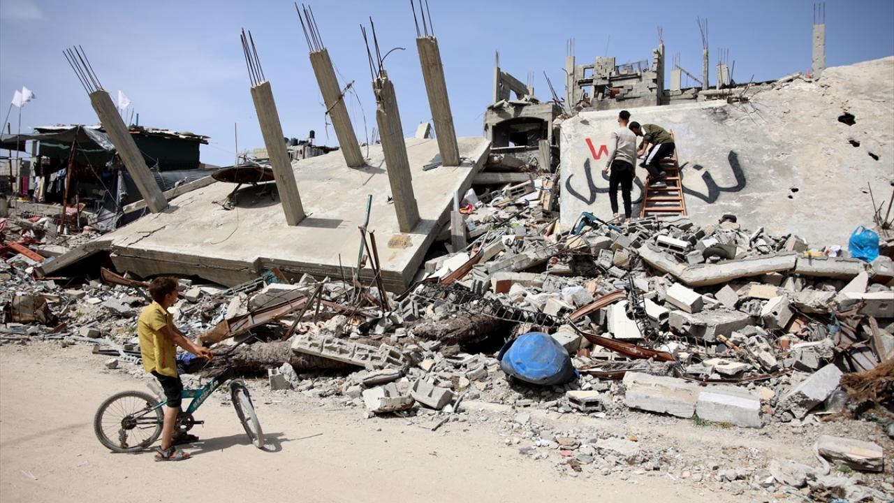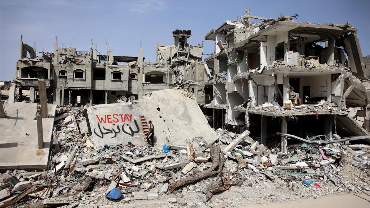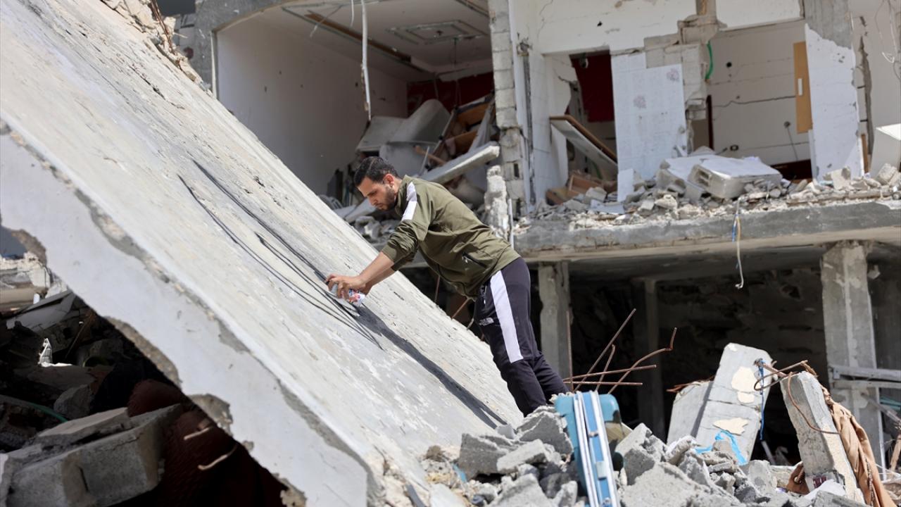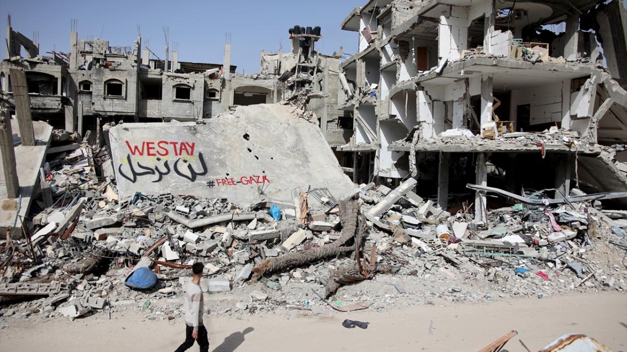 İsrail'in 7 Ekim'den bu yana saldırılarını sürdürdüğü Gazze Şeridi'nde, bir Filistinli ağır bir yıkıma maruz kalan Gazze'nin kuzeyindeki Beyt Lahiya kentinde İsrail saldırılarında yıkılan bir binanın duvarına Arapça ve İngilizce dilinde `ayrılmayacağız` yazdı.