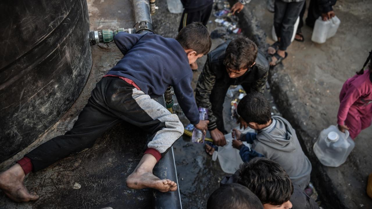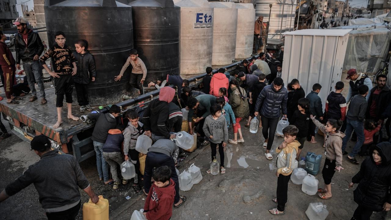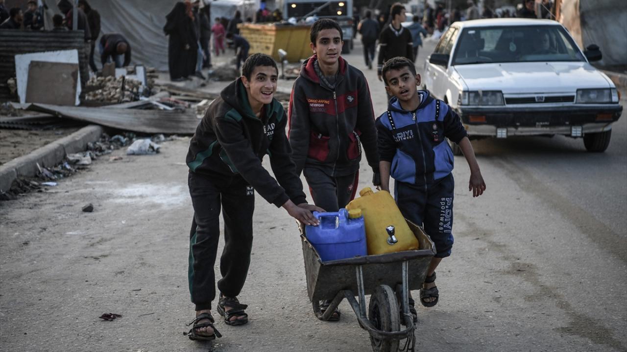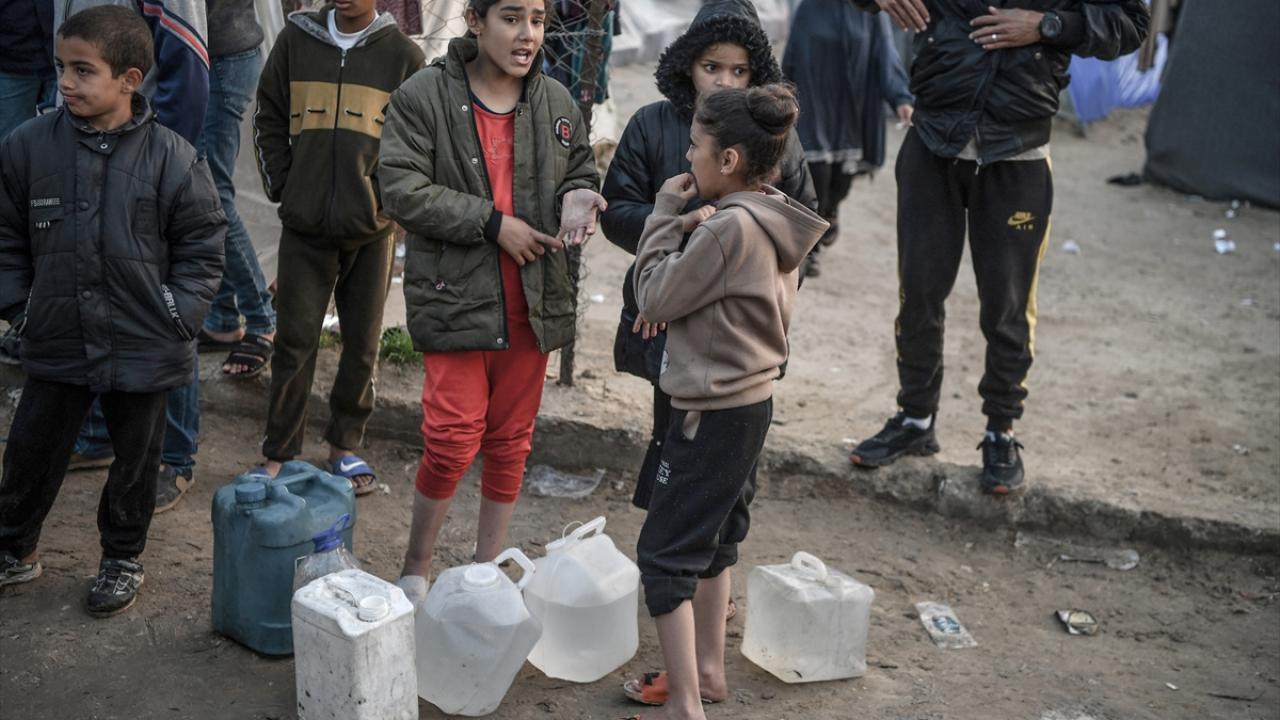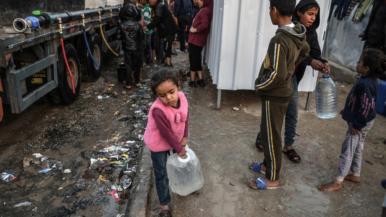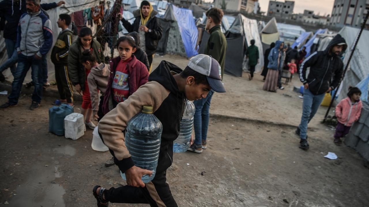 Saldırılardan kaçarak Gazze`nin Refah kentindeki çadırlarda yaşayan çocuklar, hayır kurumlarının dağıttı sudan alabilmek için sıraya giriyor.