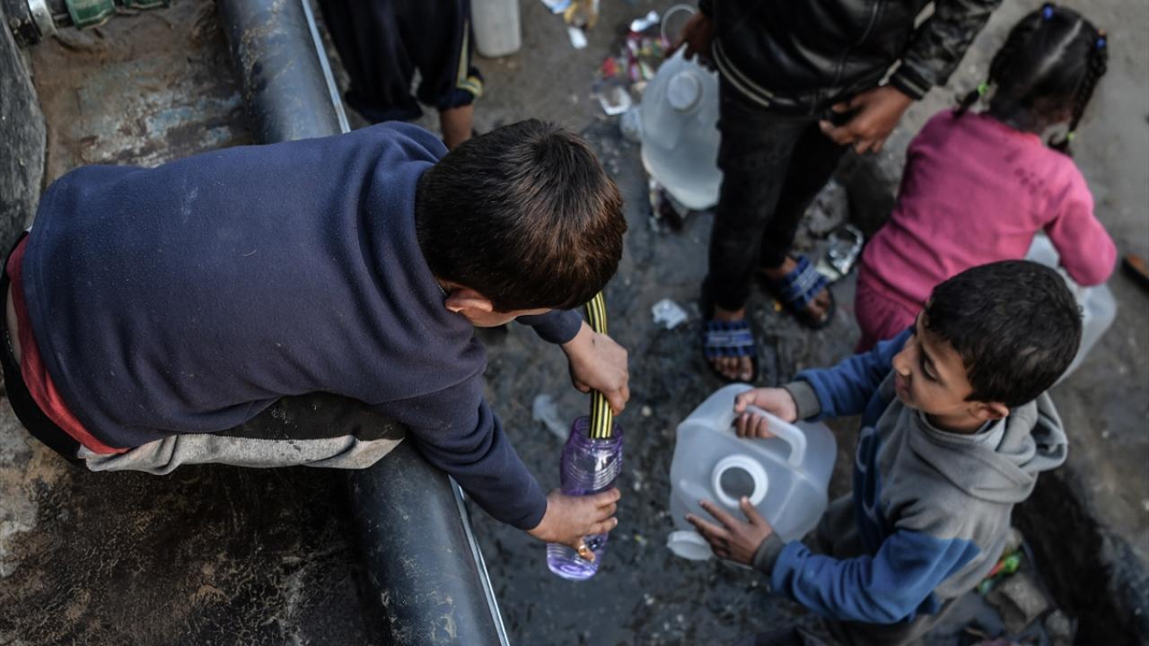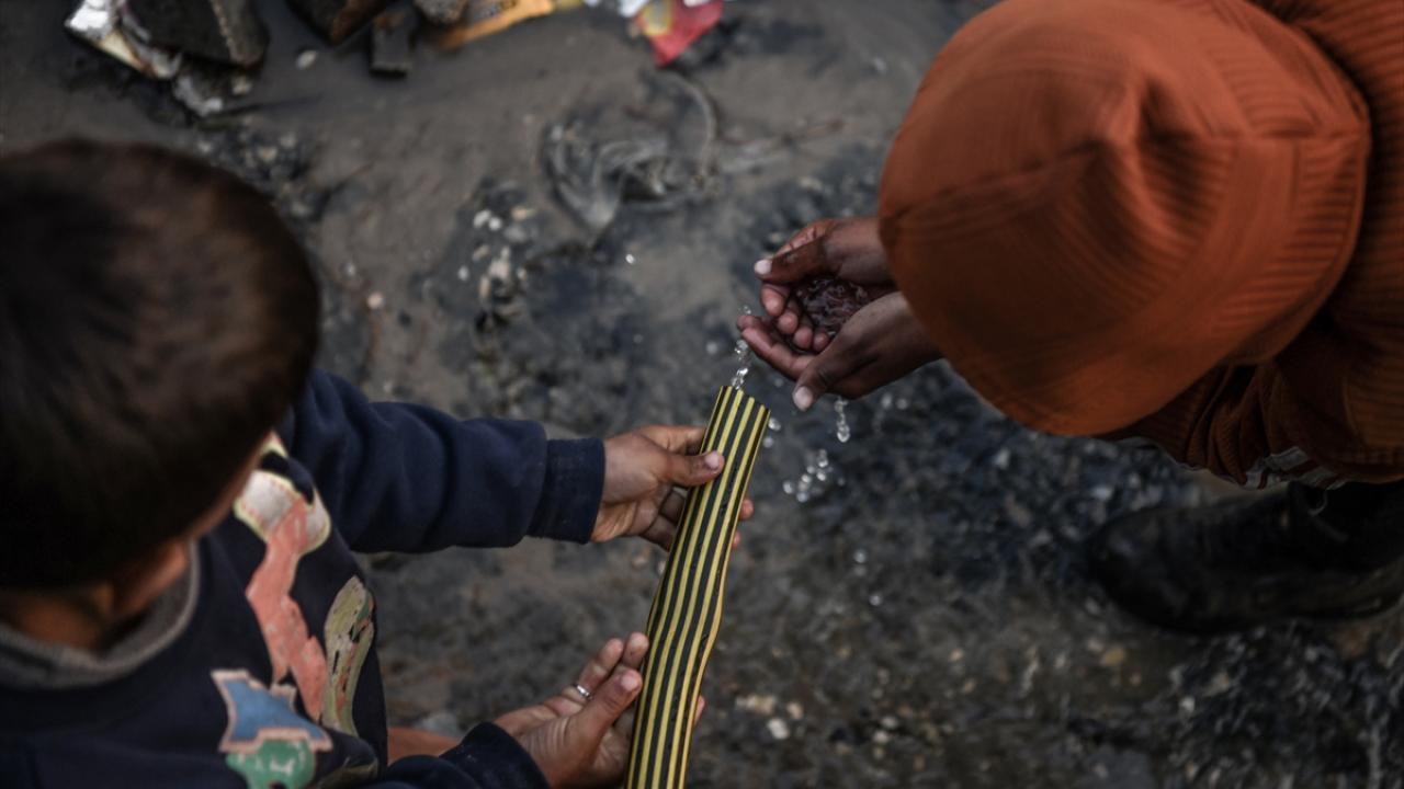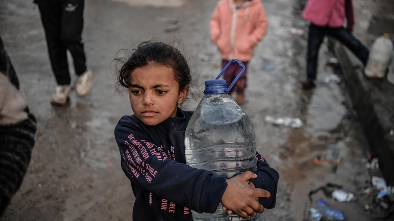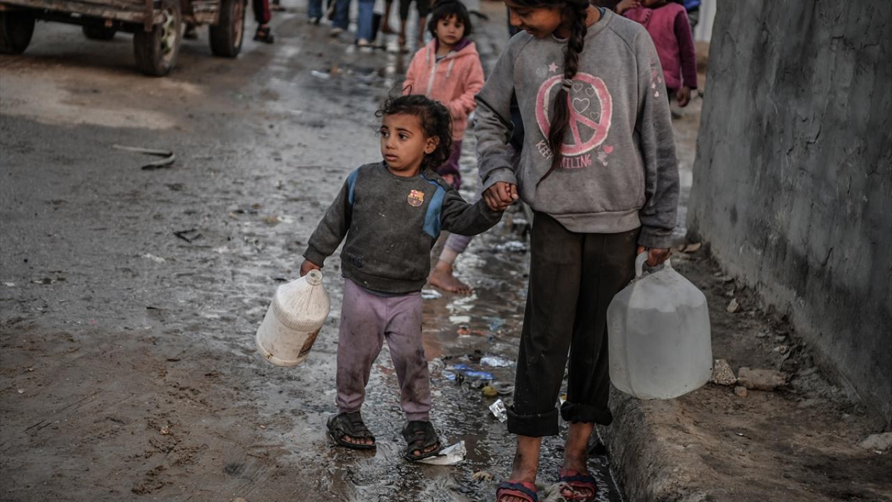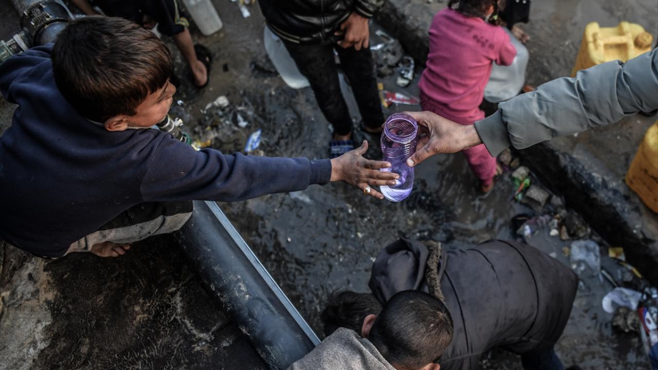 Saldırılardan kaçarak Gazze`nin Refah kentindeki çadırlarda yaşayan çocuklar, hayır kurumlarının dağıttı sudan alabilmek için sıraya giriyor.