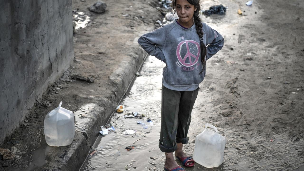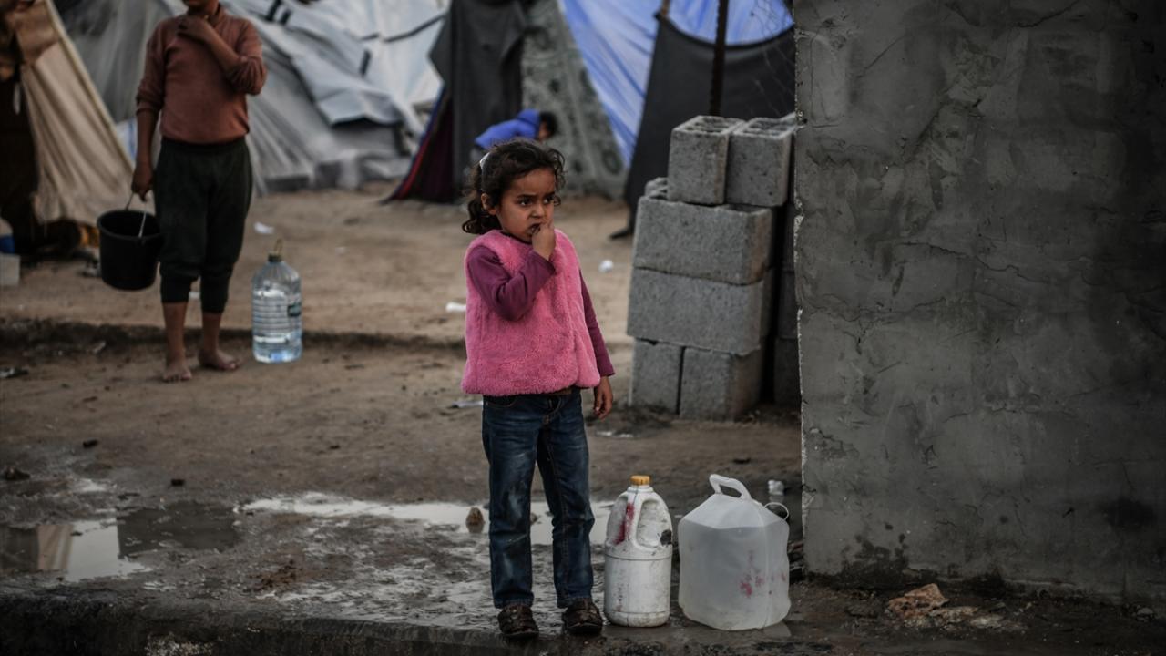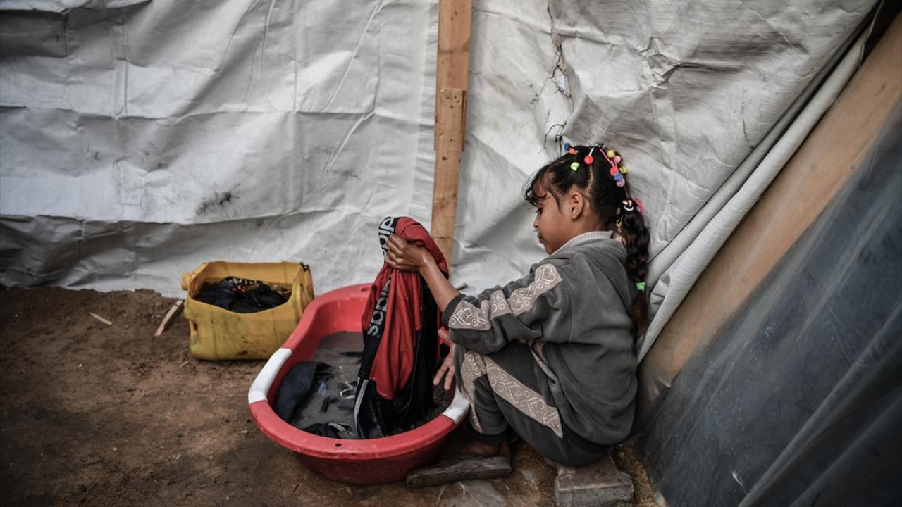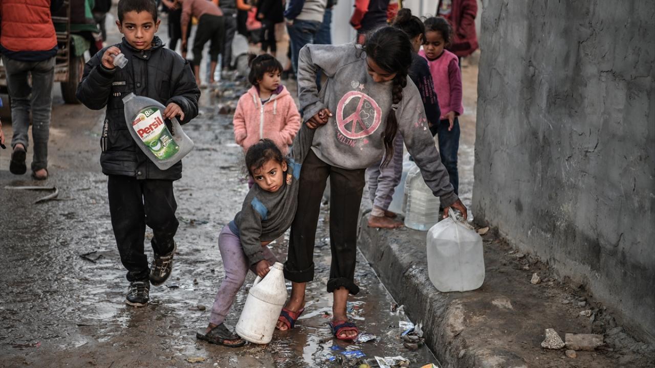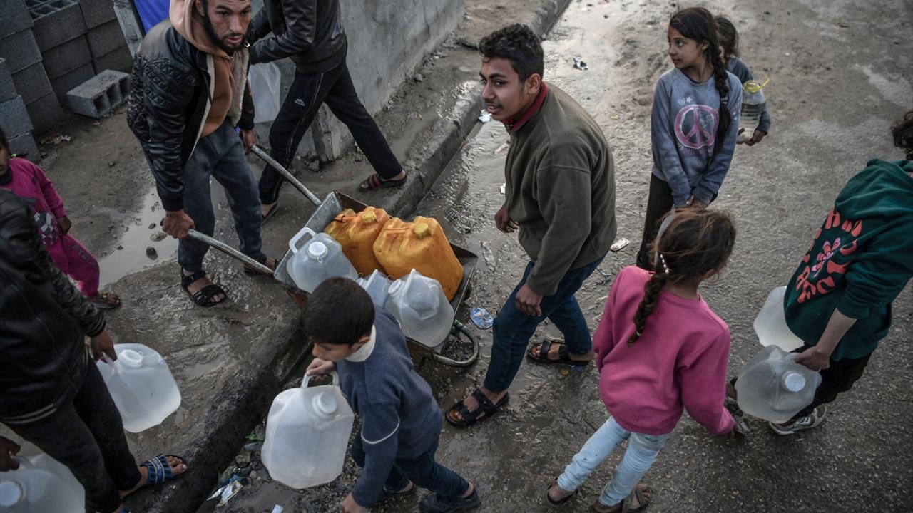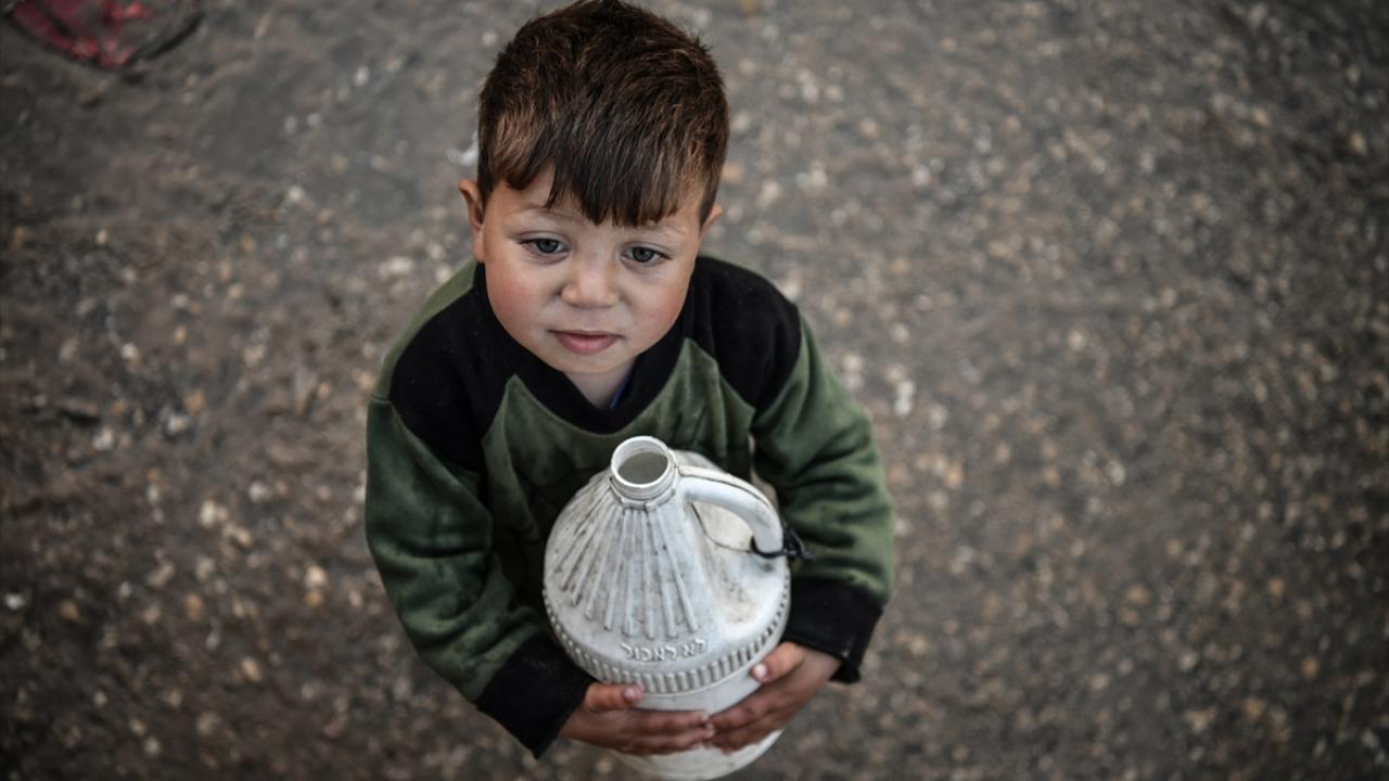 Saldırılardan kaçarak Gazze`nin Refah kentindeki çadırlarda yaşayan çocuklar, hayır kurumlarının dağıttı sudan alabilmek için sıraya giriyor.