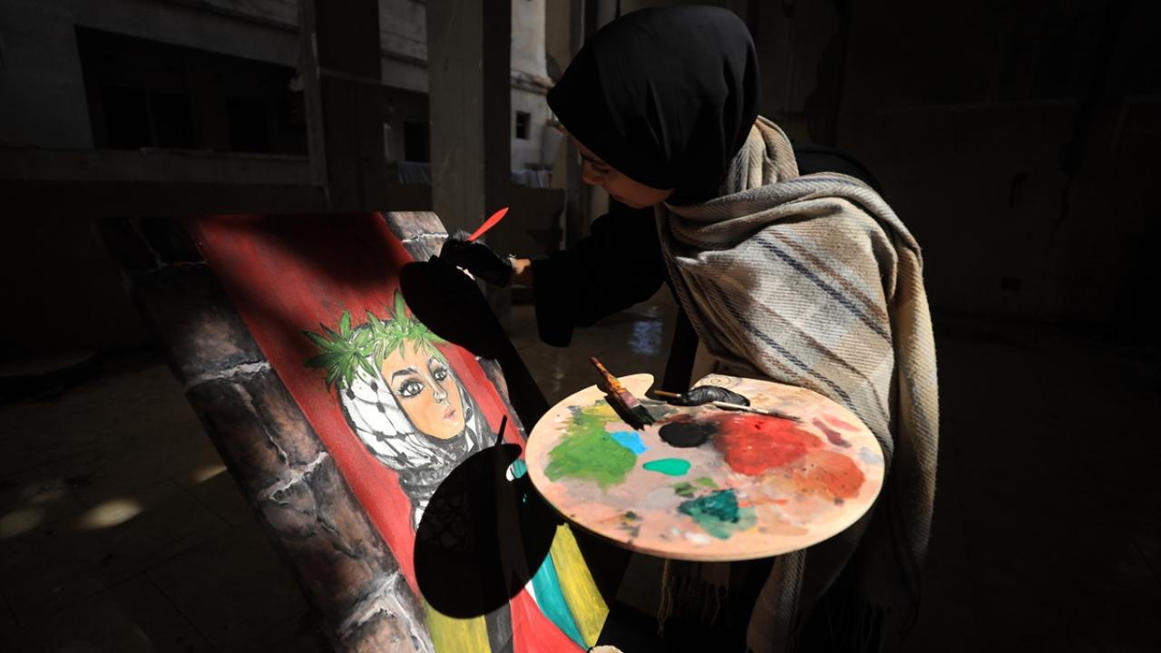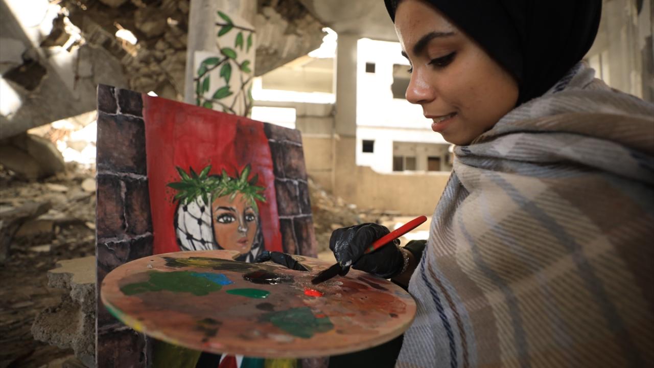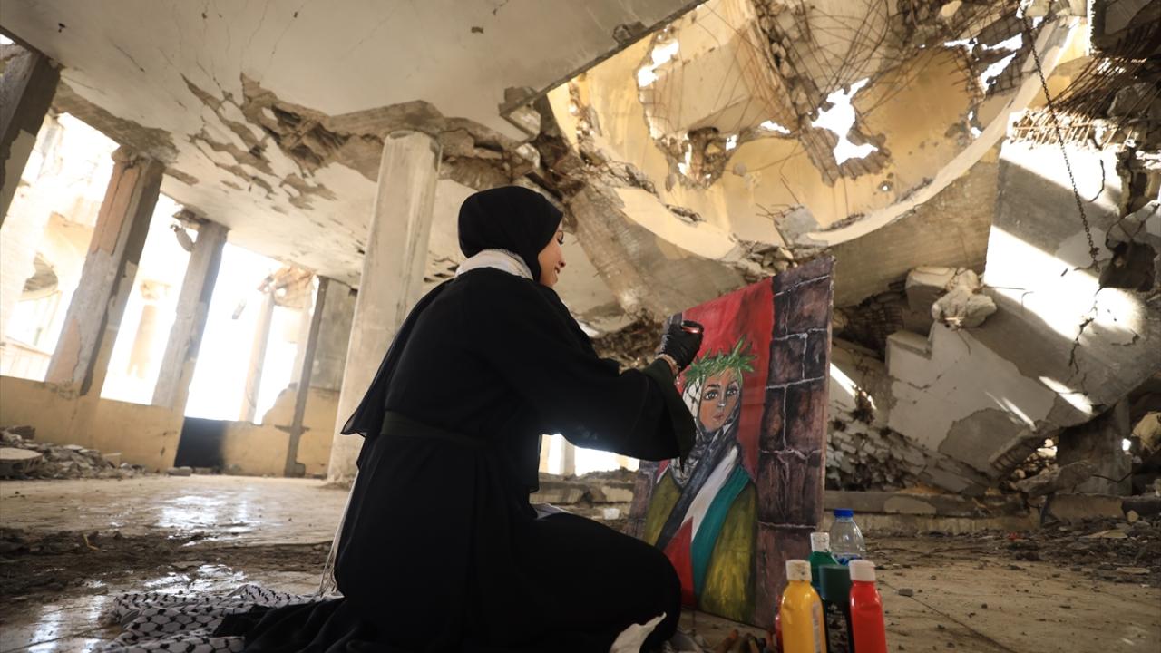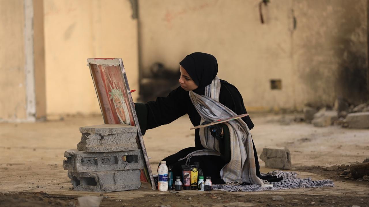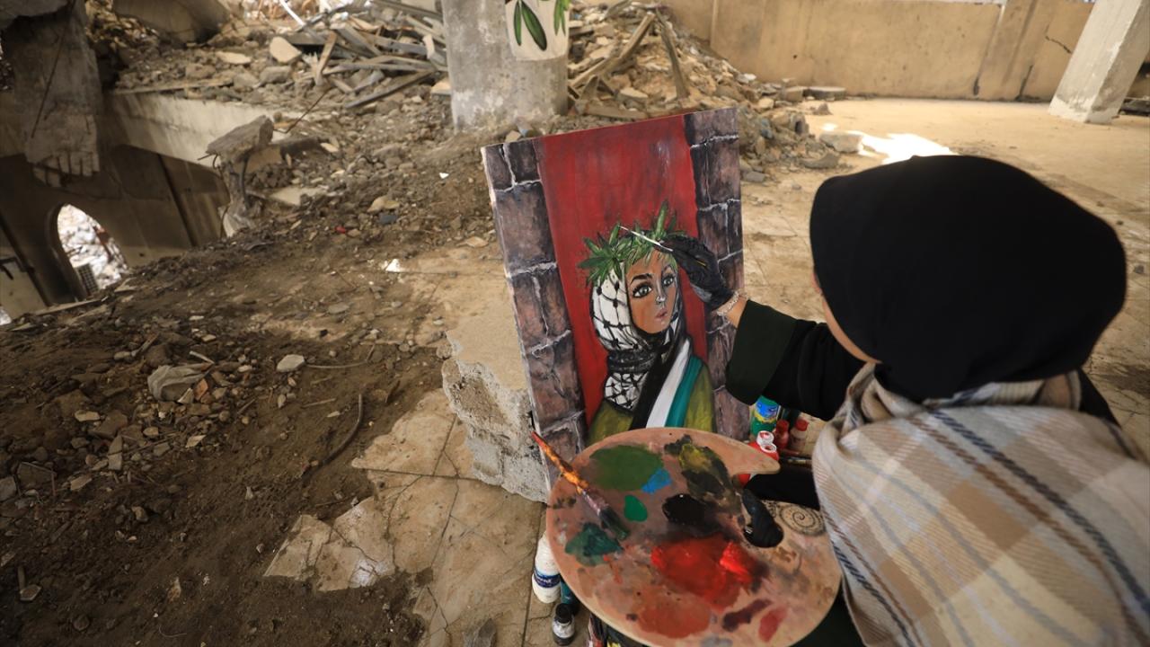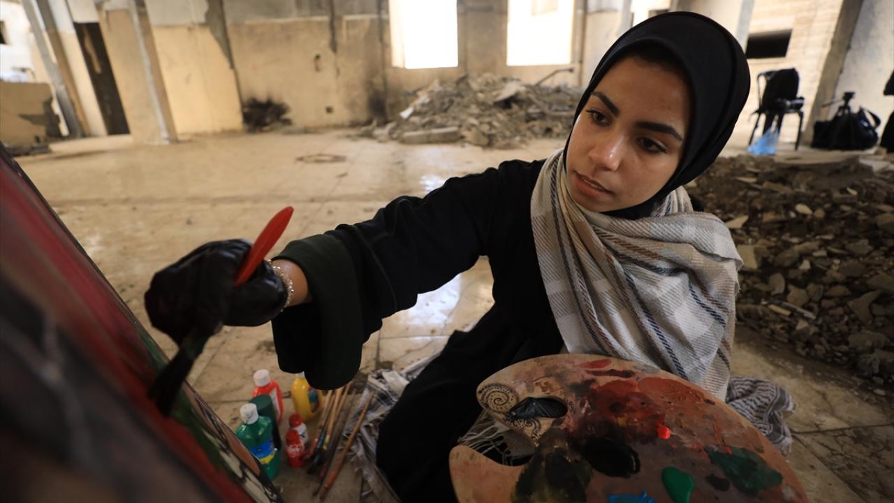 İsrail saldırılarının gölgesinde Filistinlilerin topraklarına bağlılığını yansıtan Neda, Gazze kentinde eserlerini yıkılan binaların enkazı arasında çizerek günün hatırasını yaşatıyor.