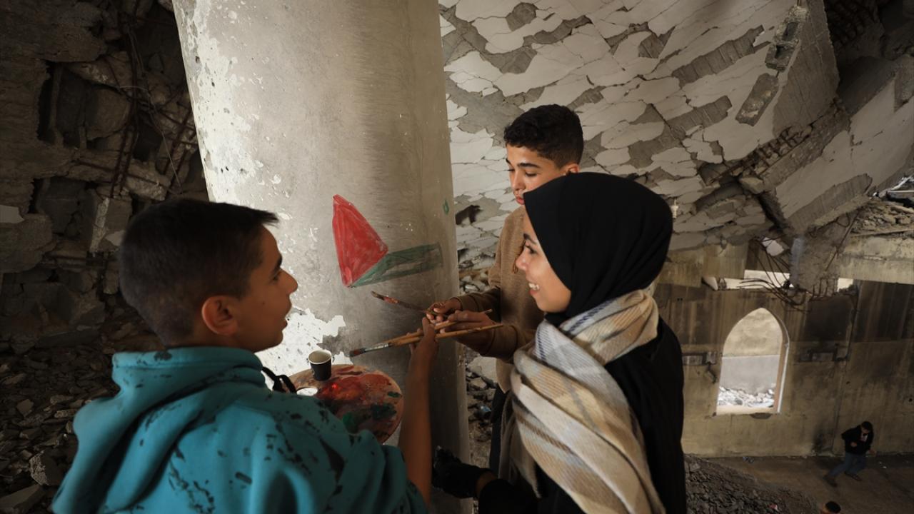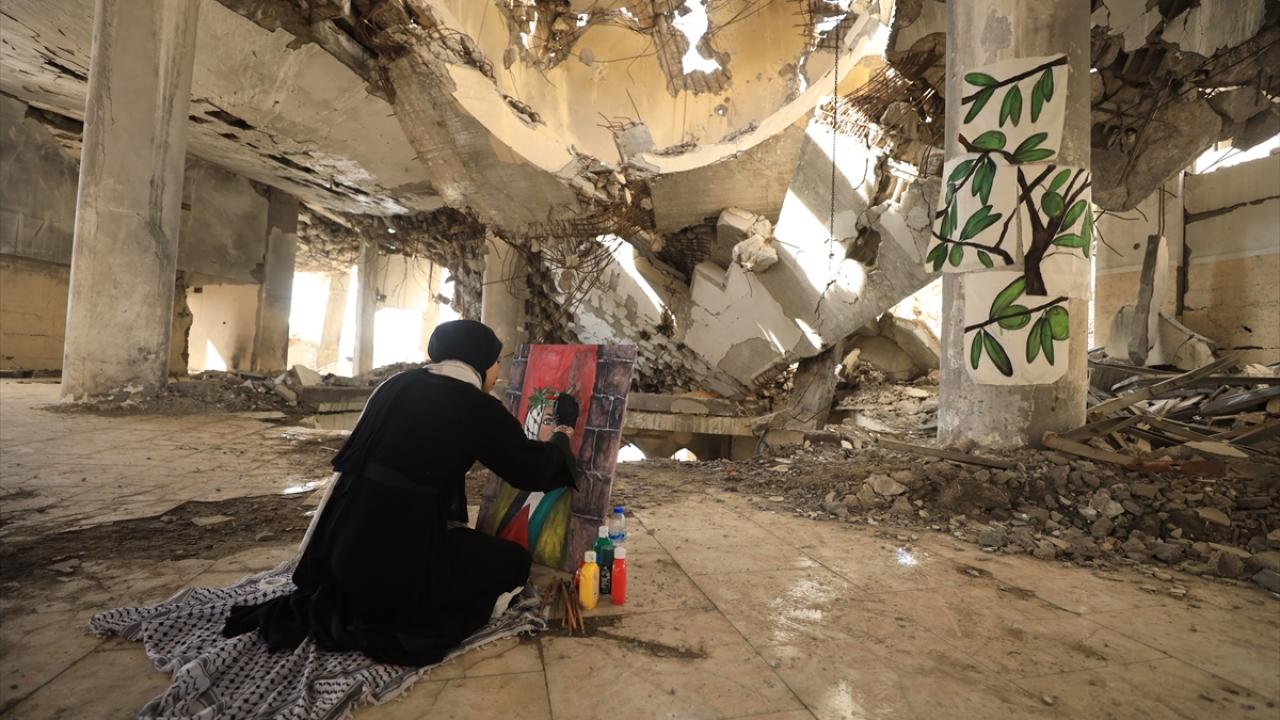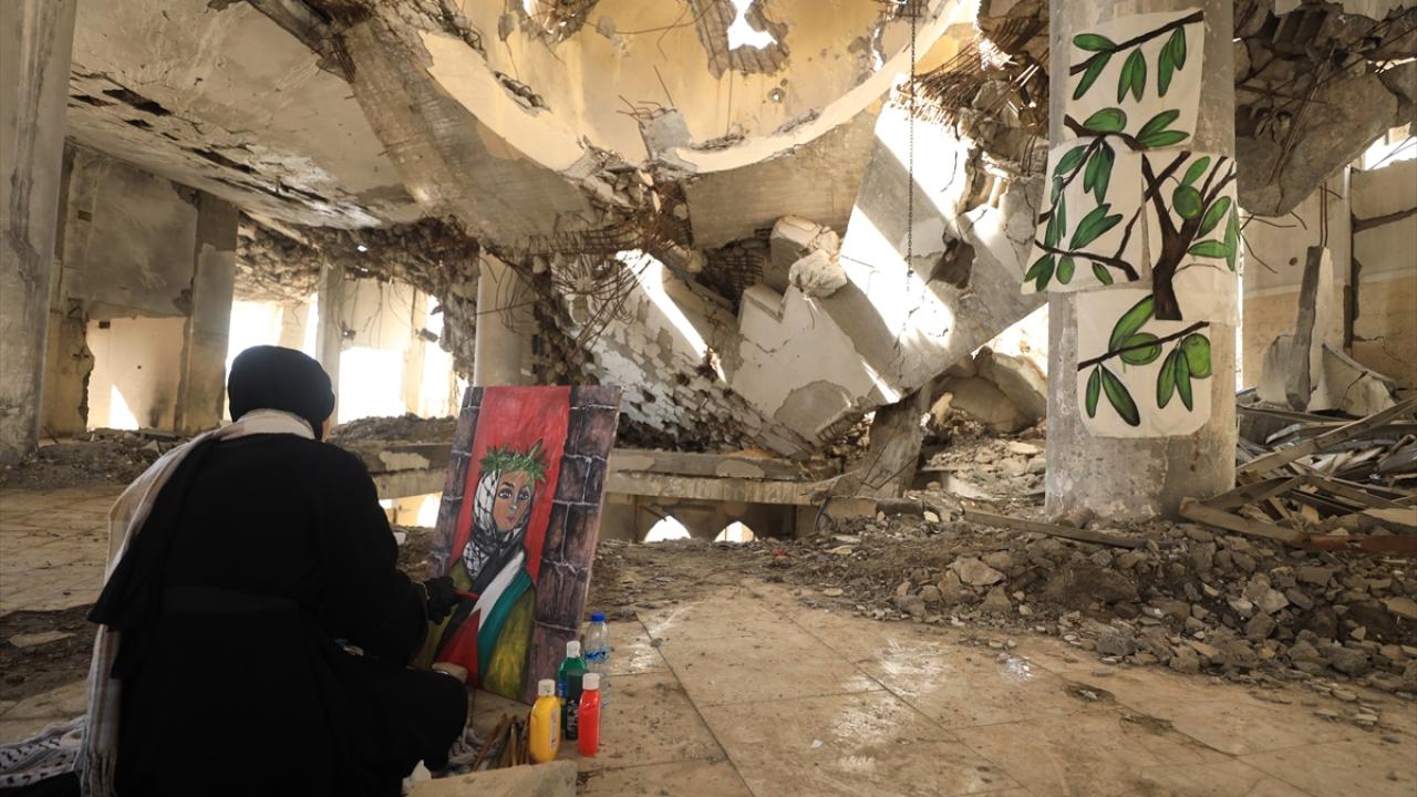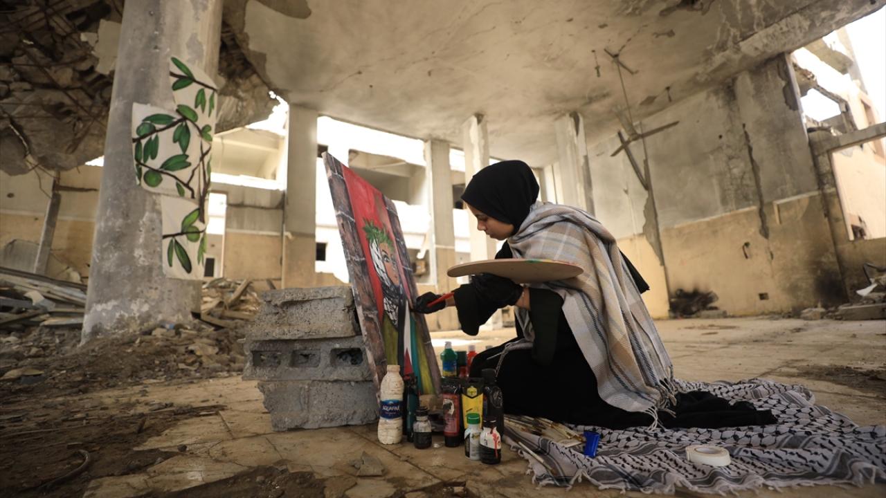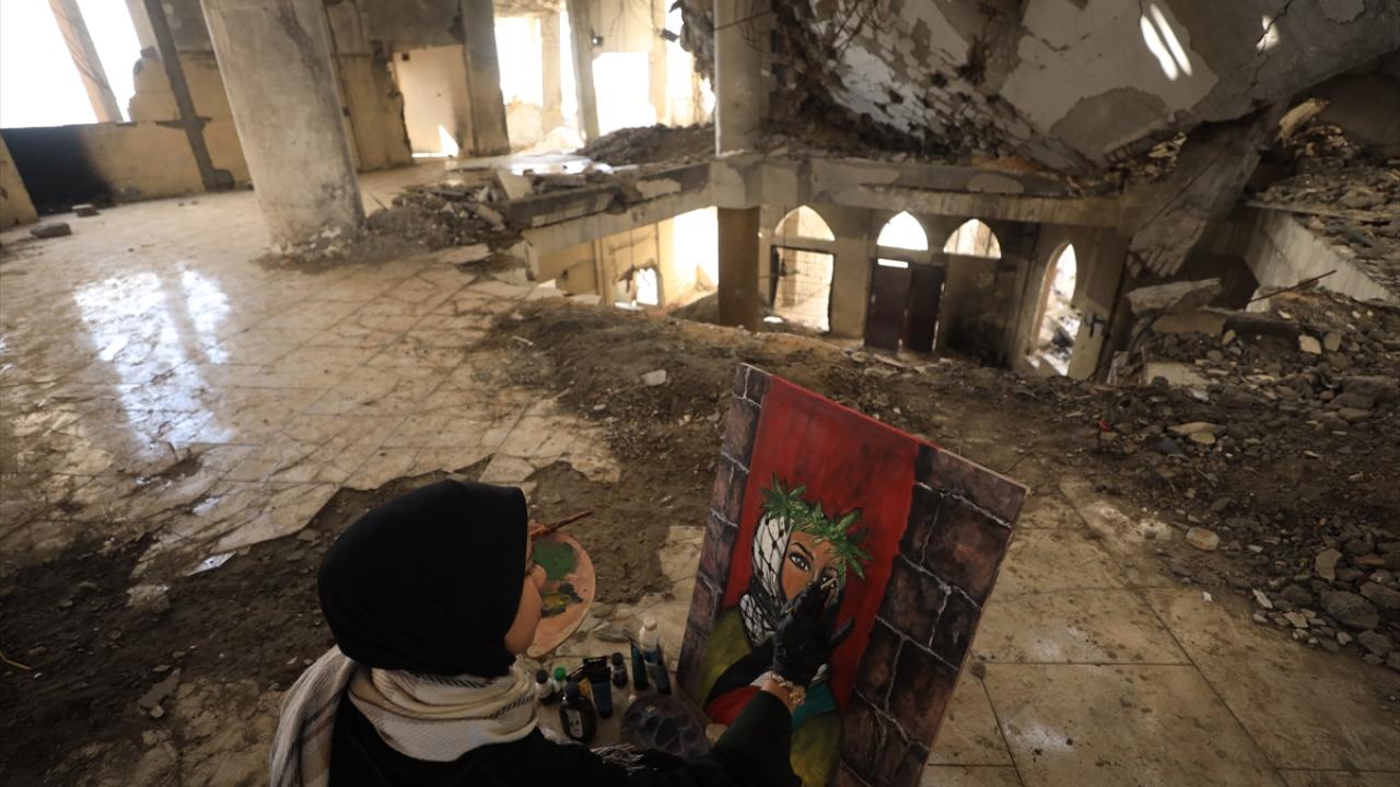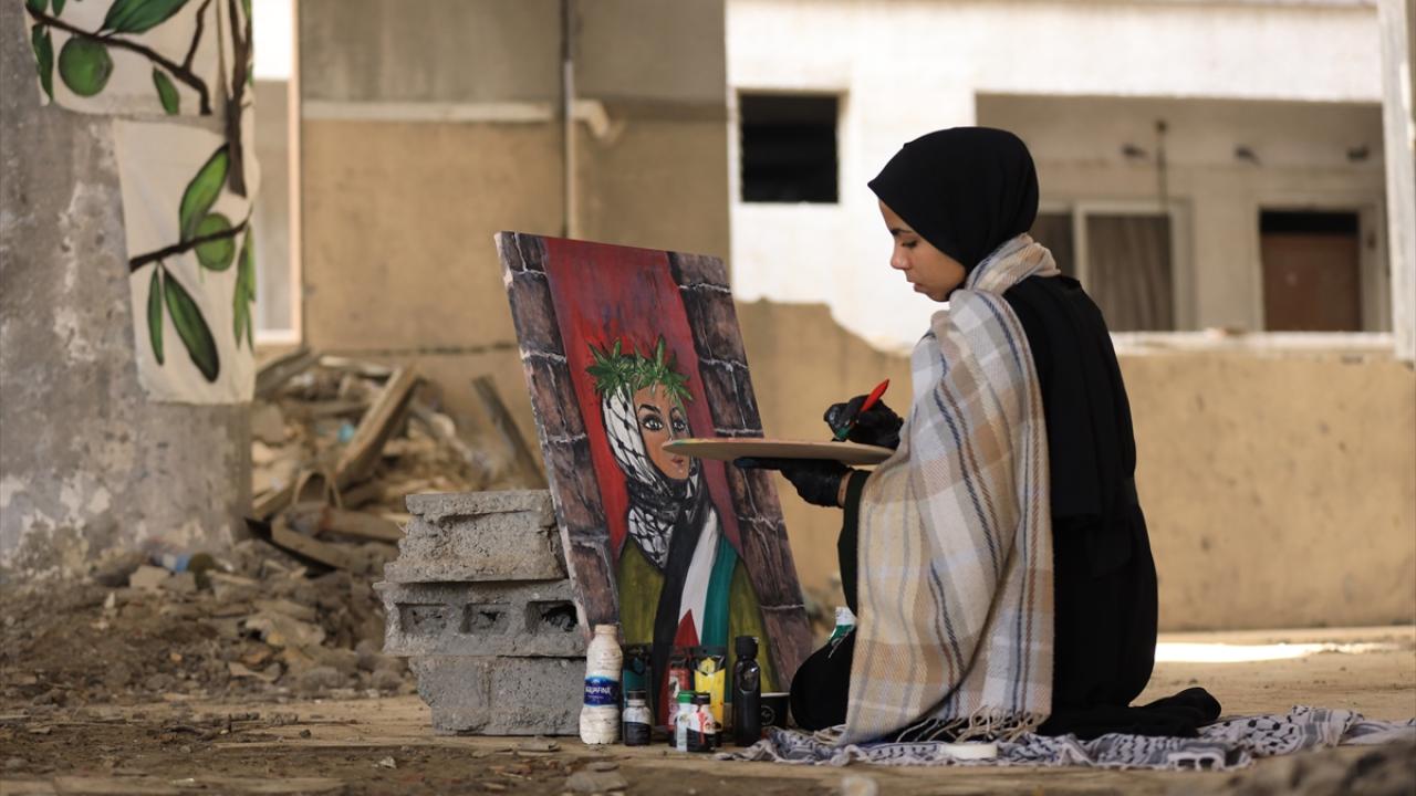 İsrail saldırılarının gölgesinde Filistinlilerin topraklarına bağlılığını yansıtan Neda, Gazze kentinde eserlerini yıkılan binaların enkazı arasında çizerek günün hatırasını yaşatıyor.