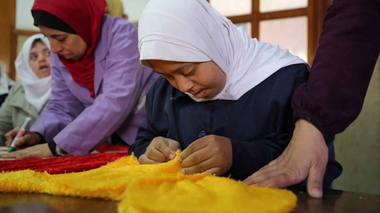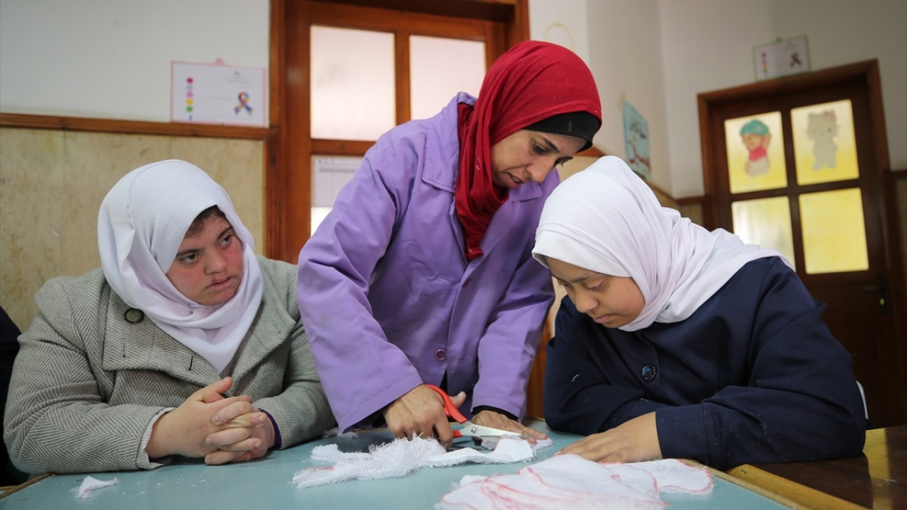 Kursa katılan down sendromlu öğrencilerden Amr Kanita (18), dikiş öğretmeninin yardımıyla oyuncak ayı için kumaş kesmeye çalışıyor. Kanita`nın kursta aldığı eğitimi uygulayarak neşeyle kestiği kumaşı arkadaşı Ala Tamiyye (33) ve Heya Hamid (20) alıp, dikmeye başlıyor.