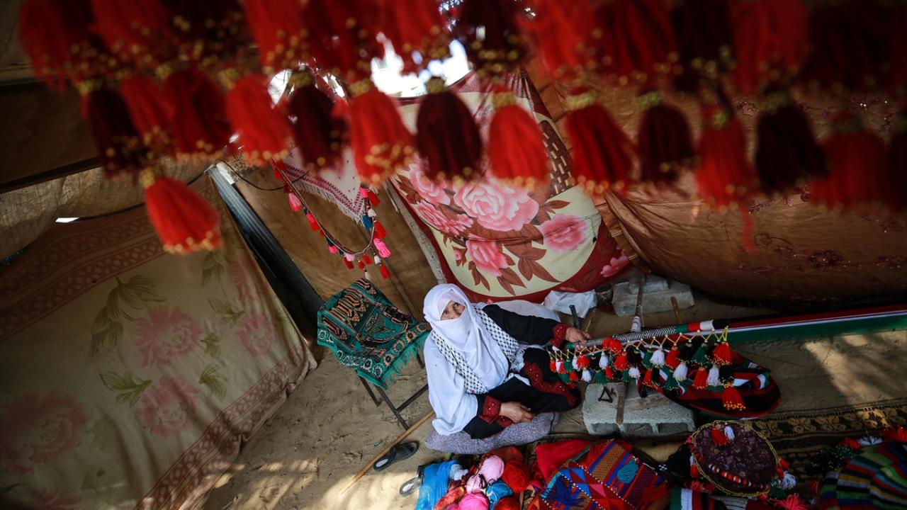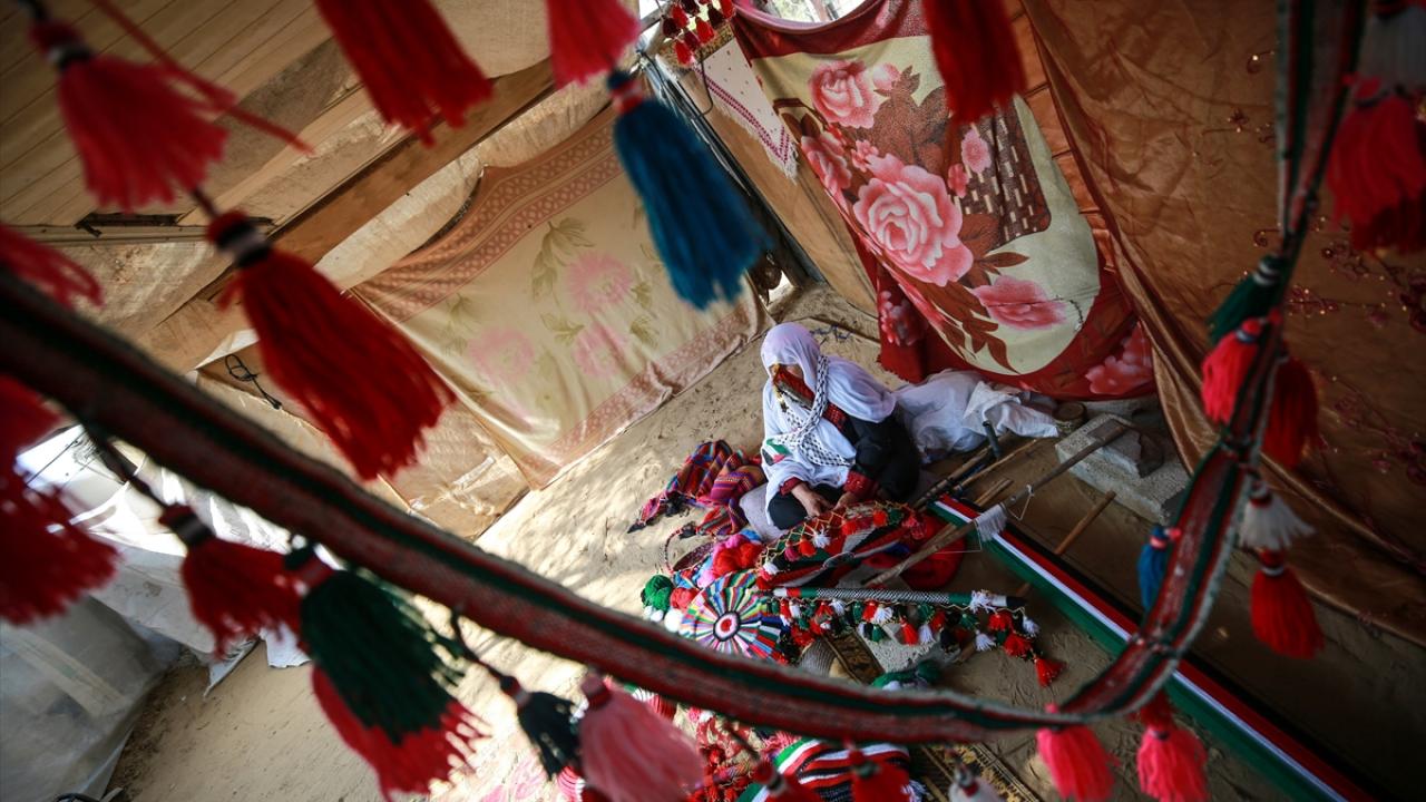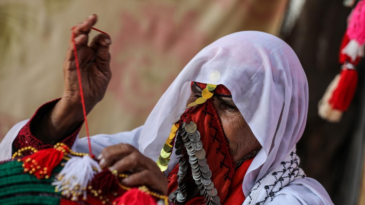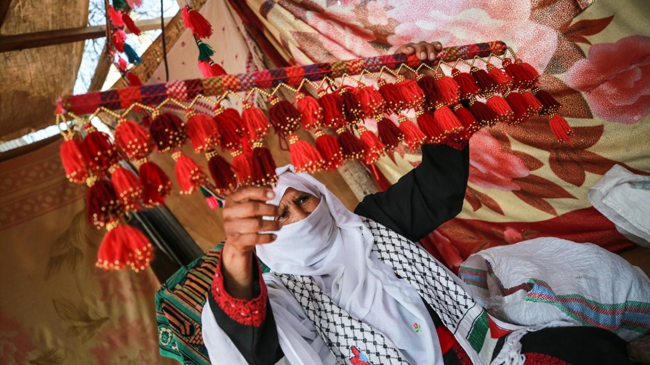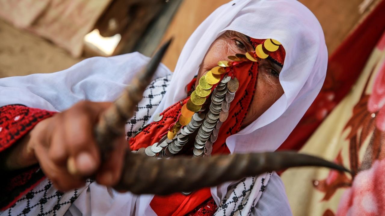 Gazze Şeridi'nde yaşayan 70 yaşındaki Ganime el-Arcan, 100 yıllık ceylan boynuzlarıyla yün eğirerek bedevi kültürüne ait birbirinden güzel işlemeler yapıyor.