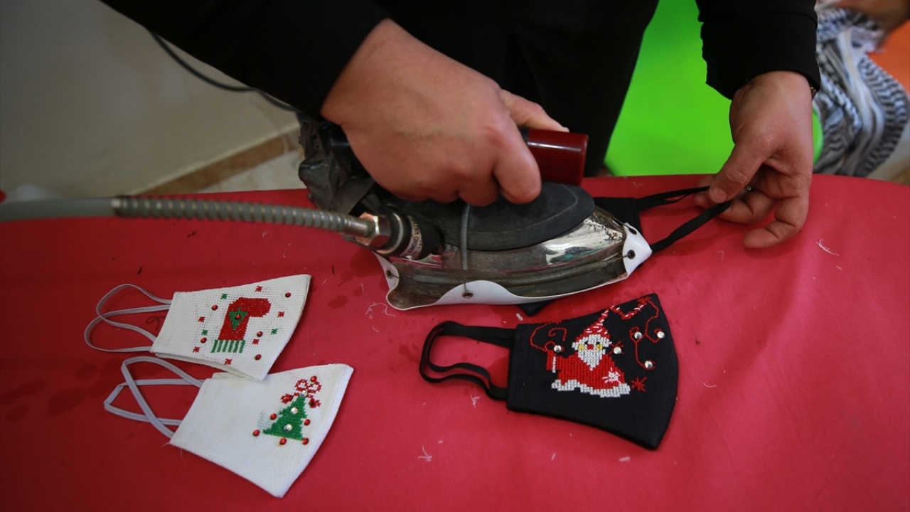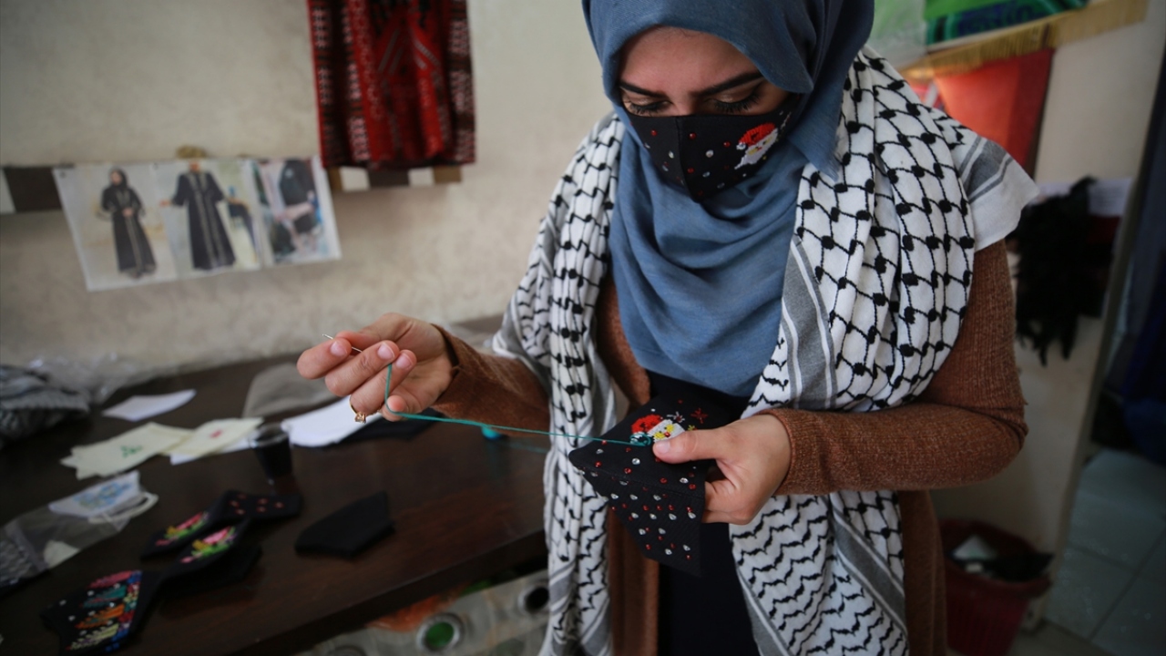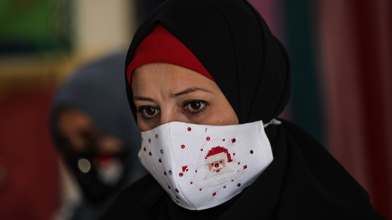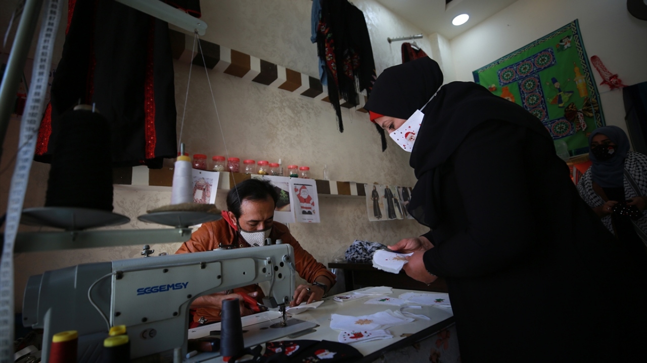 Gazze'de yaşayan 42 yaşındaki Filistinli kadın tasarımcı Suhad Seydem, atölyesinde yeni tip koronavirüse (Covid-19) karşı ürettiği maskeleri, yeni yıl desenleri ile süslüyor.