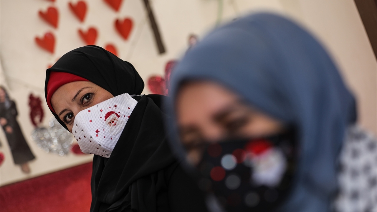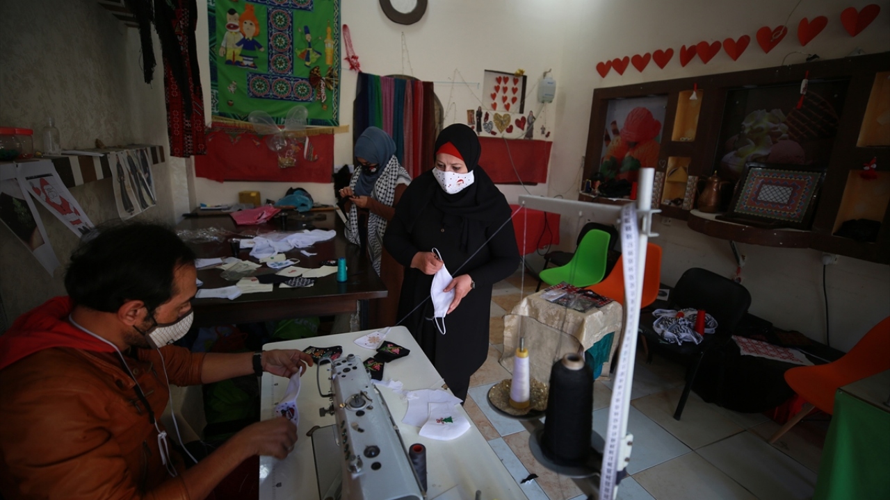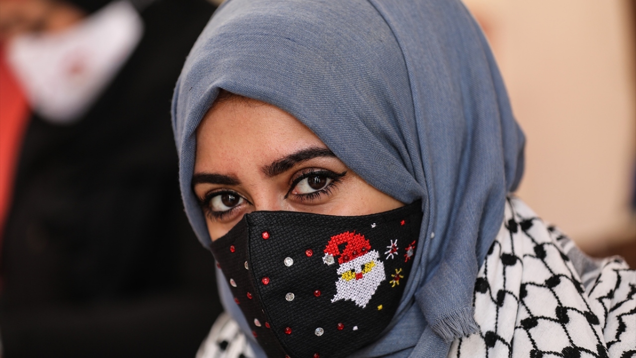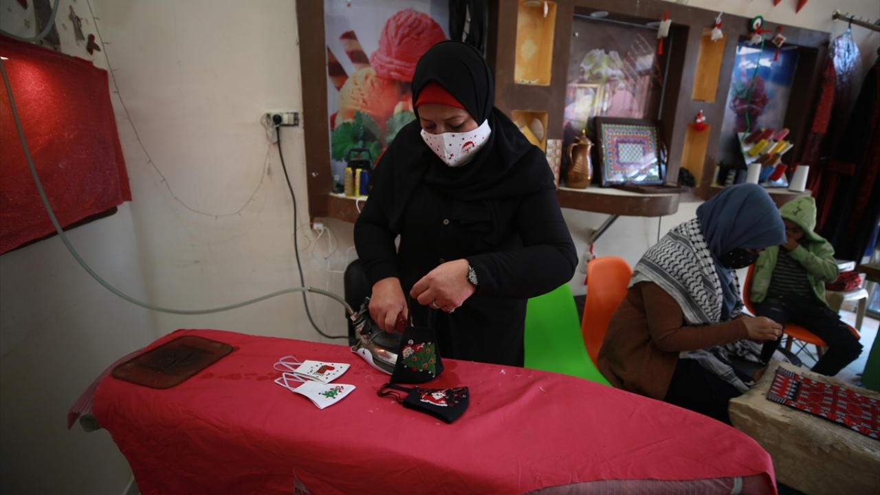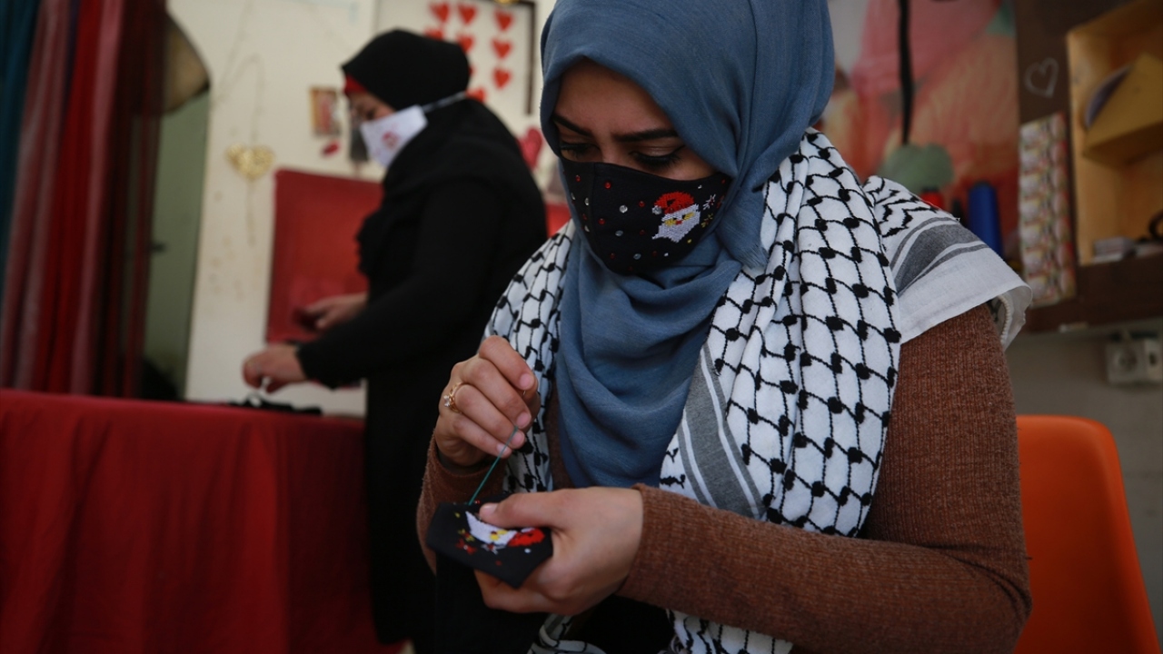 Gazze'de yaşayan 42 yaşındaki Filistinli kadın tasarımcı Suhad Seydem, atölyesinde yeni tip koronavirüse (Covid-19) karşı ürettiği maskeleri, yeni yıl desenleri ile süslüyor.