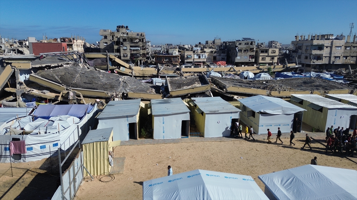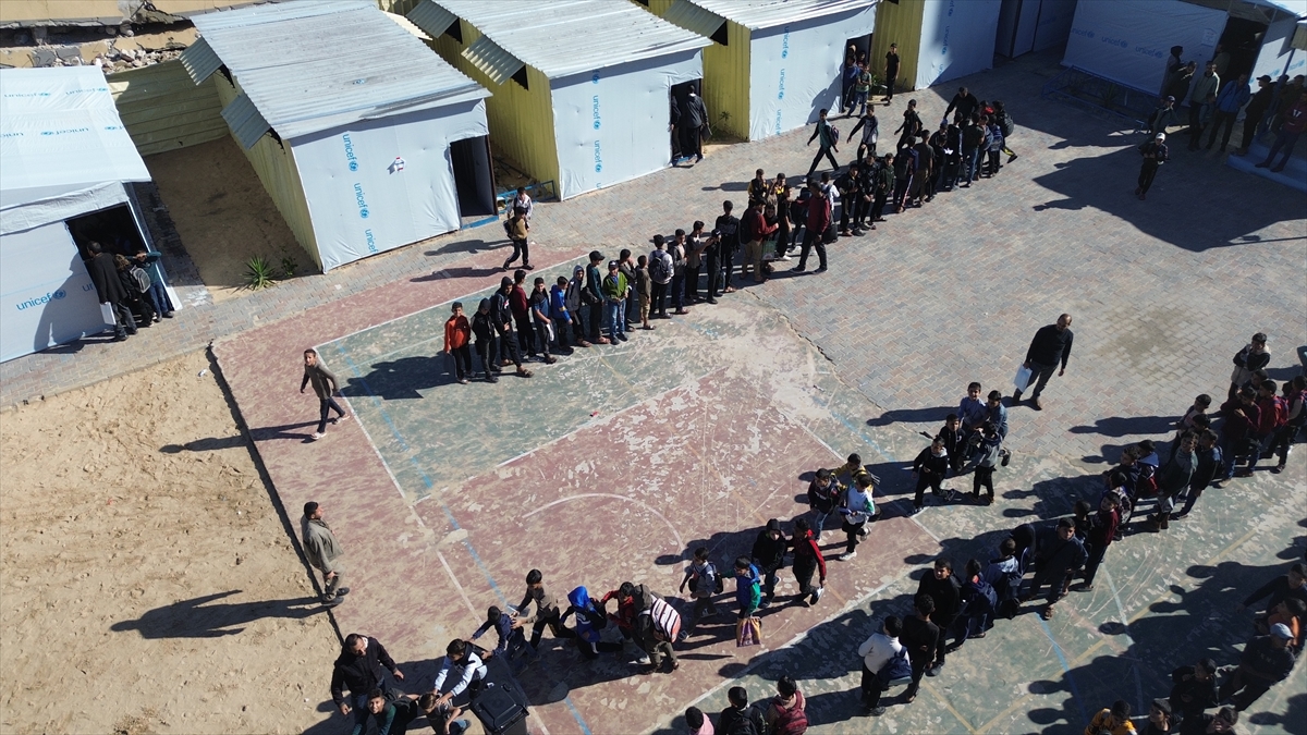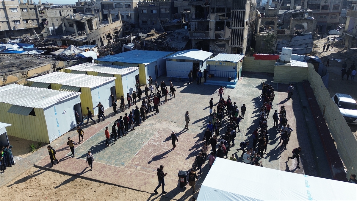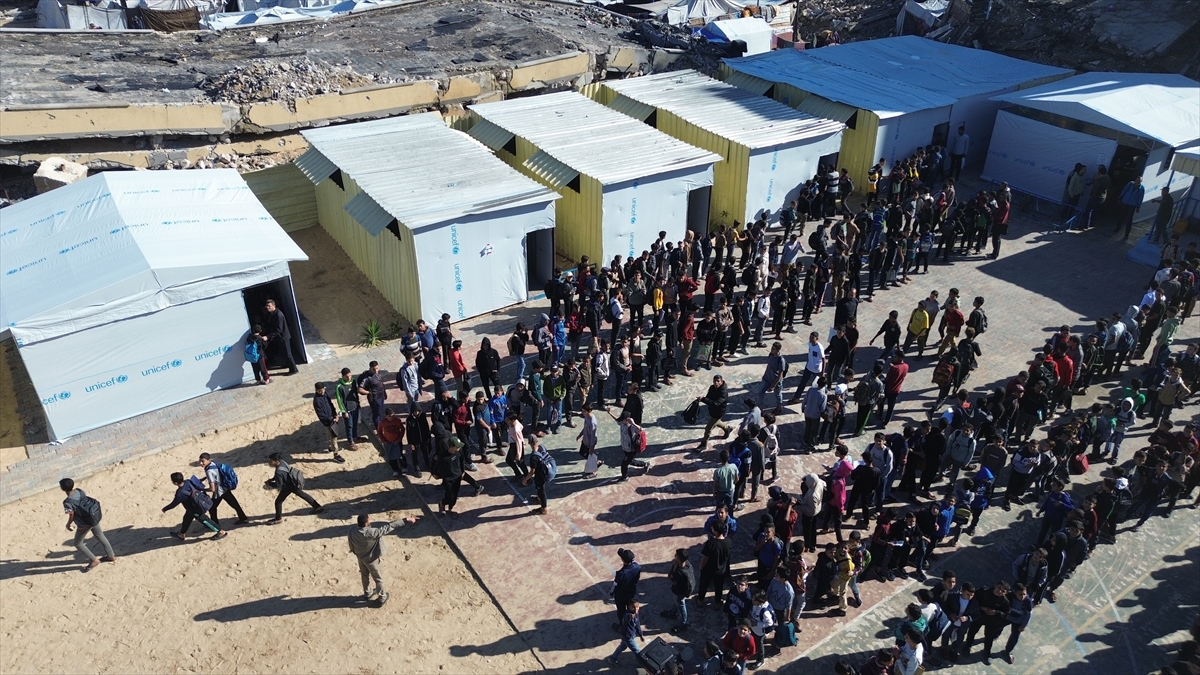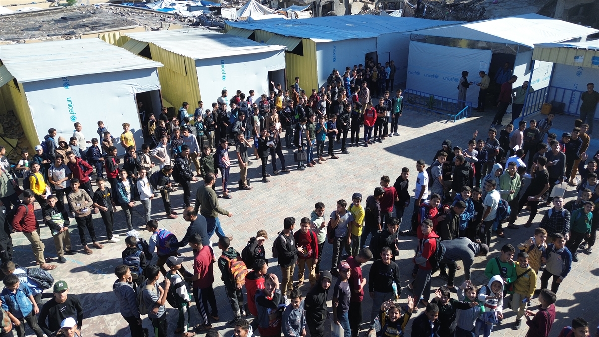 Gazze Şeridi güneyindeki Han Yunus kentinde yaşayan öğrenciler, İsrail saldırısında tamamen yıkılan okulda tüm zorluklara rağmen eğitime devam ediyor.