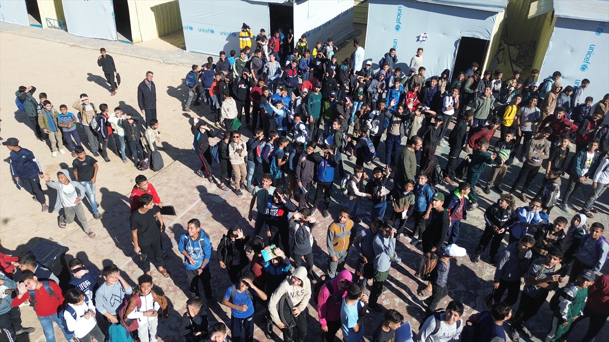 Harun er-Reşid Okulu öğrencileri, okulun enkazı arasında kurulan çadır sınıflarda kısıtlı imkanlarla eğitim görüyor.