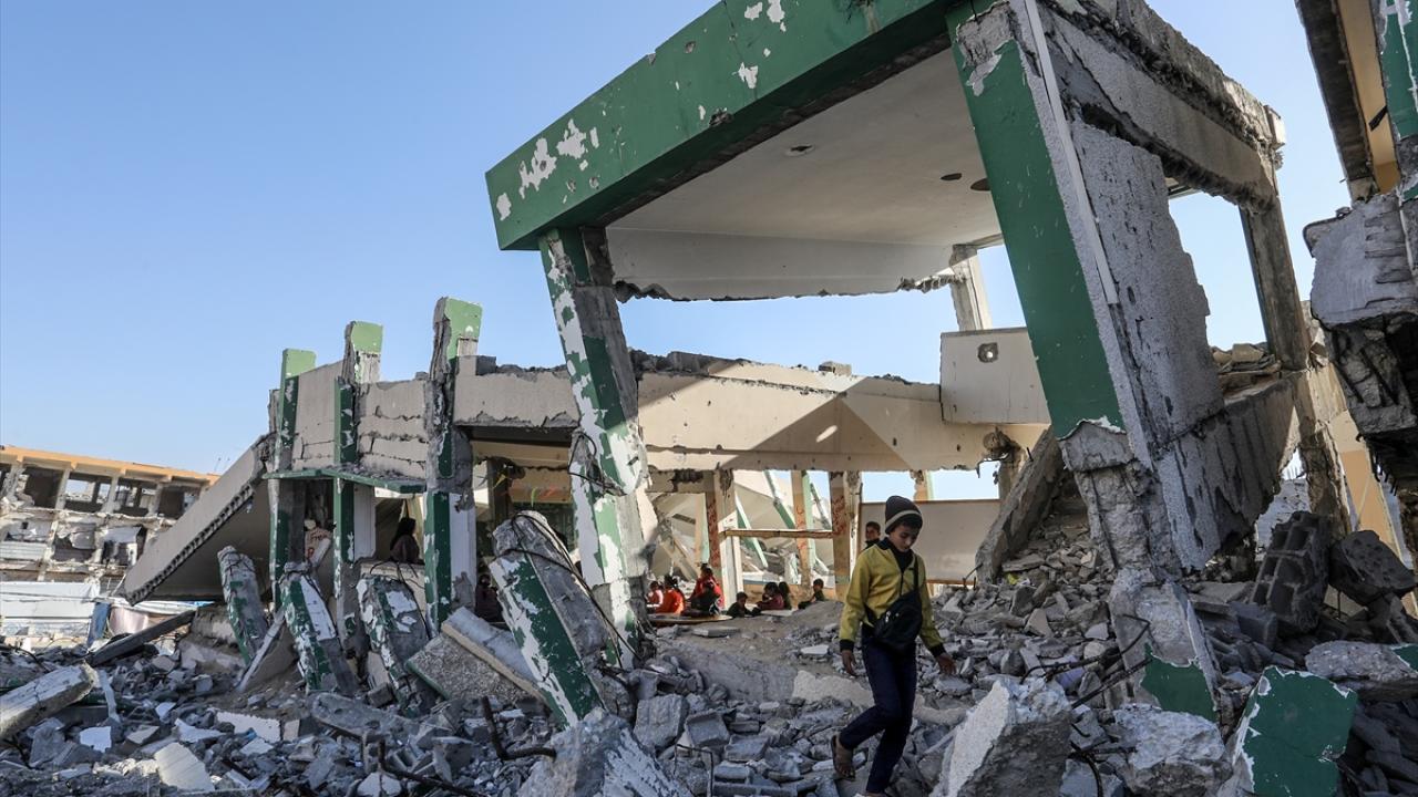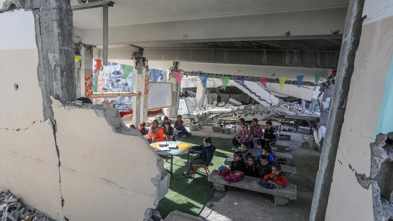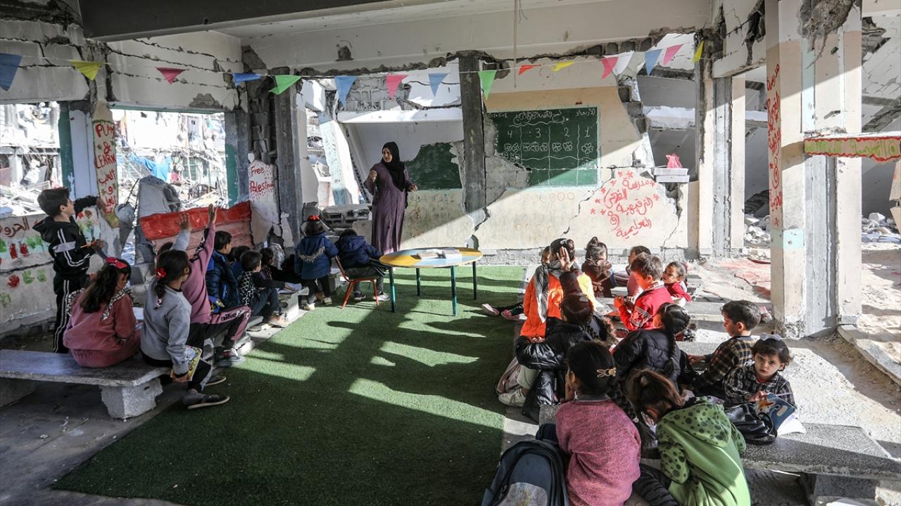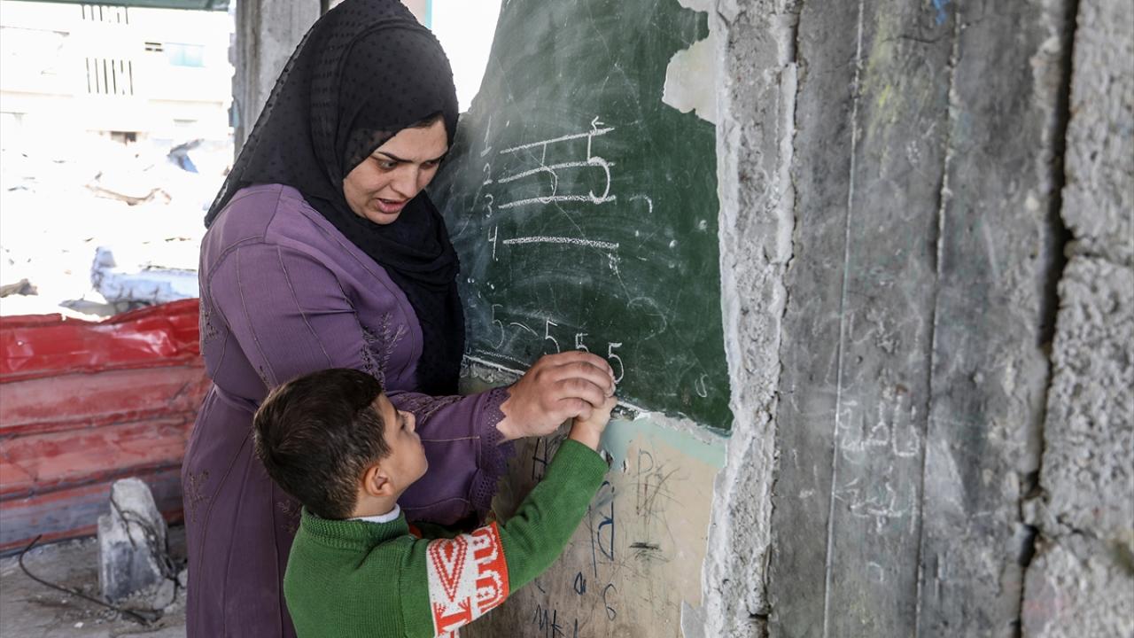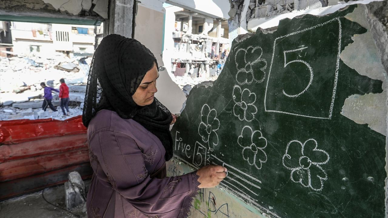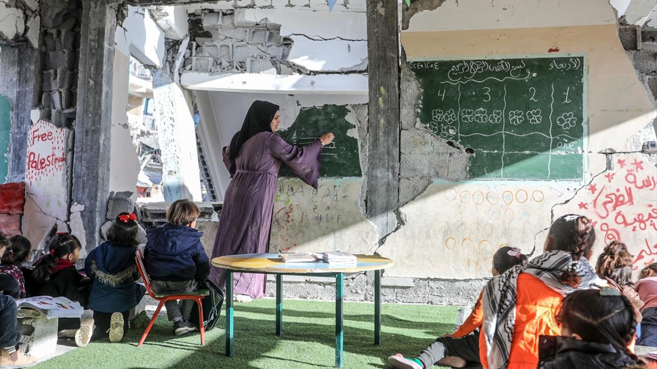 Filistinli öğretmen Doha el-Attar, İsrail ordusunun Gazze Şeridi'nin güneyindeki Han Yunus kentine düzenlediği saldırılarda büyük bölümü yıkılan okulun enkazında öğrencilere ders vermeye devam ediyor.