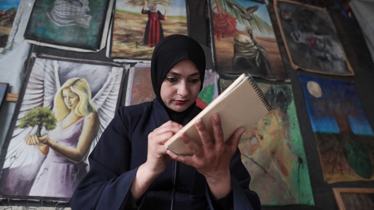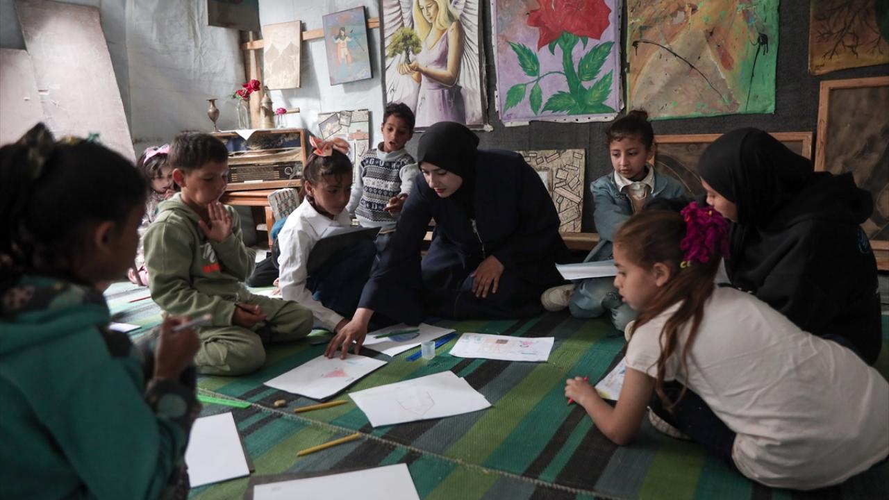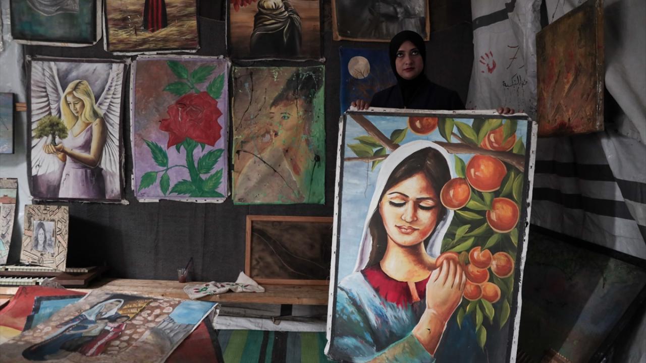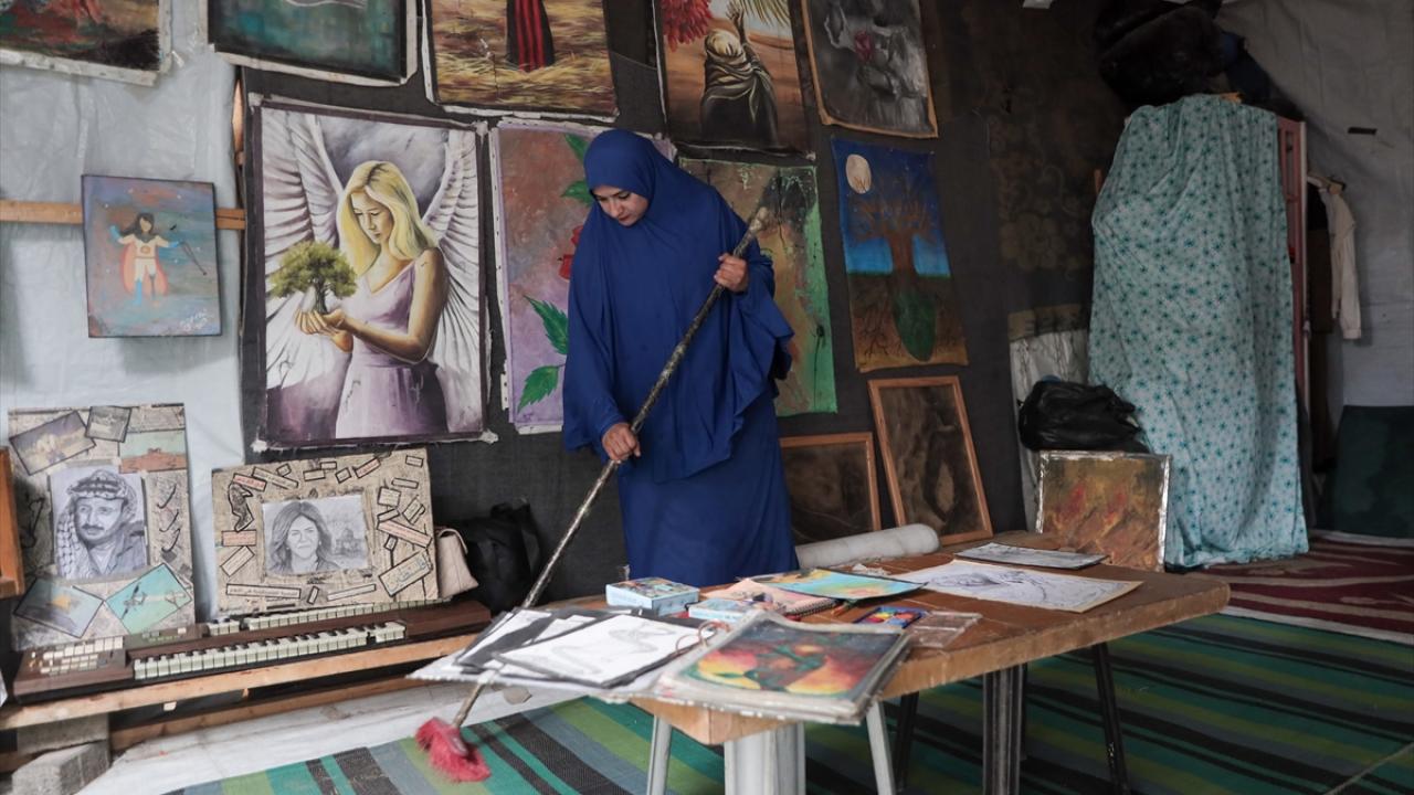 Gazze Şeridi'nin güneyindeki Han Yunus kentinde yaşayan ressam Ahlam Abdulati, enkaz altından çıkardığı tabloları ve malzemeleriyle kurduğu "çadırdan resim atölyesinde" çocuklara kelimelerle anlatamadıklarını kağıt, kalem ve fırçayla anlatmayı öğretiyor.