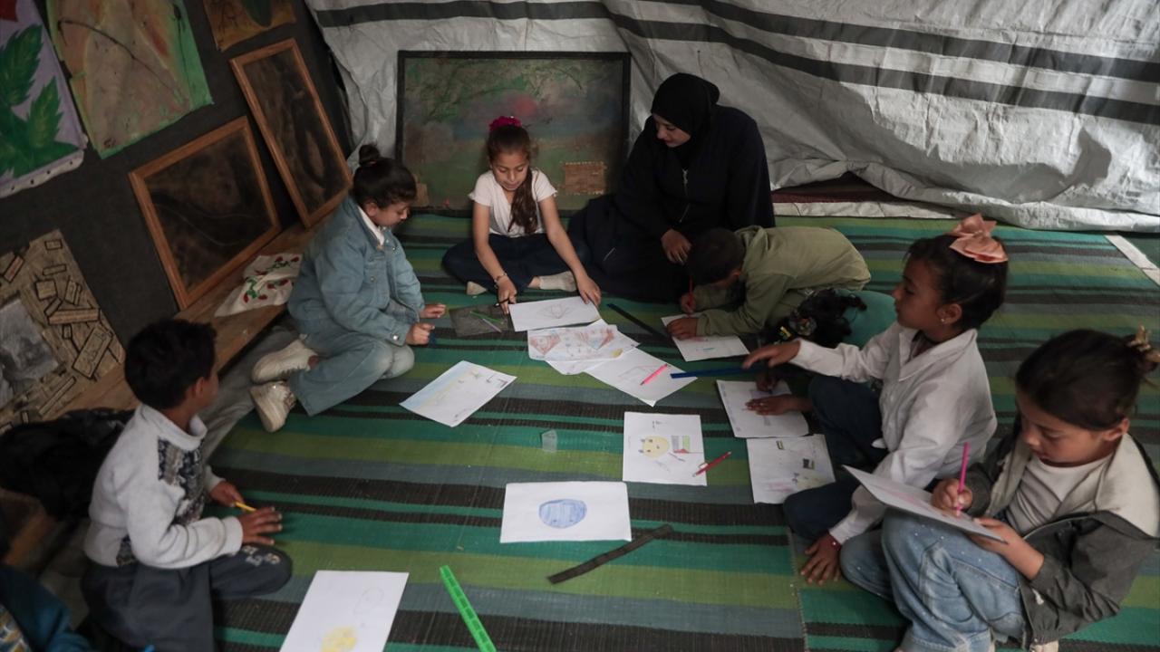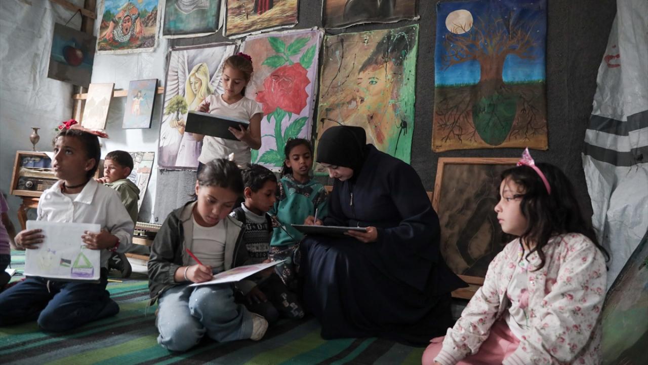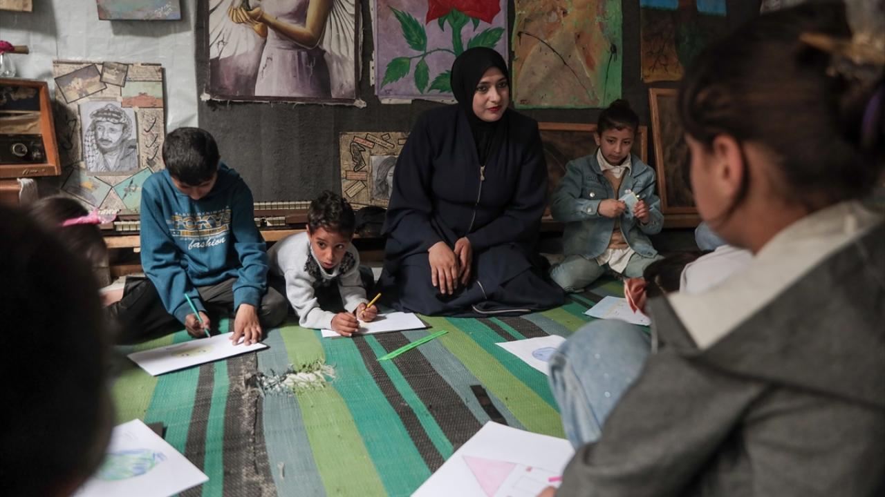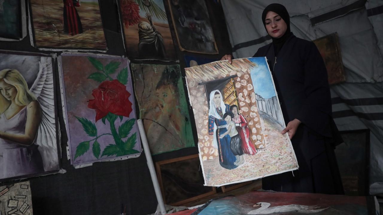 Gazze Şeridi'nin güneyindeki Han Yunus kentinde yaşayan ressam Ahlam Abdulati, enkaz altından çıkardığı tabloları ve malzemeleriyle kurduğu "çadırdan resim atölyesinde" çocuklara kelimelerle anlatamadıklarını kağıt, kalem ve fırçayla anlatmayı öğretiyor.