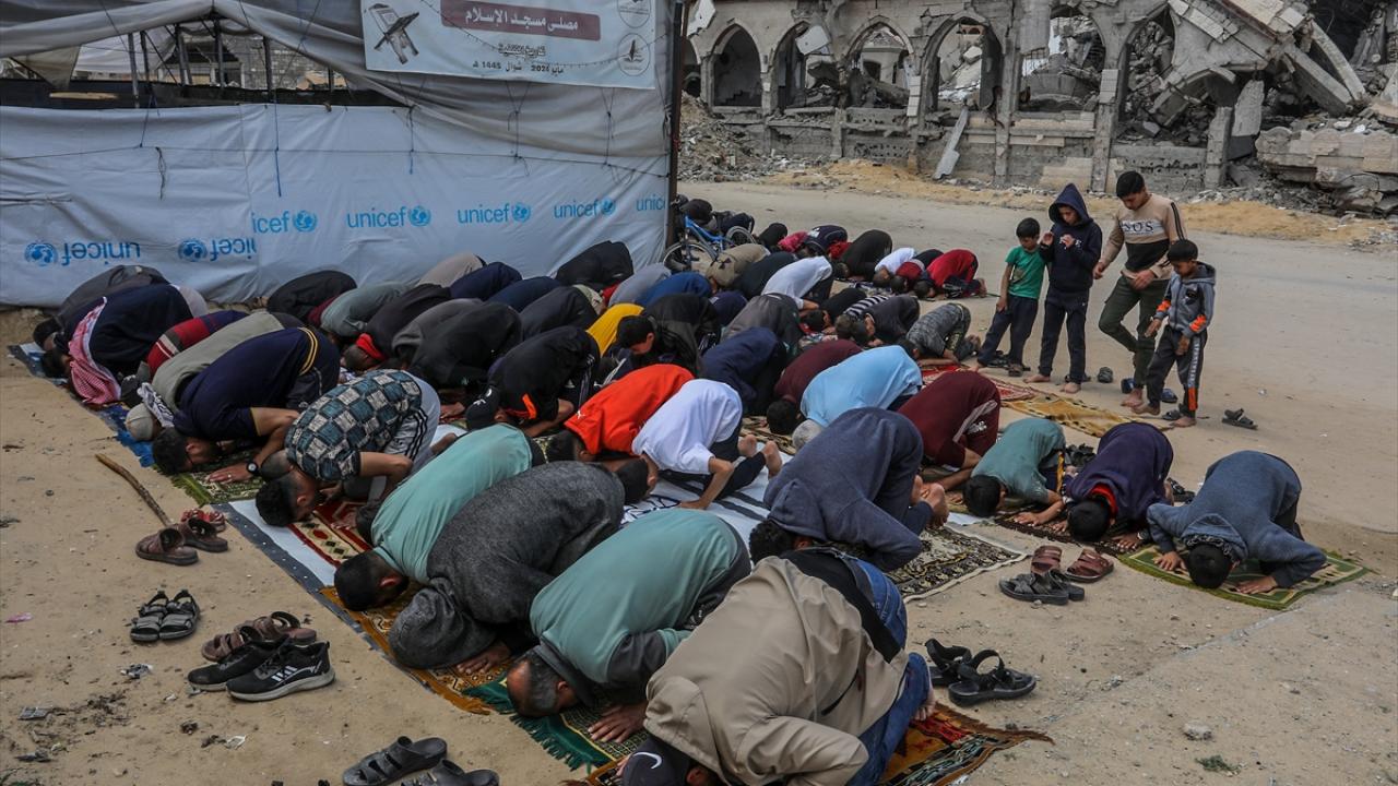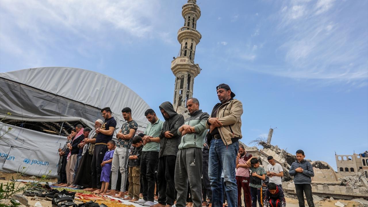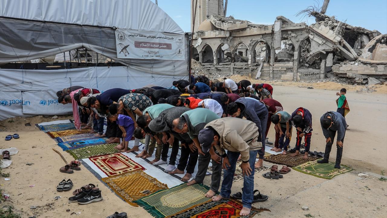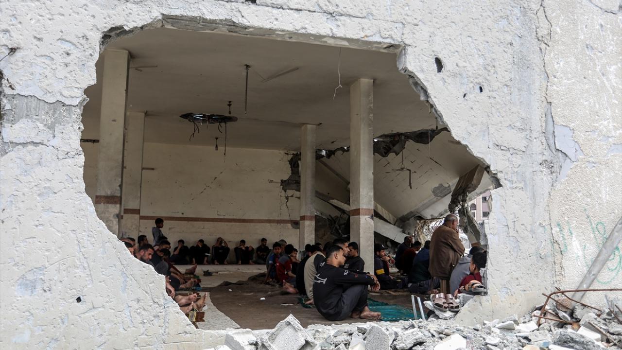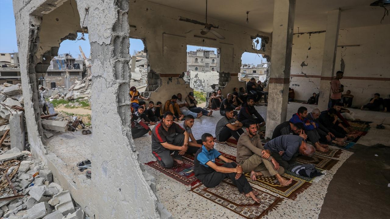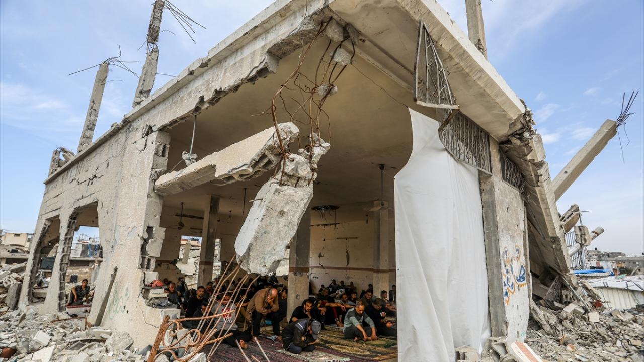 Gazze Şeridi'nin güneyinde yer alan Han Yunus kentindeki Filistinliler, İsrail saldırısında ağır hasar gören Bilal bin Rabah Camii'de ramazan ayının son cuma namazını kıldı.