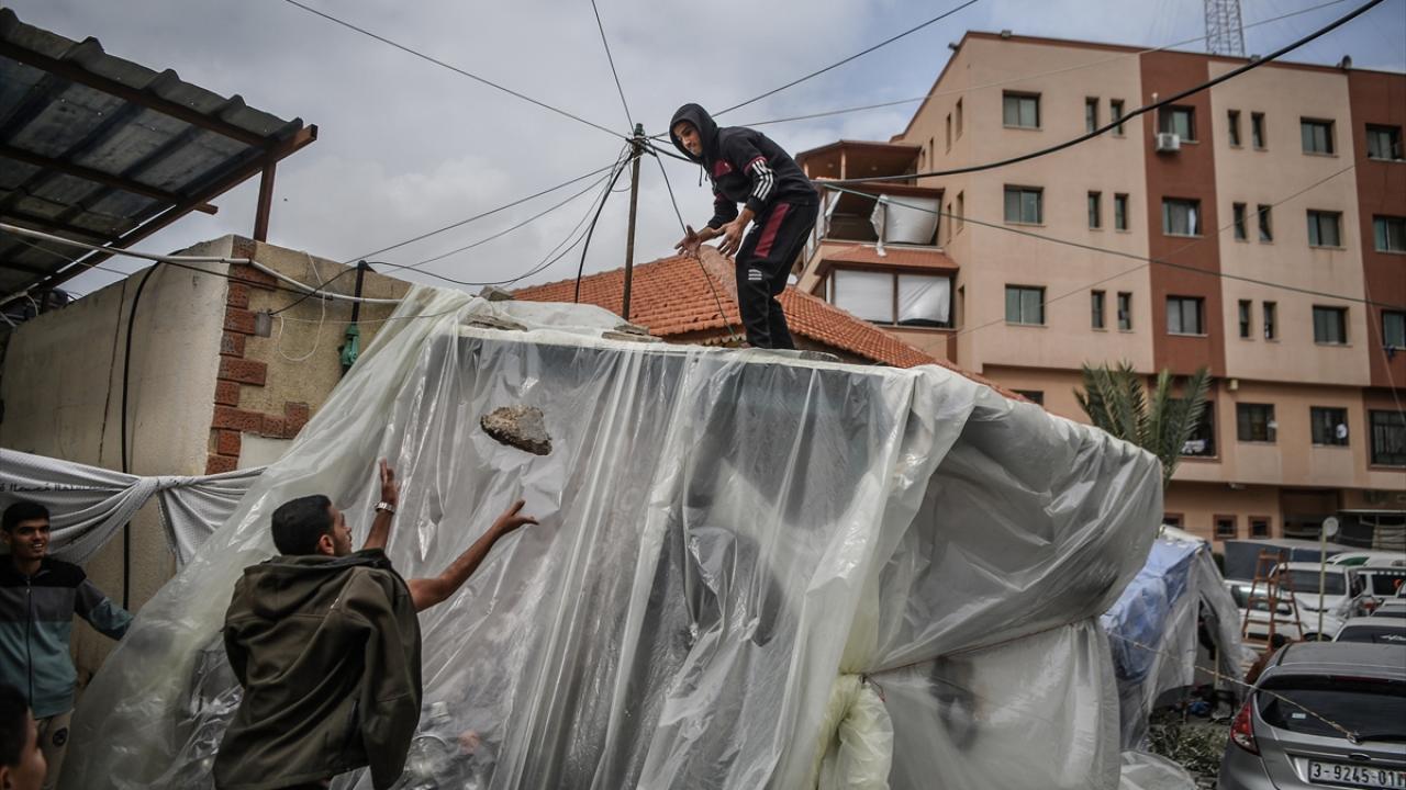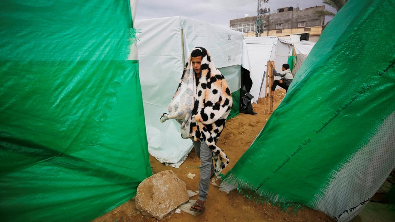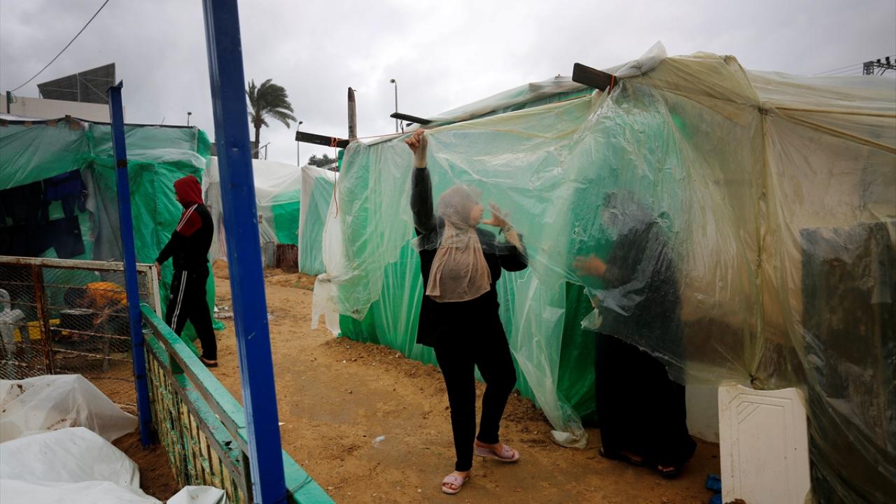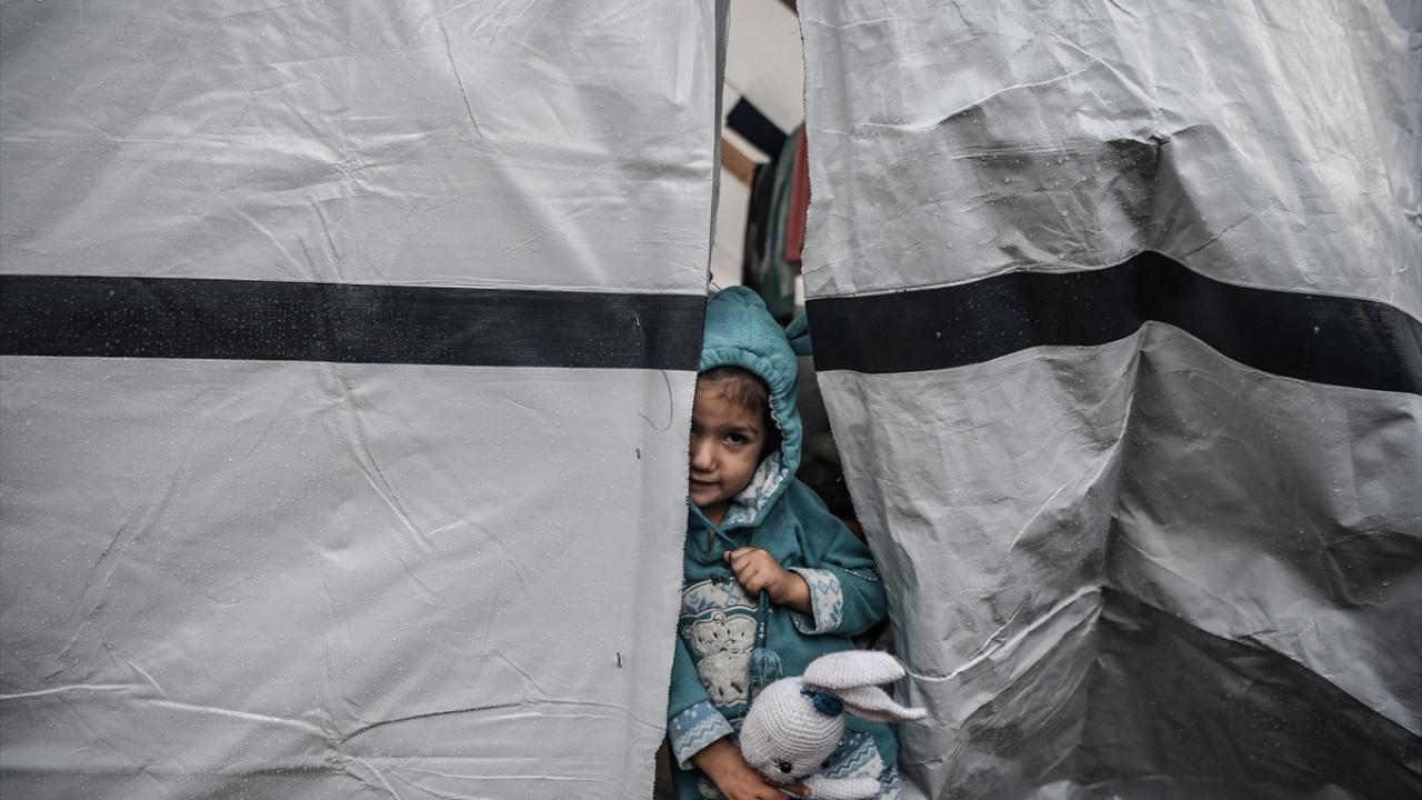 İsrail saldırıları nedeniyle evlerini bırakıp Gazze'nin Han Yunus kentindeki Nasır Hastanesi çevresine göç eden Filistinli aileler, kurdukları derme çatma çadırlarda yağmur ve soğuk havayla mücadele ediyor.