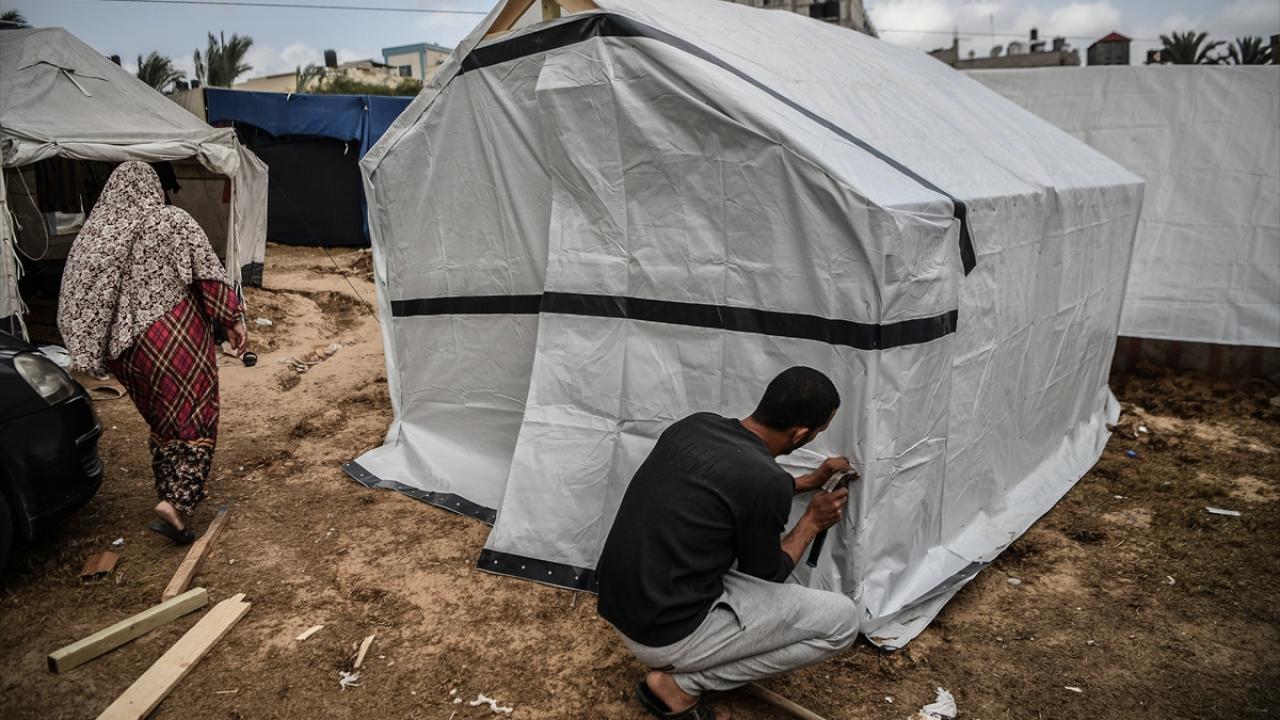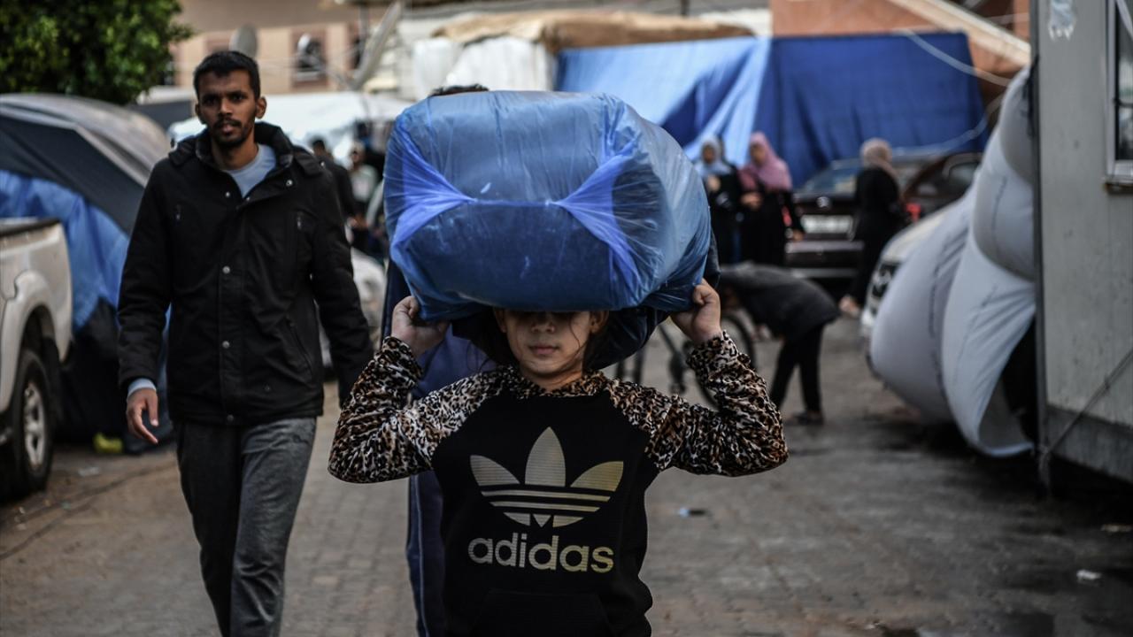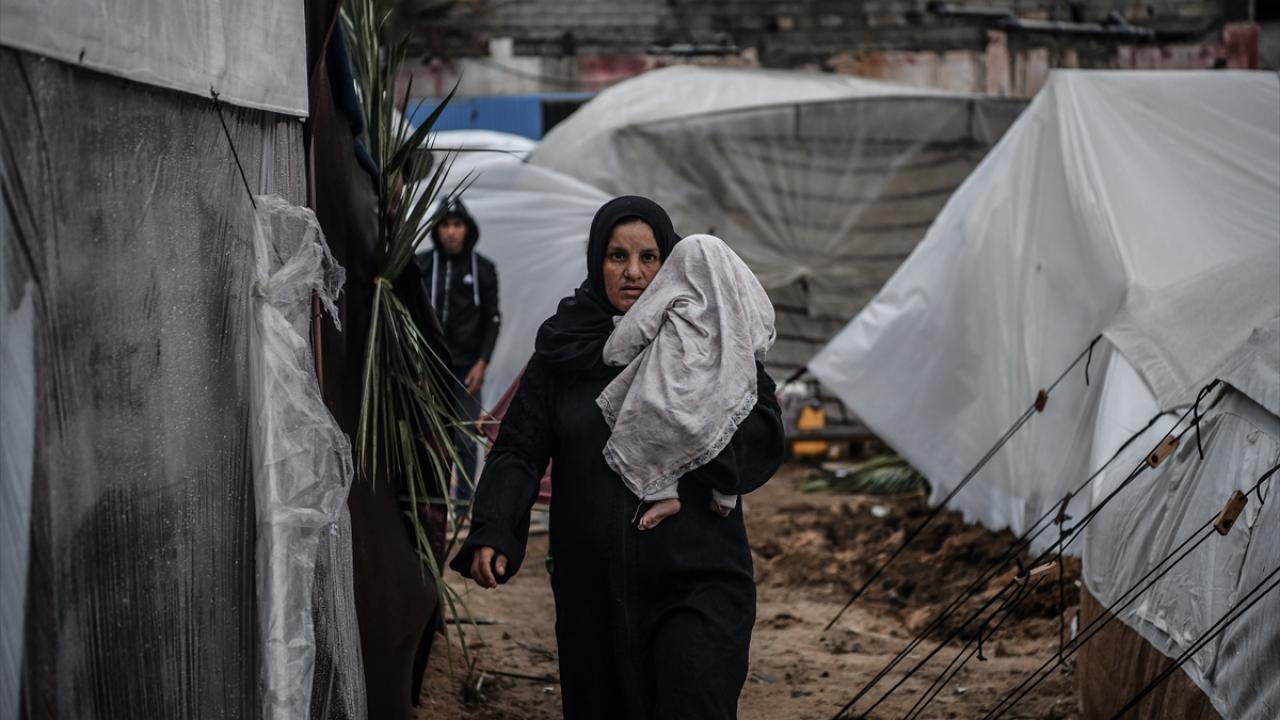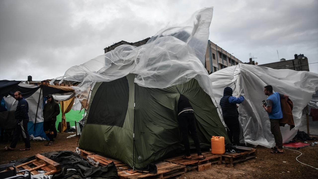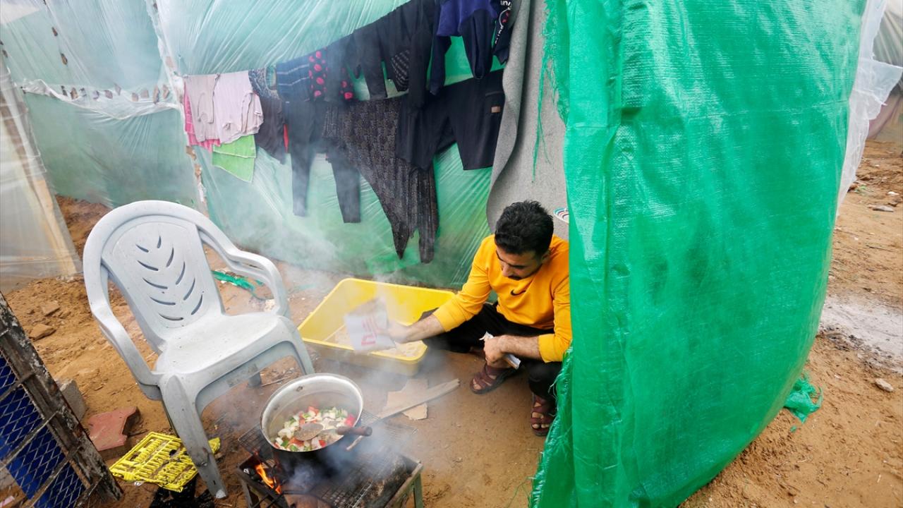 İsrail saldırıları nedeniyle evlerini bırakıp Gazze'nin Han Yunus kentindeki Nasır Hastanesi çevresine göç eden Filistinli aileler, kurdukları derme çatma çadırlarda yağmur ve soğuk havayla mücadele ediyor.