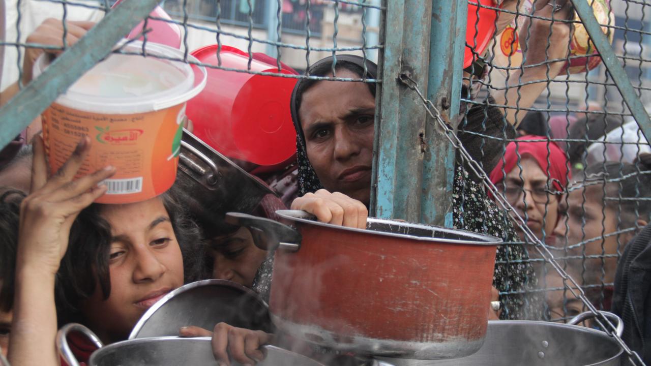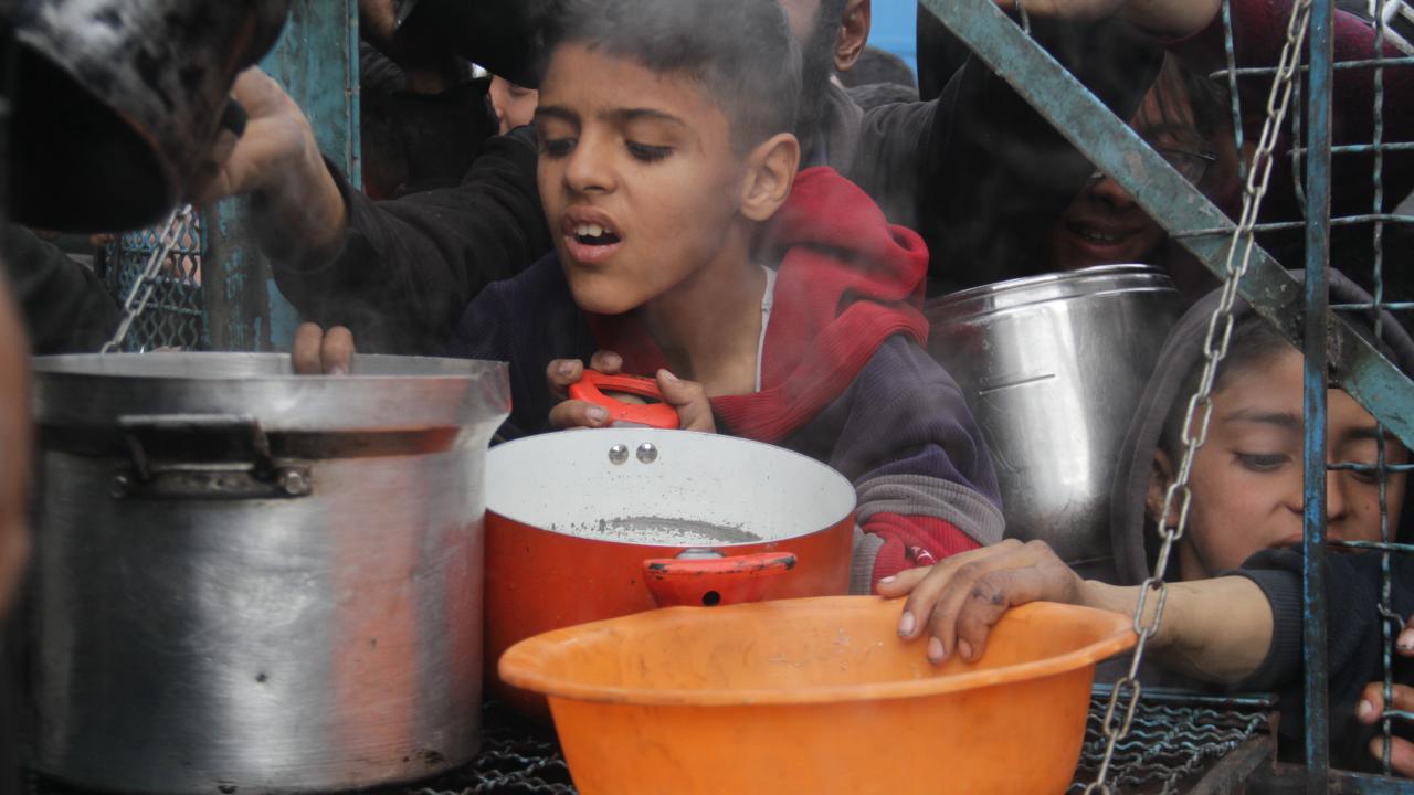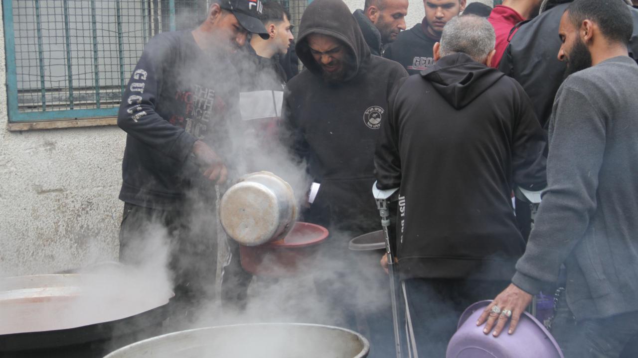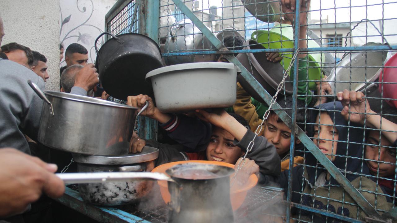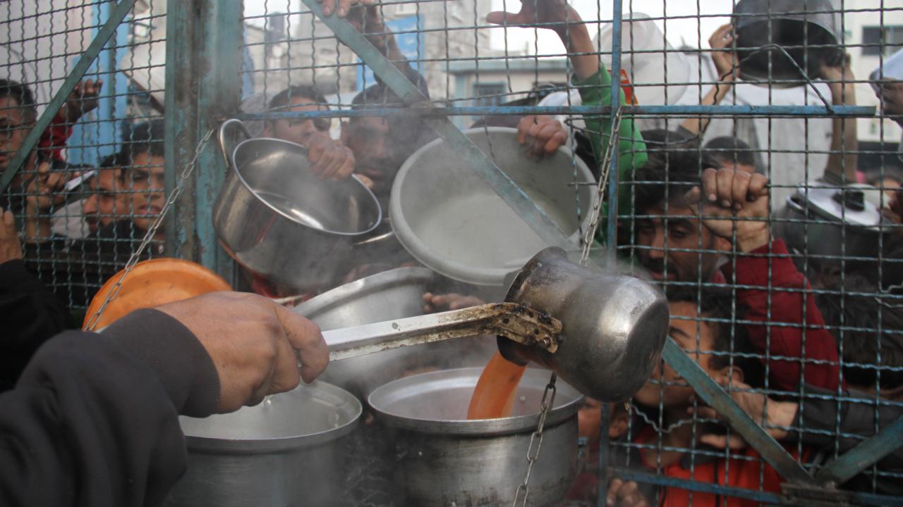 İsrail'in 6 aydır saldırılarını sürdürdüğü Gazze Şeridi'nin kuzeyinde yer alan Cibaliye Mülteci Kampı'na sığınan Filistinliler, yardım kuruluşlarının dağıttığı yemeği almak için kuyruk oluşturdu.
